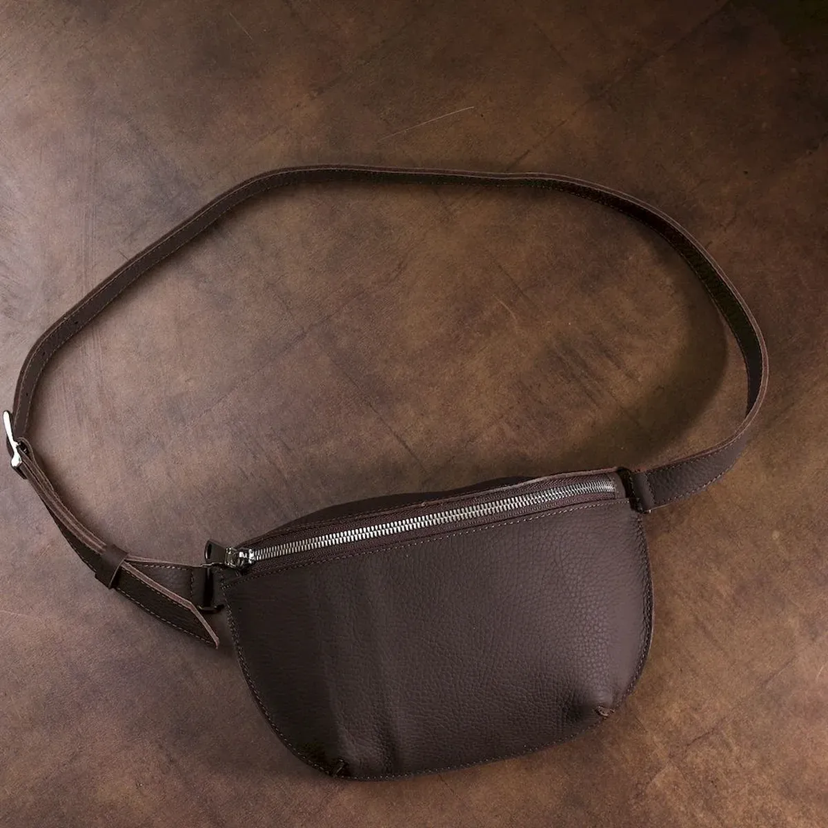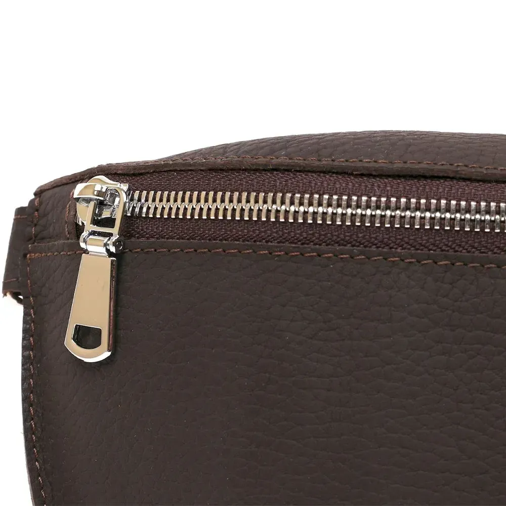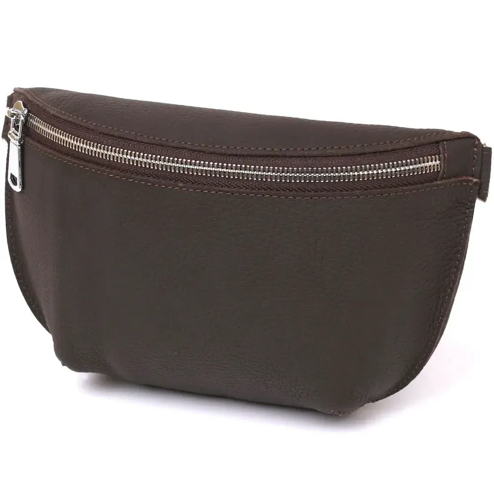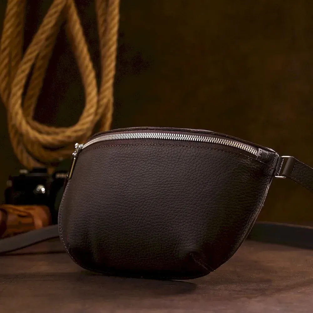Замечательная женская бананка в матовом коричневом цвете, что смотрится очень стильно и красиво. Выполнено изделие из натуральной кожи высокого качества и улучшенными показателями прочности. Фактура – зернистая и очень приятная на ощупь. С такой сумкой можно и в дорогу, и на учебу, и на работу. Ремень регулируется по длине и сделан также из натуральной кожи.