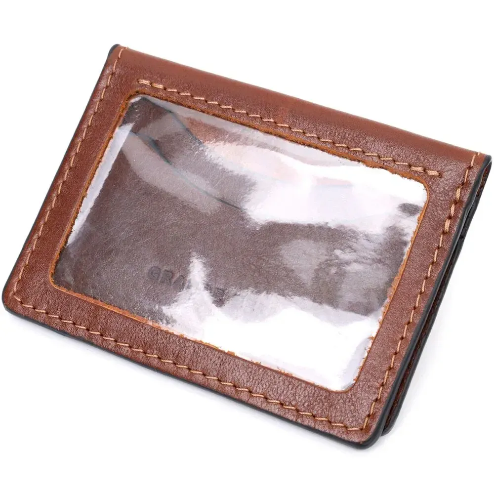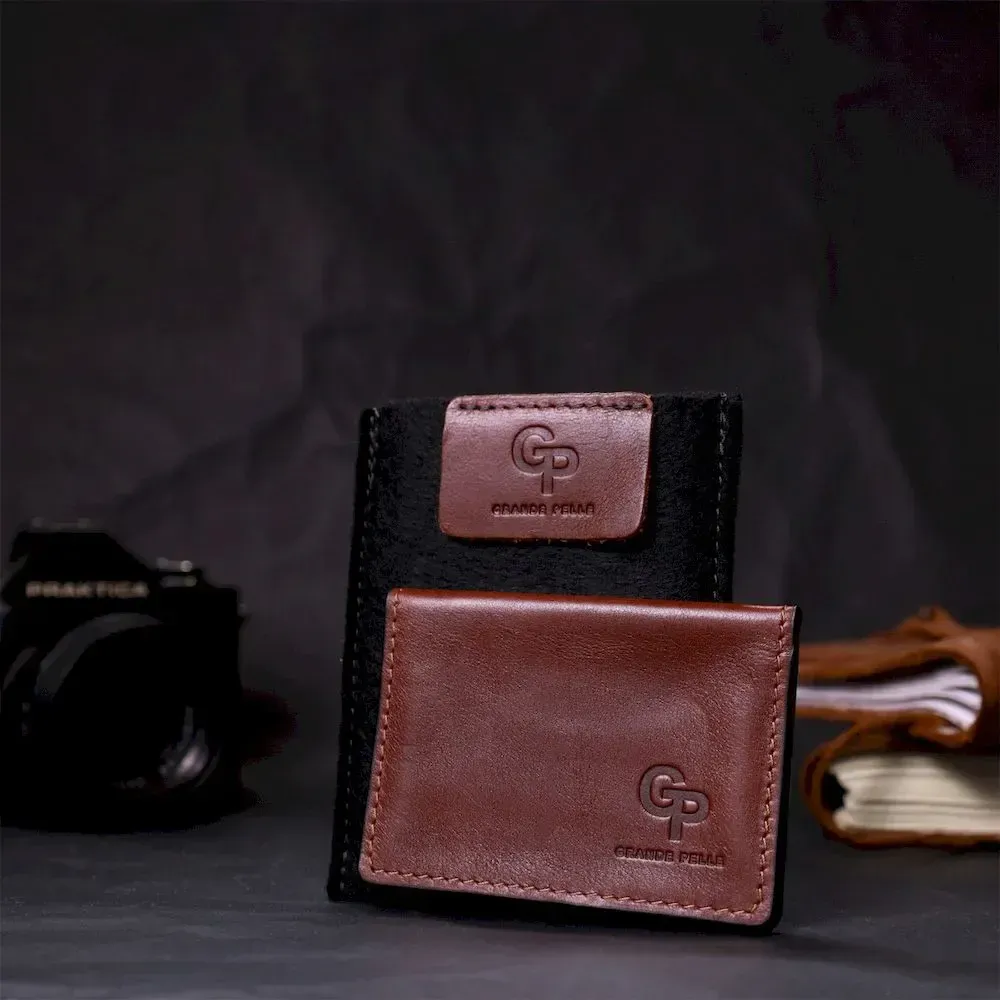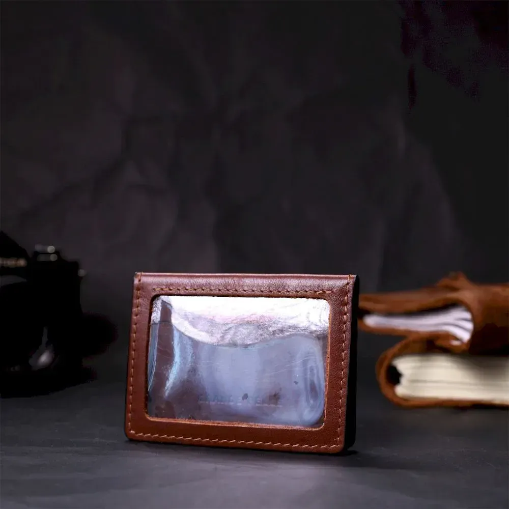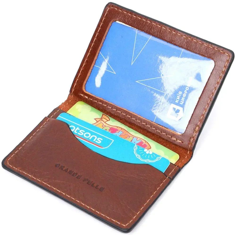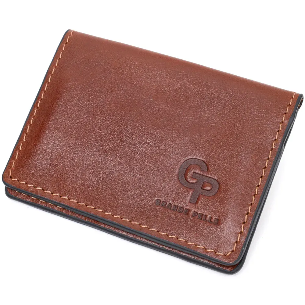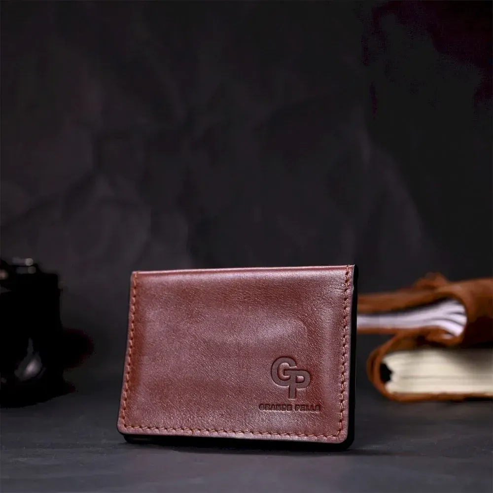 Практичная визитница из качественной натуральной кожи в благородном коричневом цвете. Имеет гладкую и мягкую фактуру. На лицевой стороне изделие имеет тисненый логотип производителя Grande Pelle, а также прошит по краю ровной строчкой под цвет изделия. Аксессуар состоит из двух слотов под карточки и одного прозрачного кармана. Благодаря компактным размерам аксессуара он отлично помещается в кошелек, карман или сумку любого размера. Отличный аксессуар для современного человека. Упаковка представлена в виде фирменного чехла.