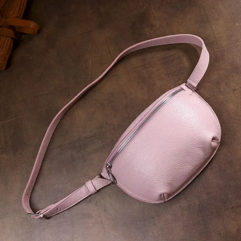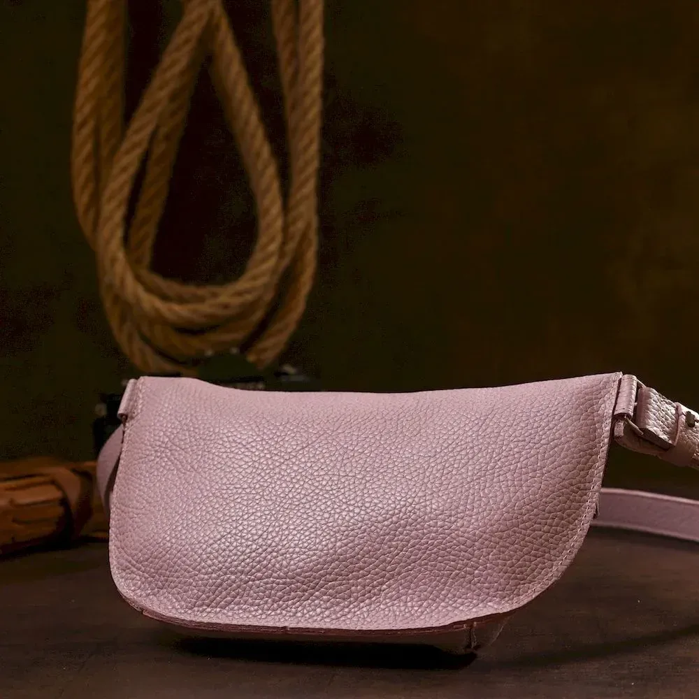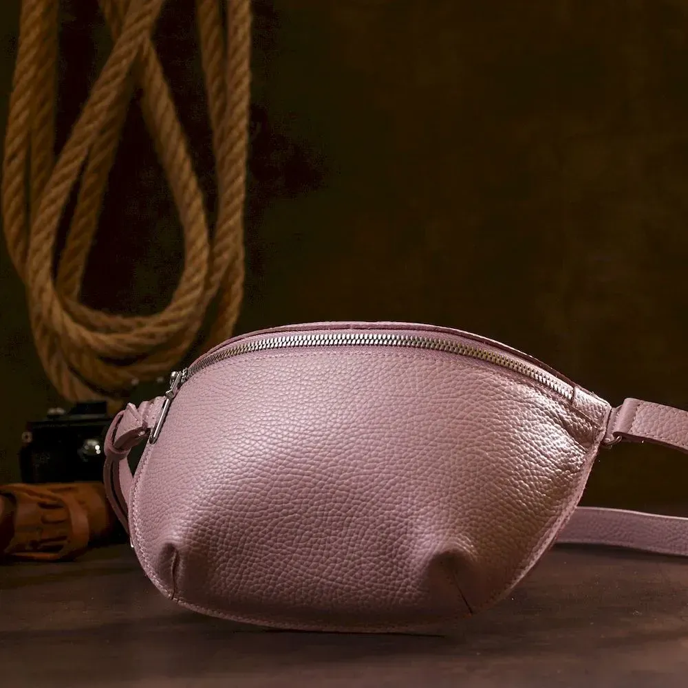 Практичная женская сумка на пояс в строгом и аккуратном дизайне. Материал изготовления – натуральная высококлассная кожа с повышенной прочностью и стойкостью к износу. Цвет изделия – нежно-лиловый, фактура – зернистая и очень приятная на ощупь, фурнитура сделана в цвете под серебро. Ремень с легкость можно отрегулировать согласно Ваших параметров.