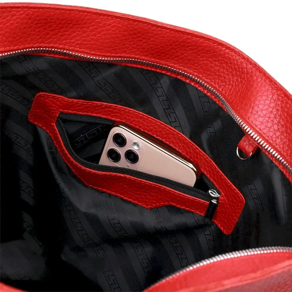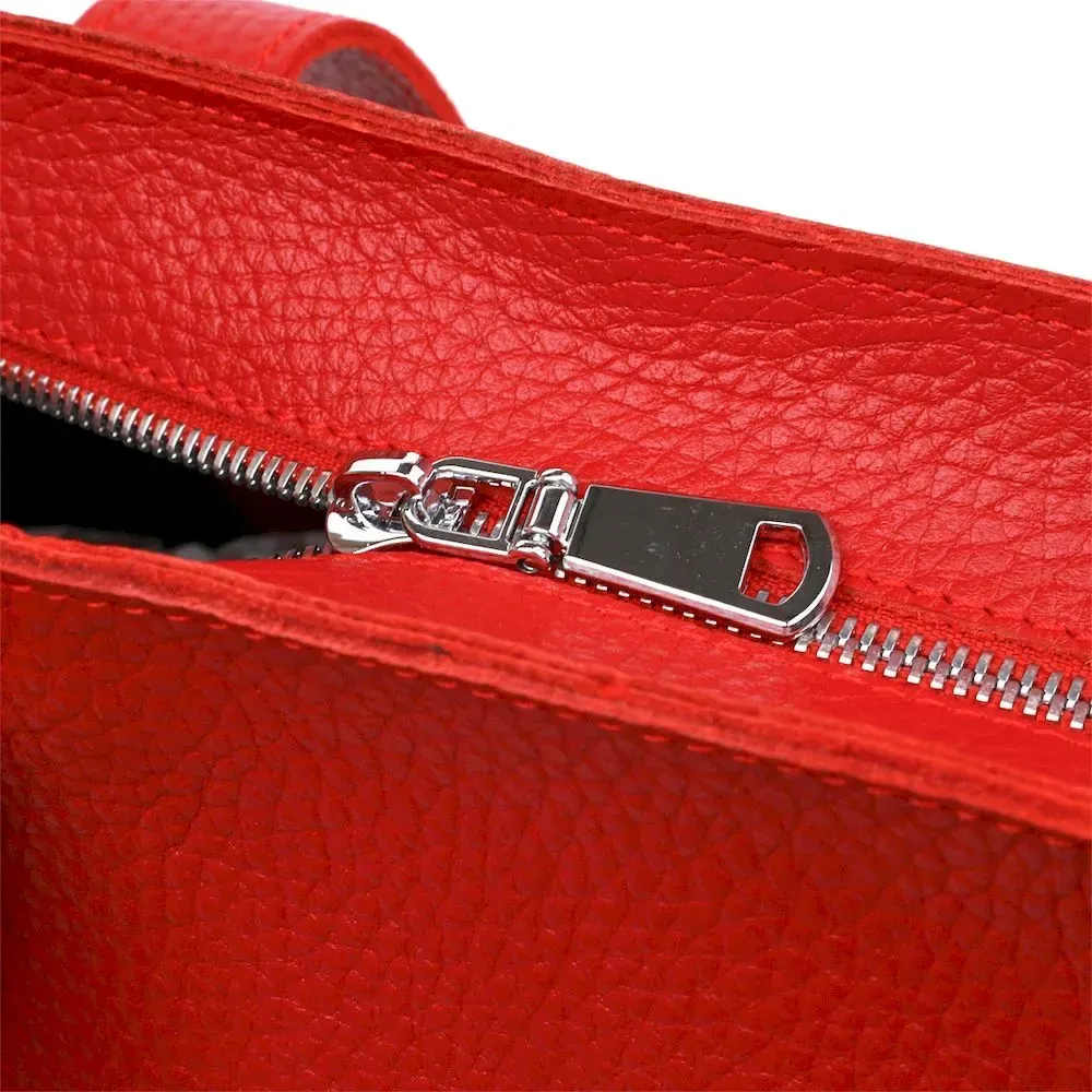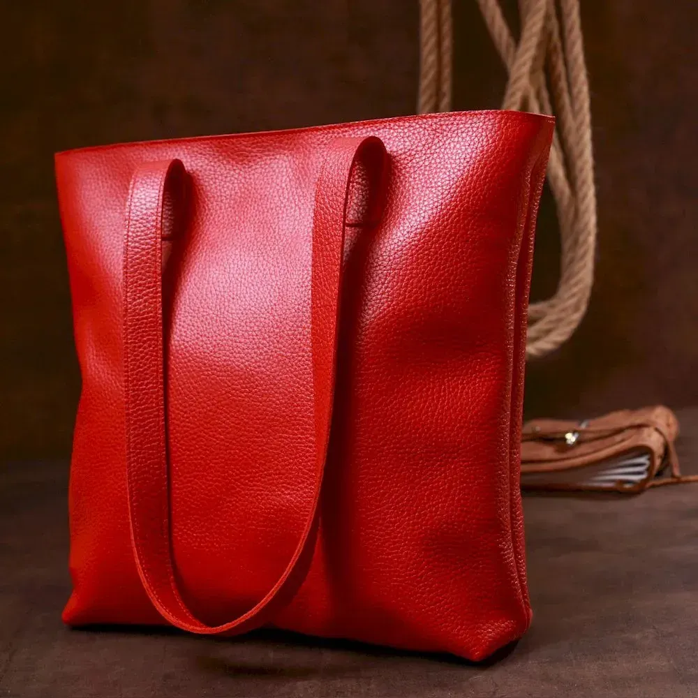 Современная женская сумка для любительниц шоппинга или просто вместительных аксессуаров. Материал изготовления – натуральная кожа высокого качества с отменными эксплуатационными характеристиками. Цвет изделия – насыщенный красный, что смотрится очень женственно, фактура – зернистая. Внутреннее наполнение представлено в виде просторного основного отделения на молнии.