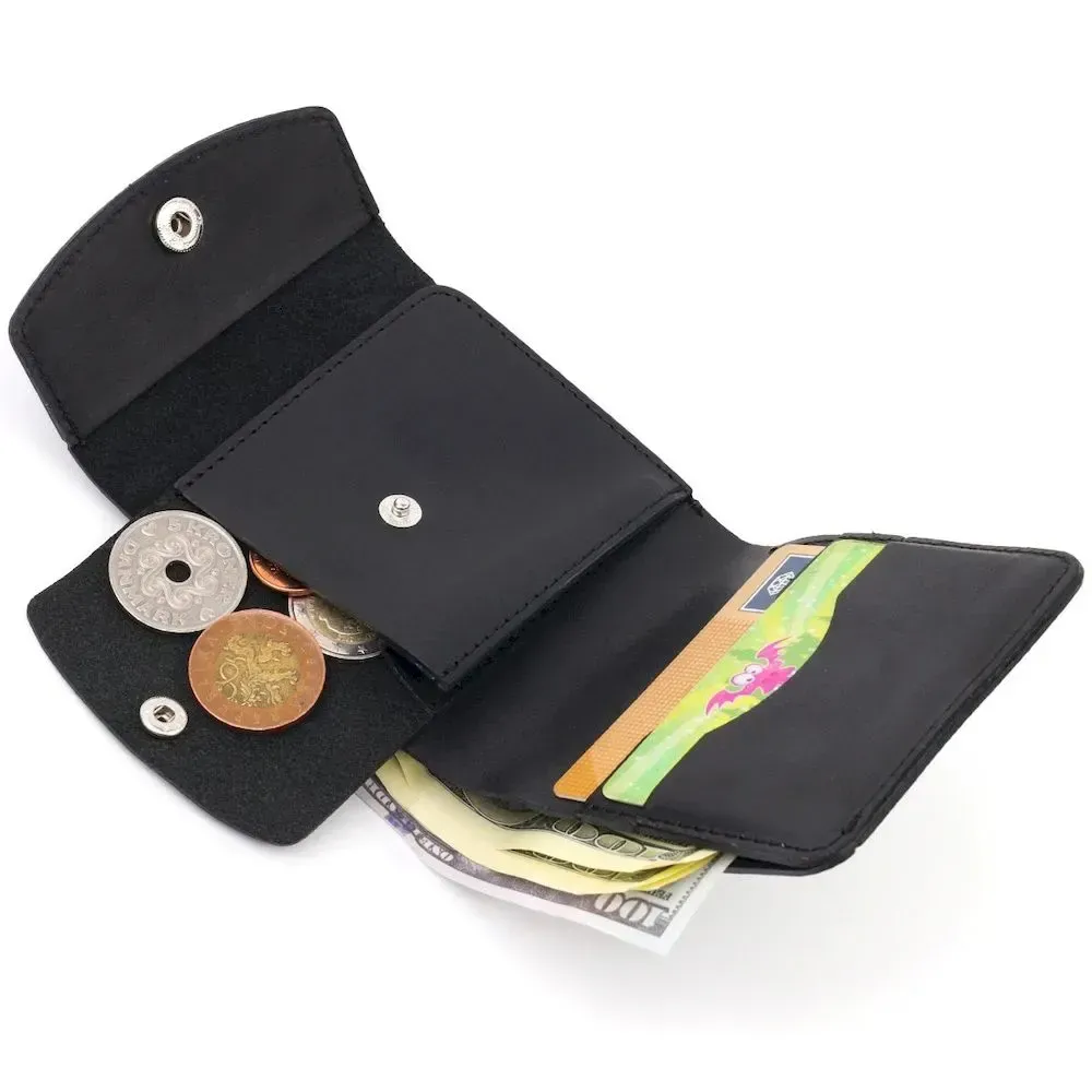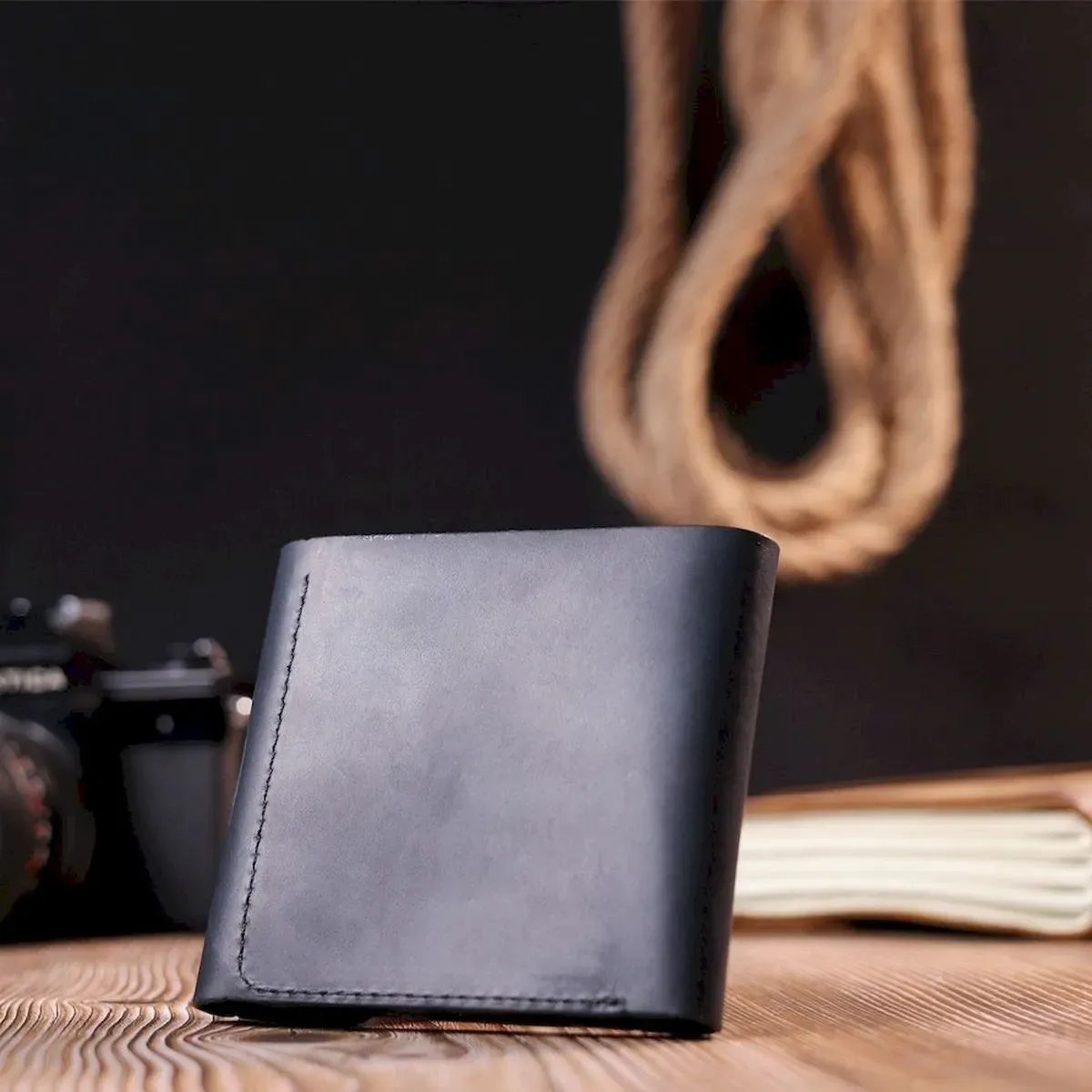 Стильное матовое портмоне в два сложения, в трендовом черном цвете. Аксессуар выполнен из сверхкачественной винтажной натуральной кожи. Лицевая сторона изделия украшена логотипом компании производителя. Портмоне имеет вместительное отделение для купюр, слоты для пластиковых карточек и монетницу. Закрывается аксессуар на кнопку. Если вы подыскиваете подарок для близкого человека, то данная модель отлично для этого подойдет.