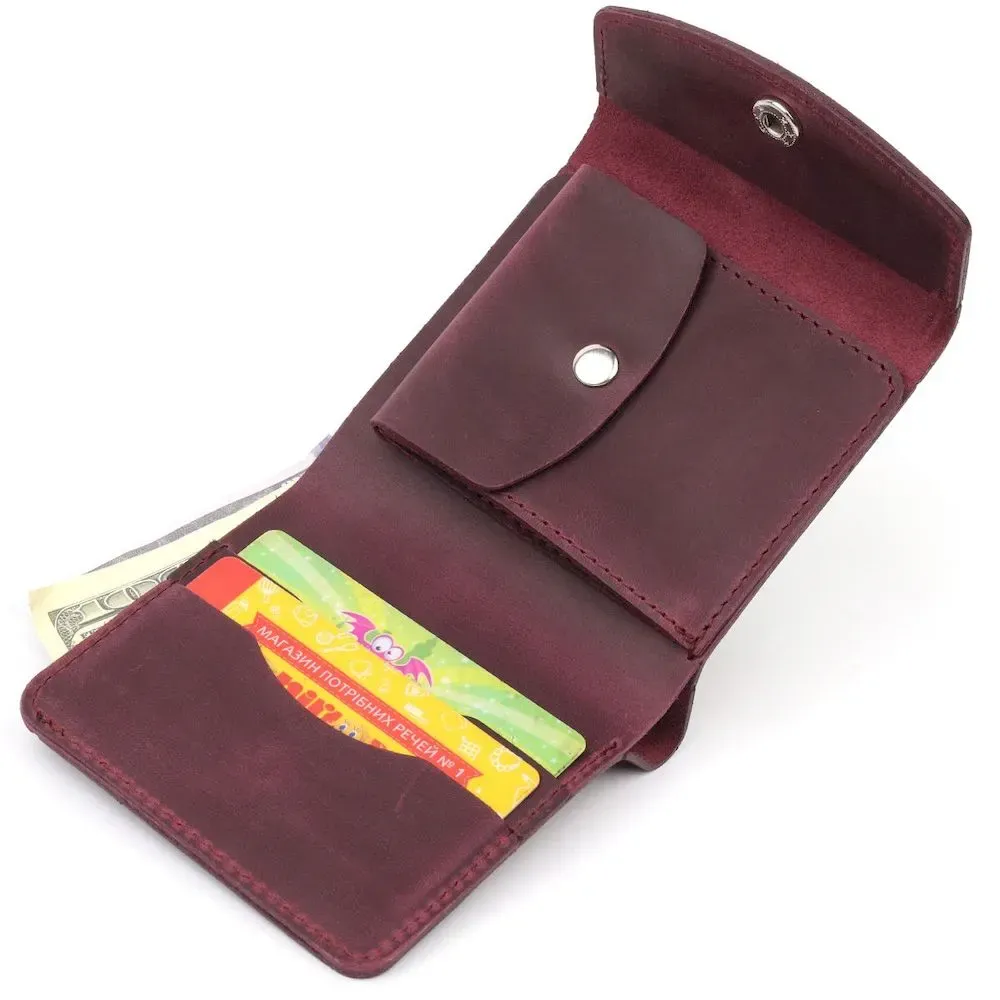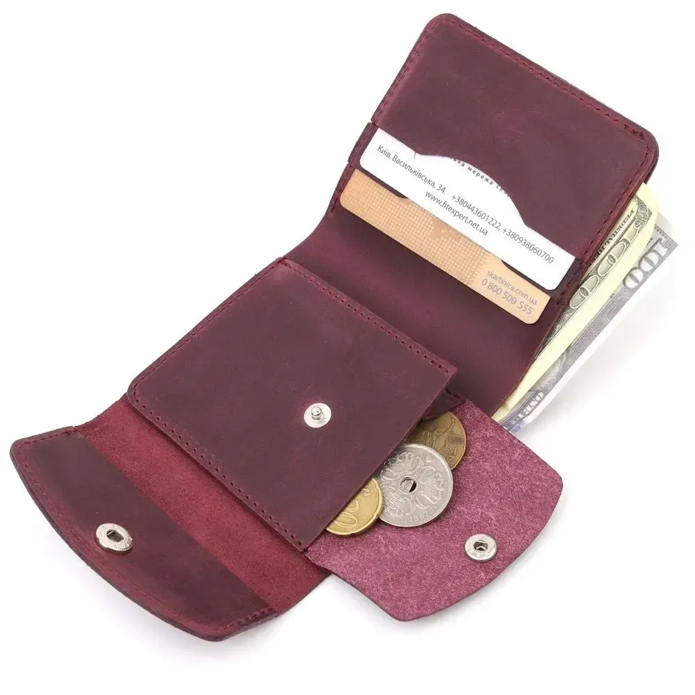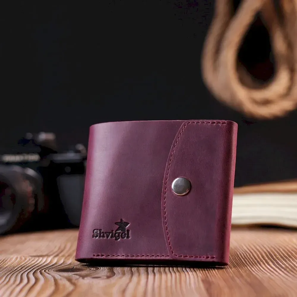 Необычный компактний кошелек бордовогого цвета, маленького размера, который легко поместится даже в самую маленькую сумочку. Аксессуар не займет много места и не имеет лишнего веса. Закрывается кошелек хлястиком с кнопкой. Снаружи и внутри изделие изготовлено из натуральной кожи. На лицевой стороне кошелек украшен тисненым логотипом Shvigel. Добротная винтажная кожа прослужит вам очень долго.