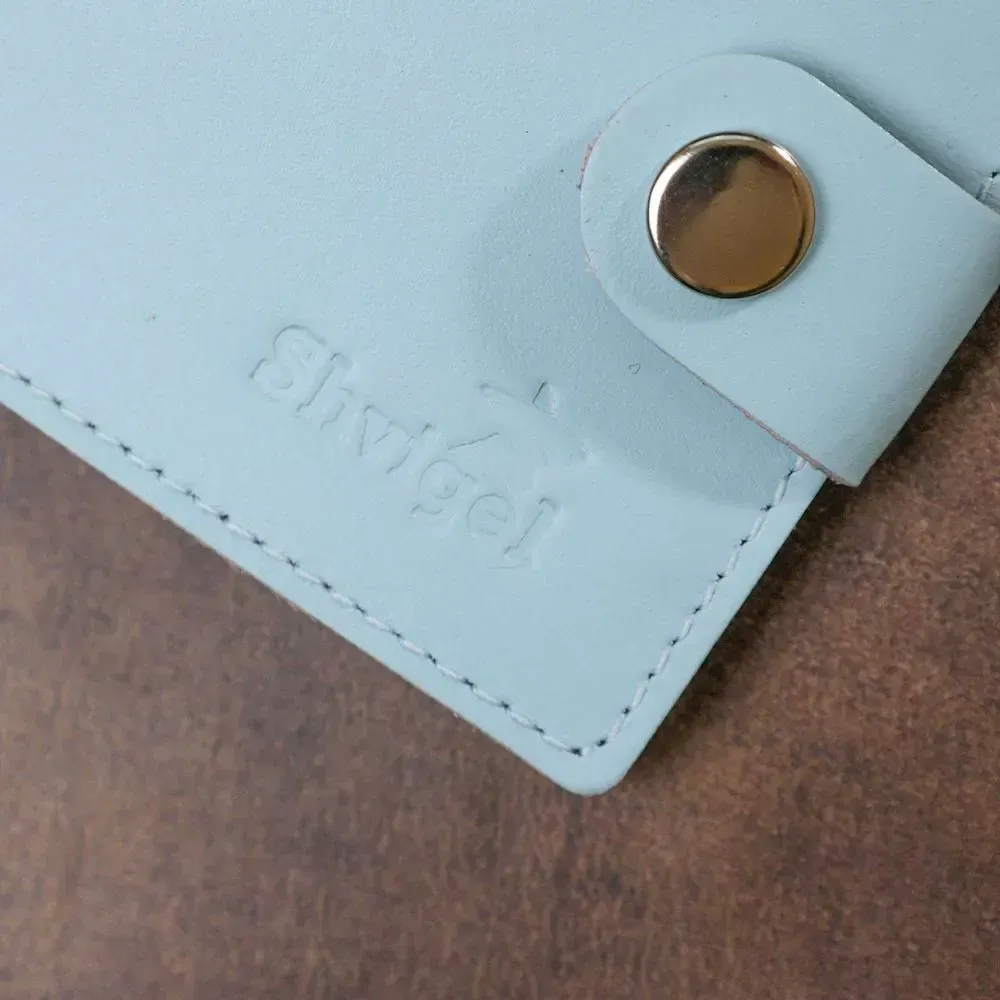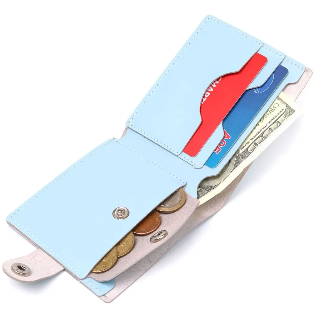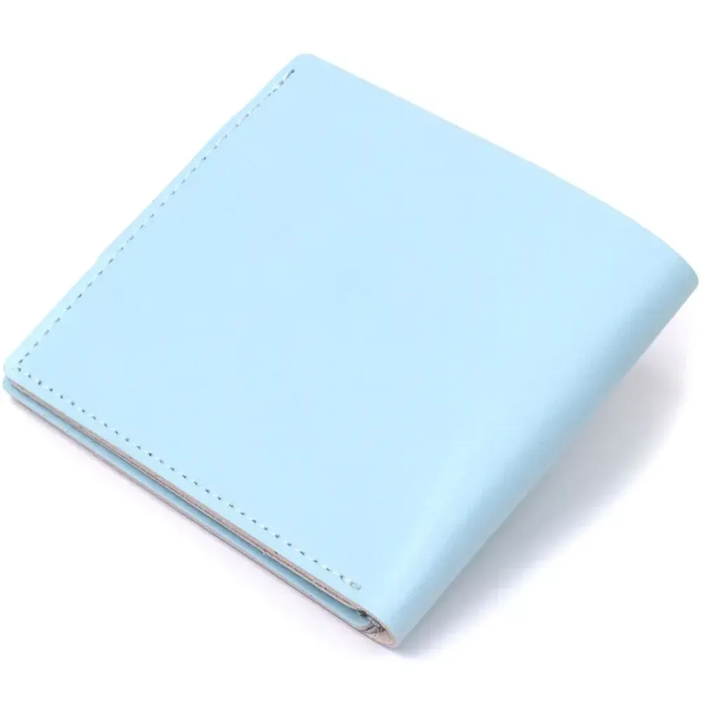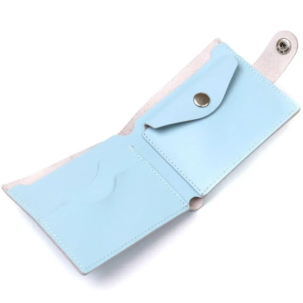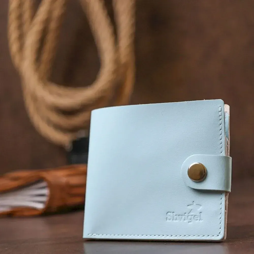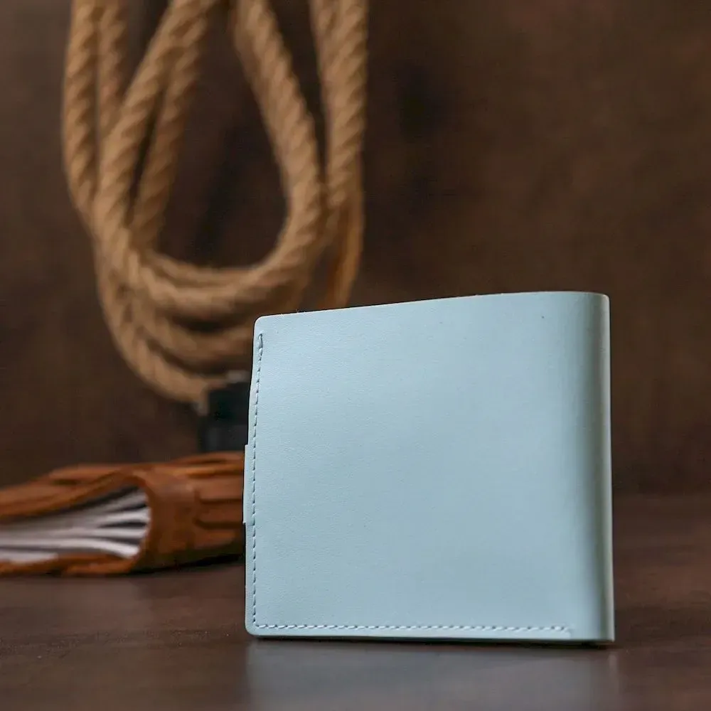 Женское небольшое портмоне нежном голубом цвете и в гладкой фактуре, которая очень приятная на ощупь. Выполнено изделие из натуральной высококачественной кожи с повышенной износоустойчивостью. Внутри есть просторное отделение для купюр, слоты для визитных и кредитных карточек и монетница на кнопке. Такое портмоне станет отличным подарком на любой праздник.