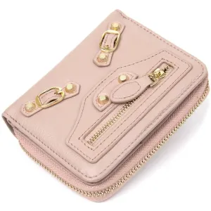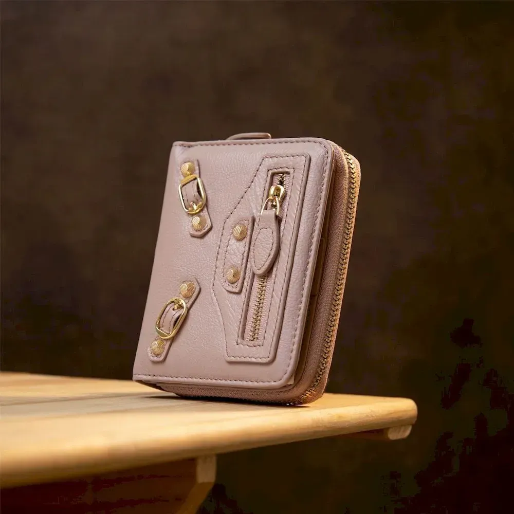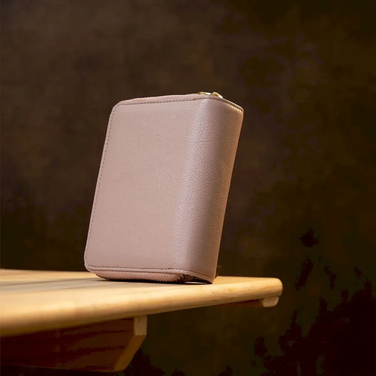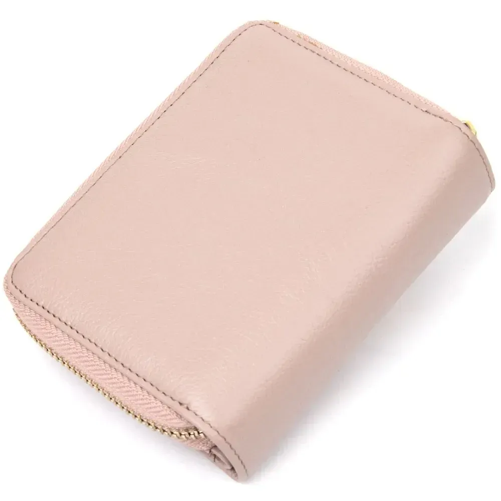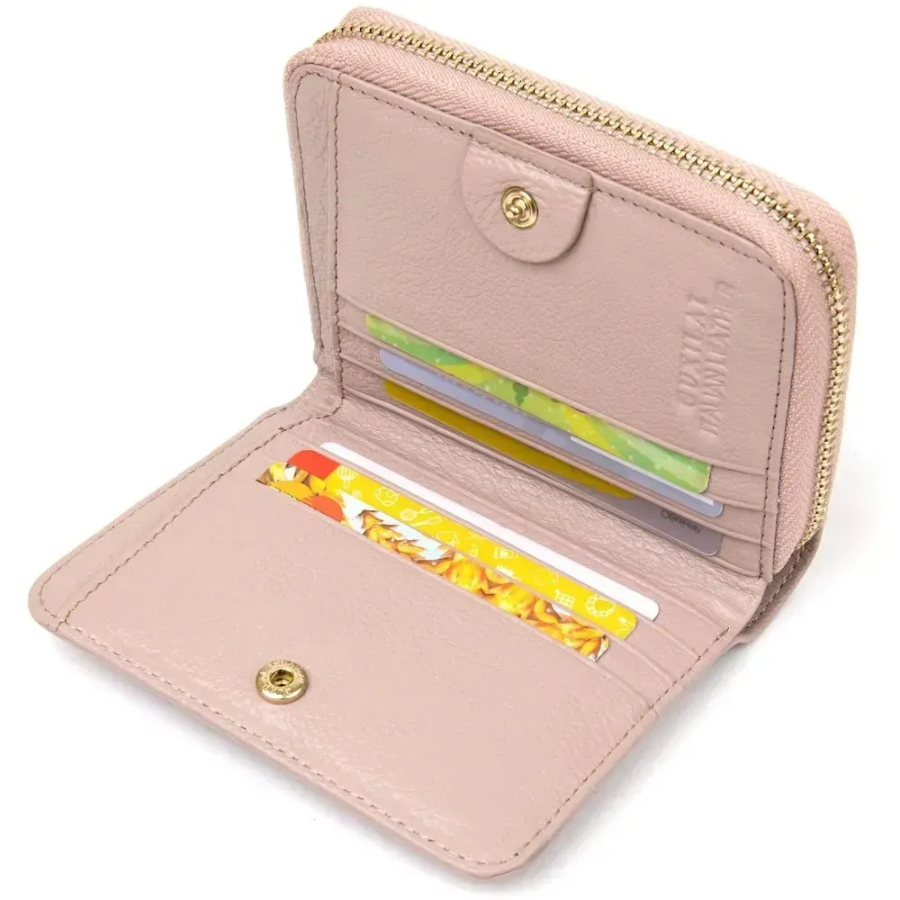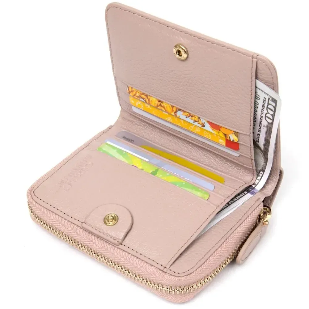 Симпатичный женский кошелек из натуральной кожи в нежном розовом цвете с сиреневым оттенком. Изготовлено изделие из натуральной кожи высокого качества в матовом покрытии. Фурнитура под золото, что смотрится очень красиво. Внутри есть вместительные отделения и карманы для пластиковых карточек. На лицевой внешней стороне присутствуют оригинальные защелки и кармашек на молнии.