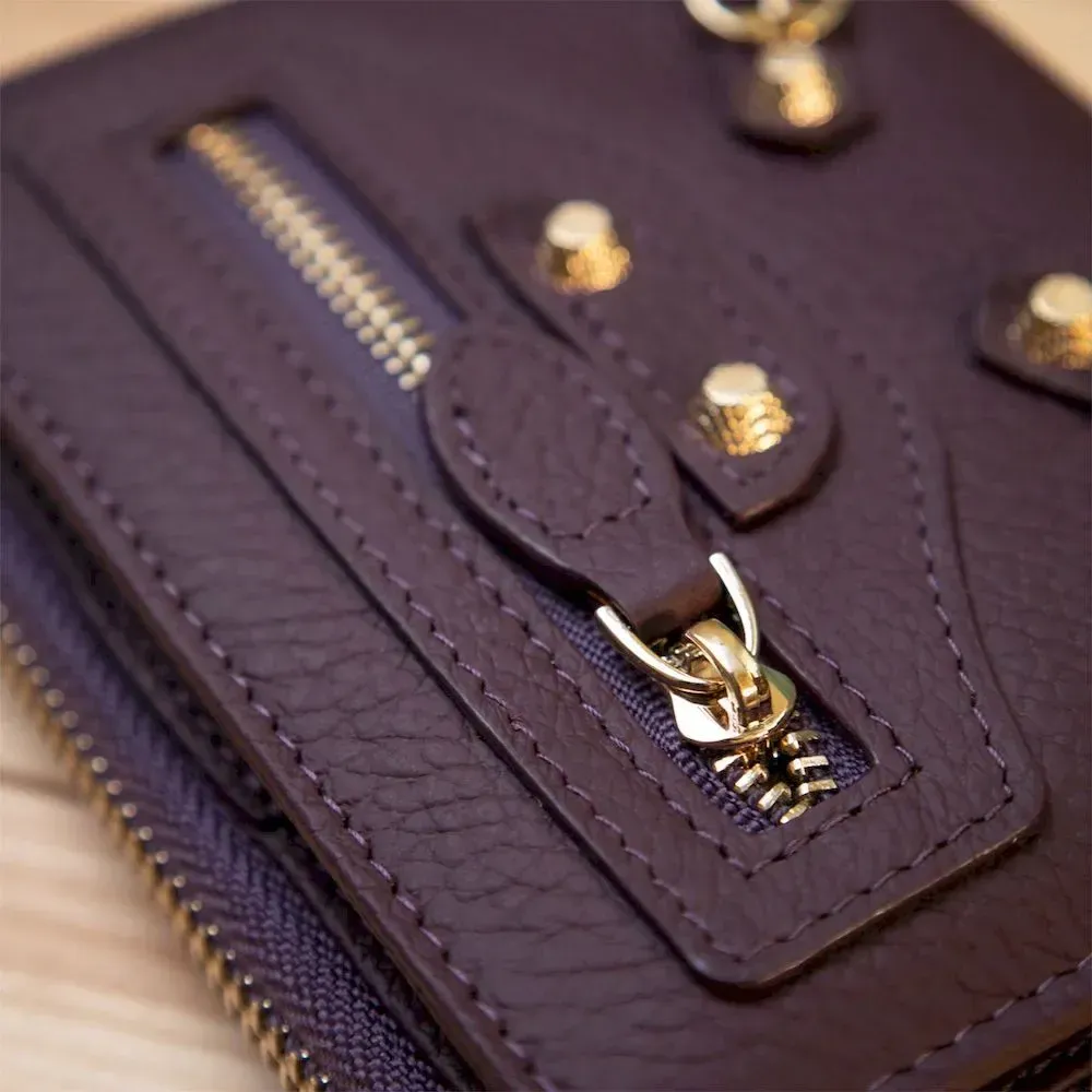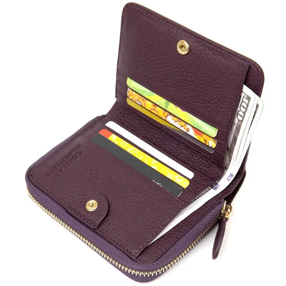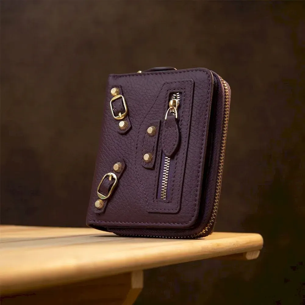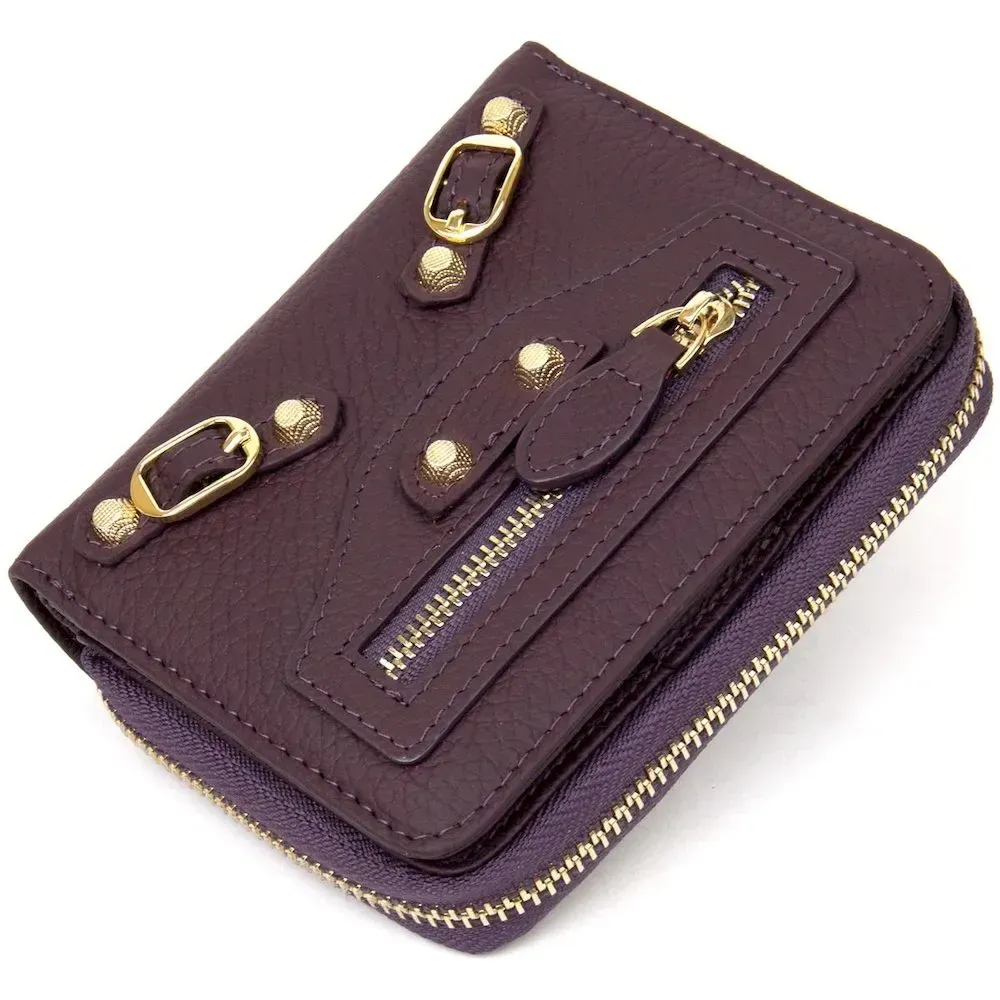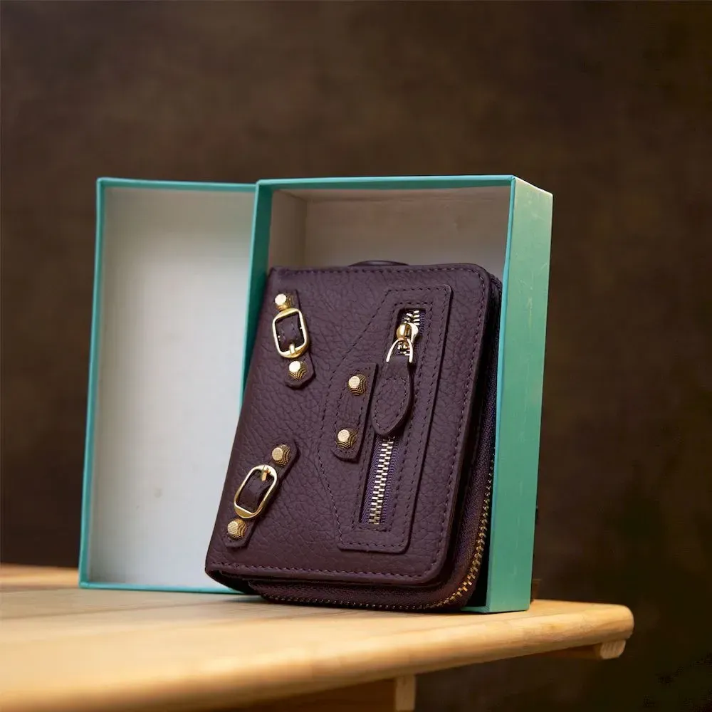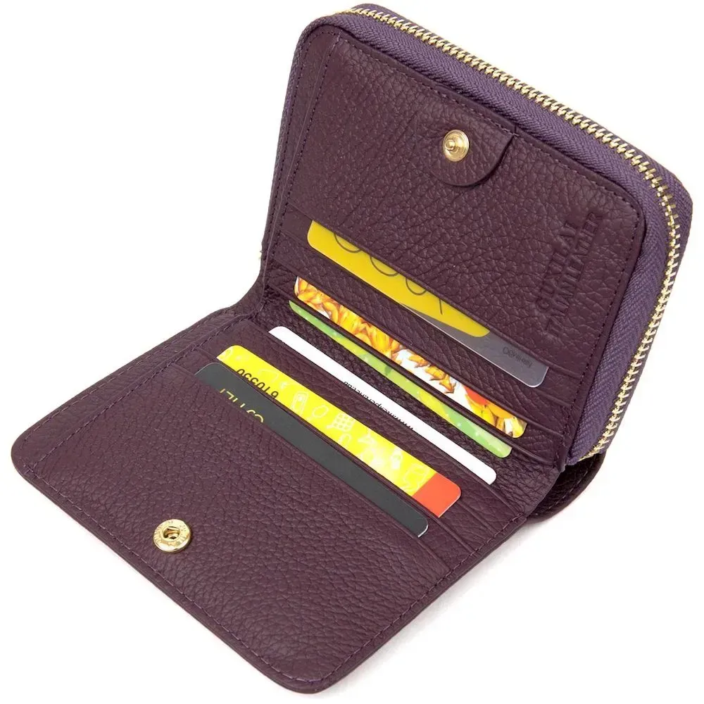 Женский кожаный кошелек в интересном непосредственном дизайне. Выполнен из натуральной итальянской кожи. Внутреннее наполнение представлено в виде отделения для купюр, монет и слотов для пластиковых карточек. На передней внешней стороне присутствует маленький карман на молнии. Фурнитура кошелька имеет красивый золотой цвет. Данная модель станет отличным подарком на любой праздник.