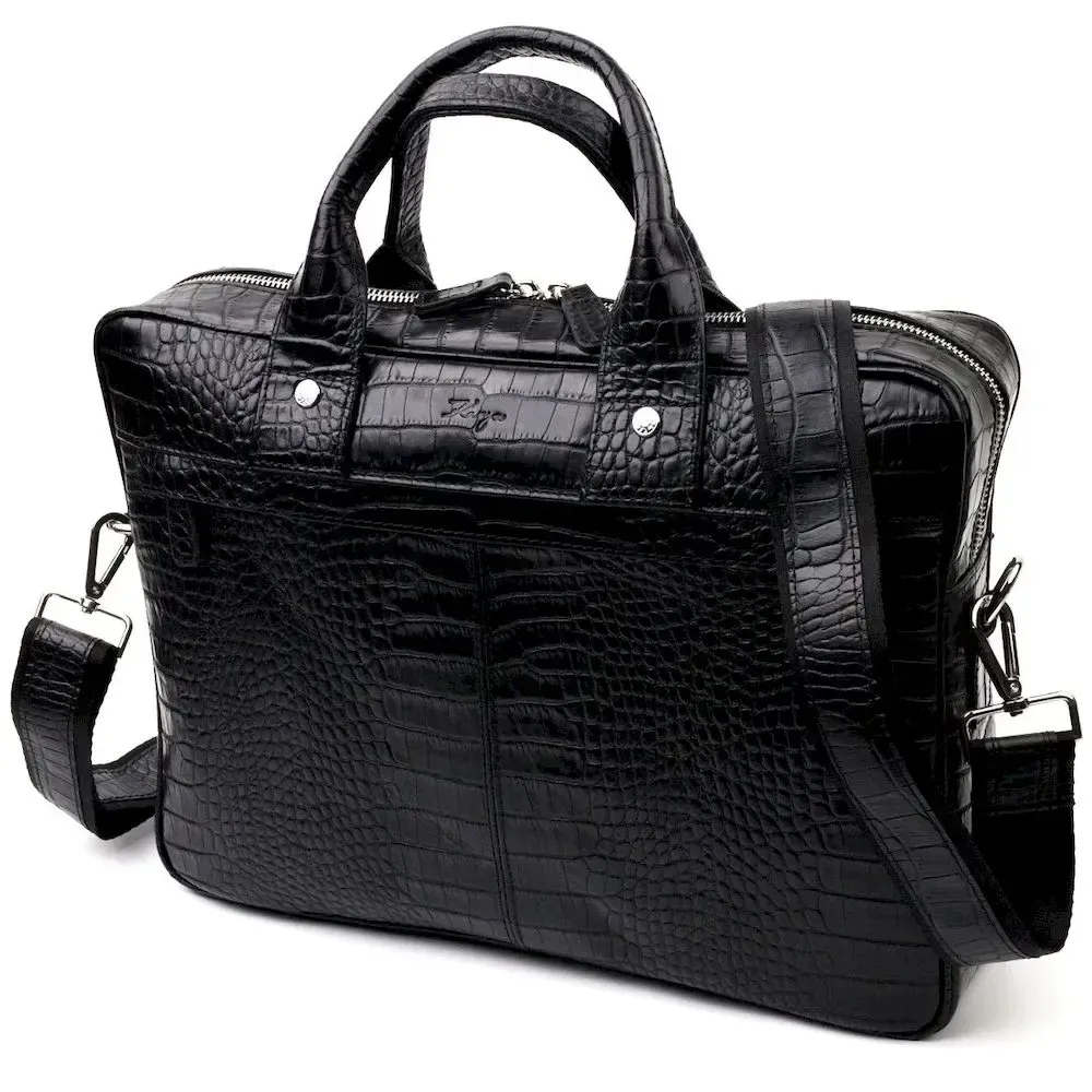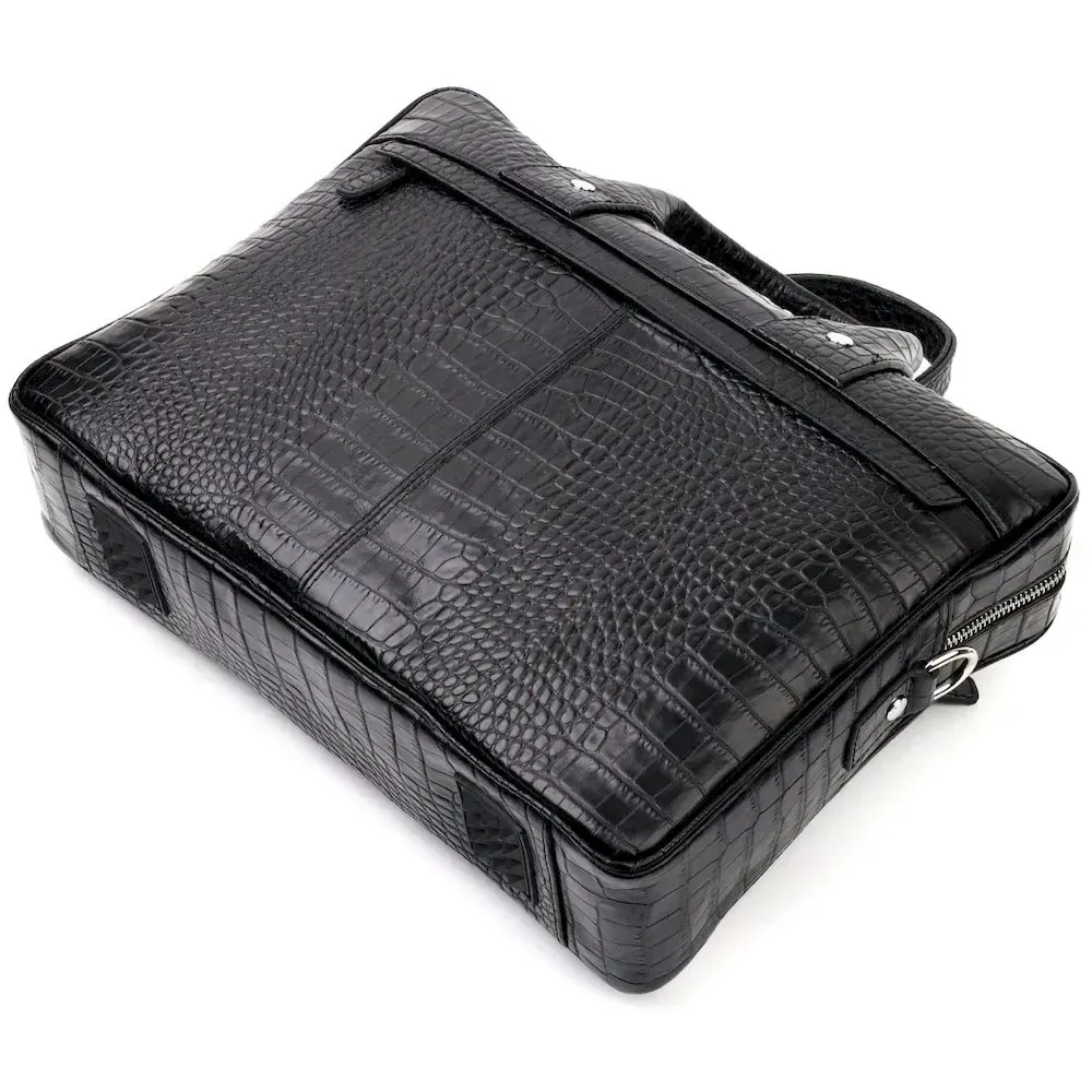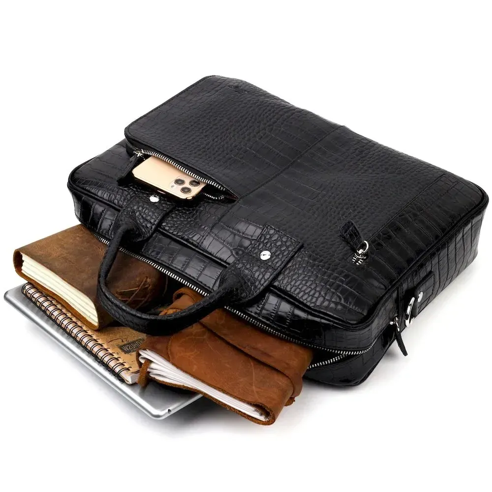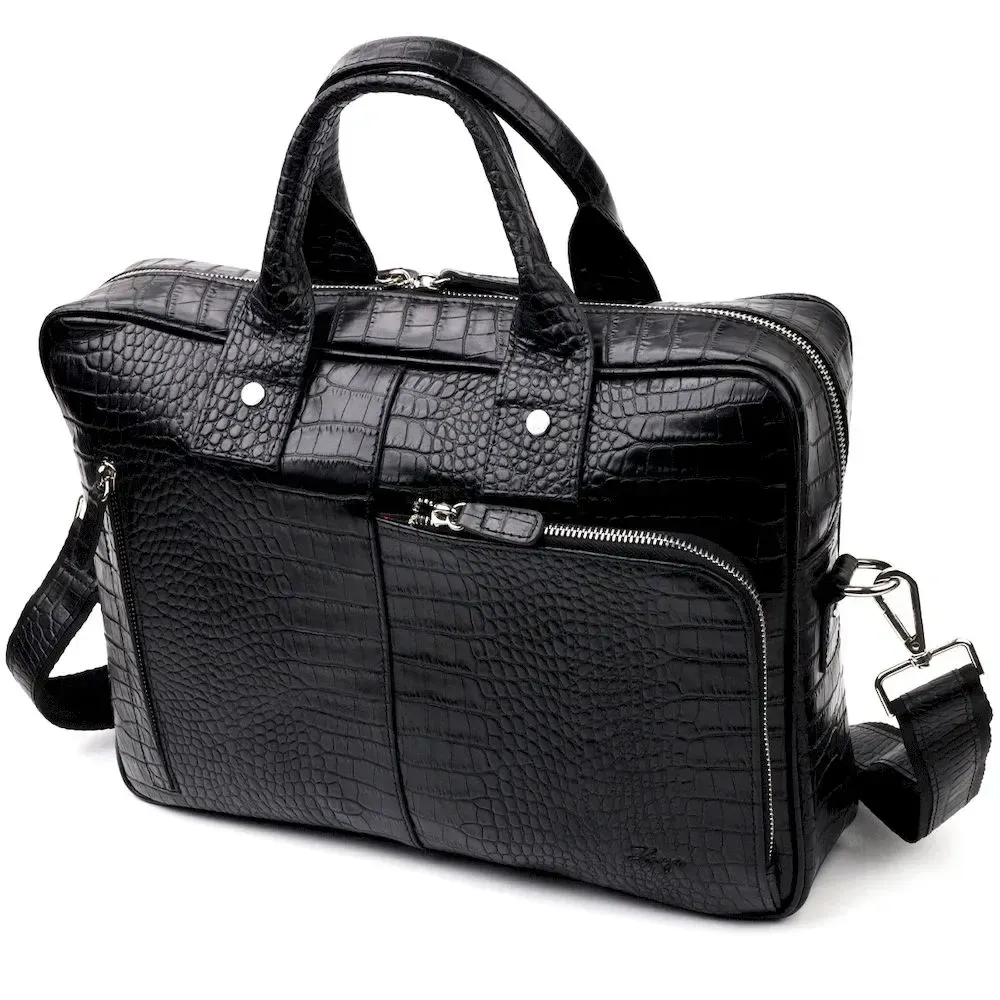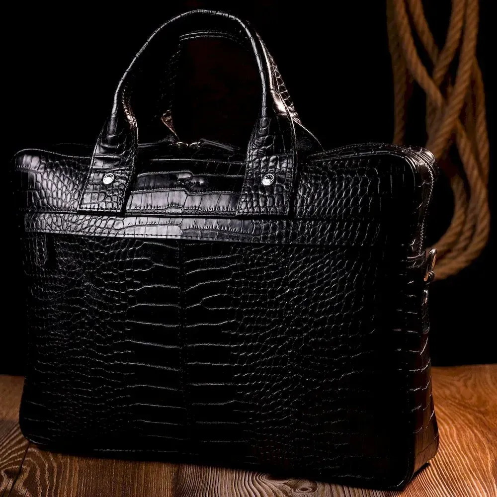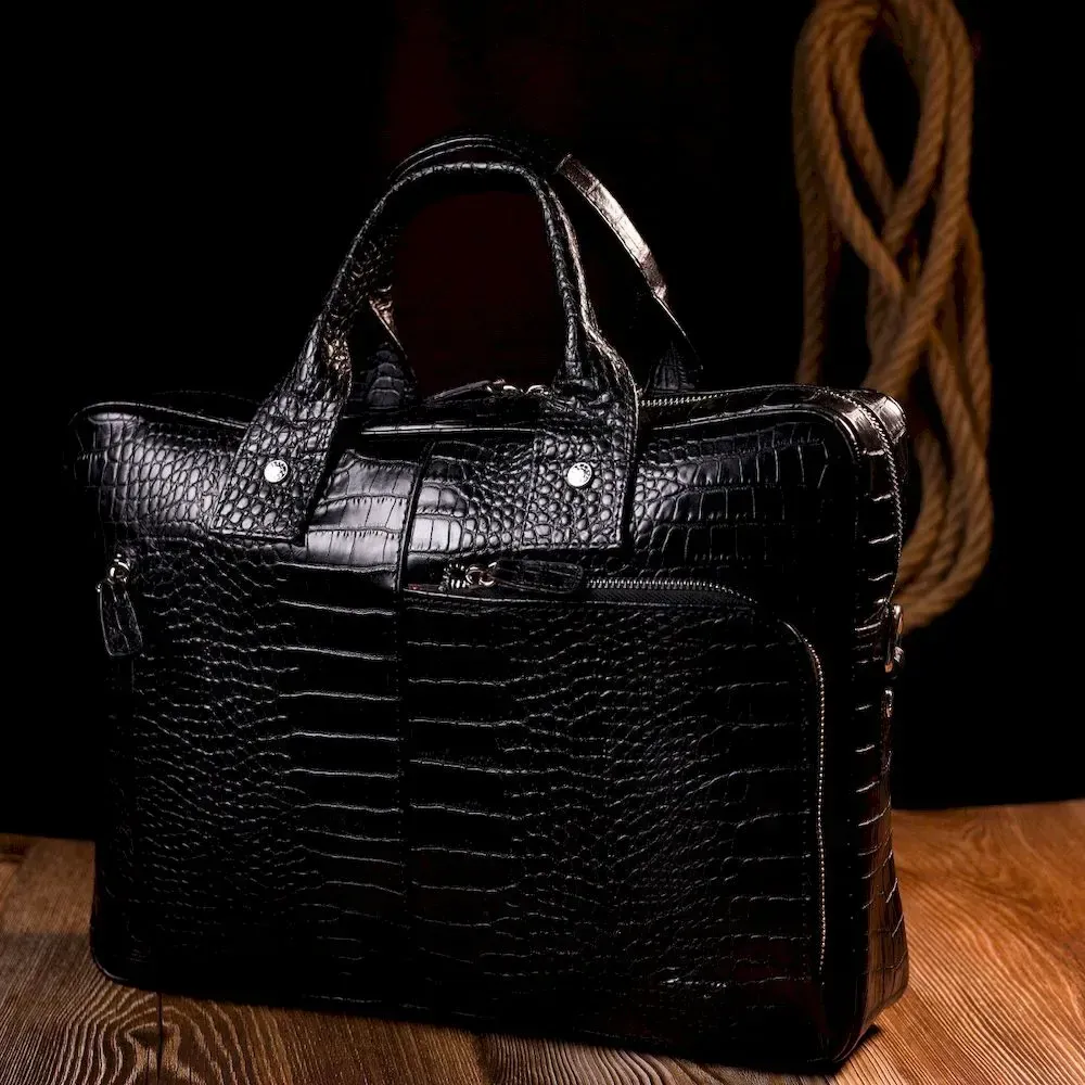 Вместительный портфель из натуральной кожи с тиснением под крокодила для стильных мужчин. Удобная и многофункциональная модель. Модель дополнена фурнитурой цвета серебра, плюс резиновые ножки для защиты внешнего дна сумки. Внутри сумки качественная подкладка. Сумку можно переносить в руке при помощи удобных кожаных ручек, а также через плечо (в комплекте съемный, регулируемый плечевой ремень, который выполнен в комбинации текстильного материала и натуральной кожи). Будет идеальным вариантом для подарка близкому человеку.