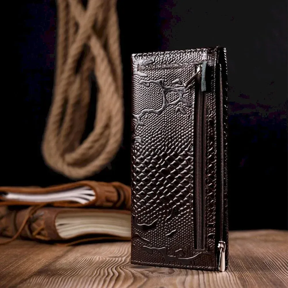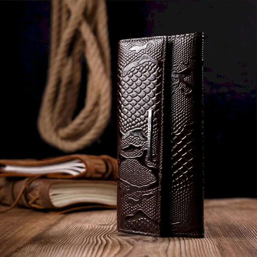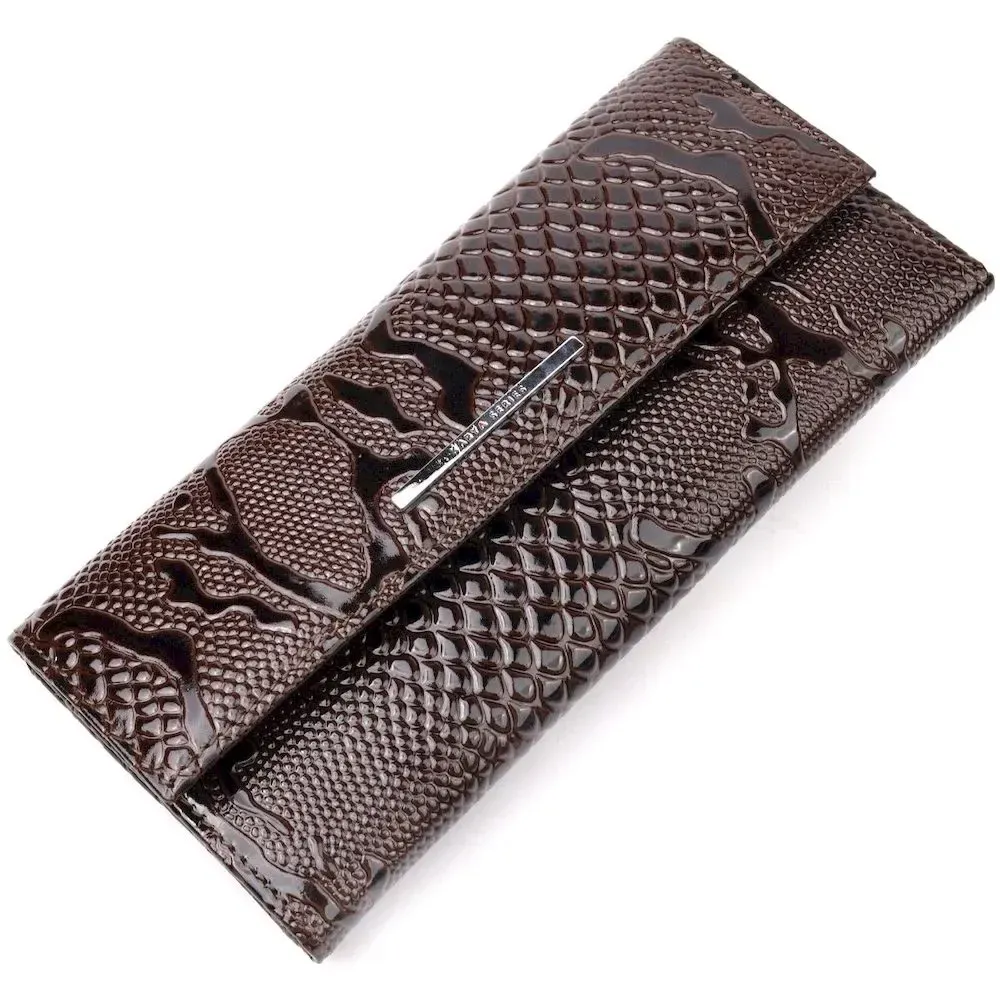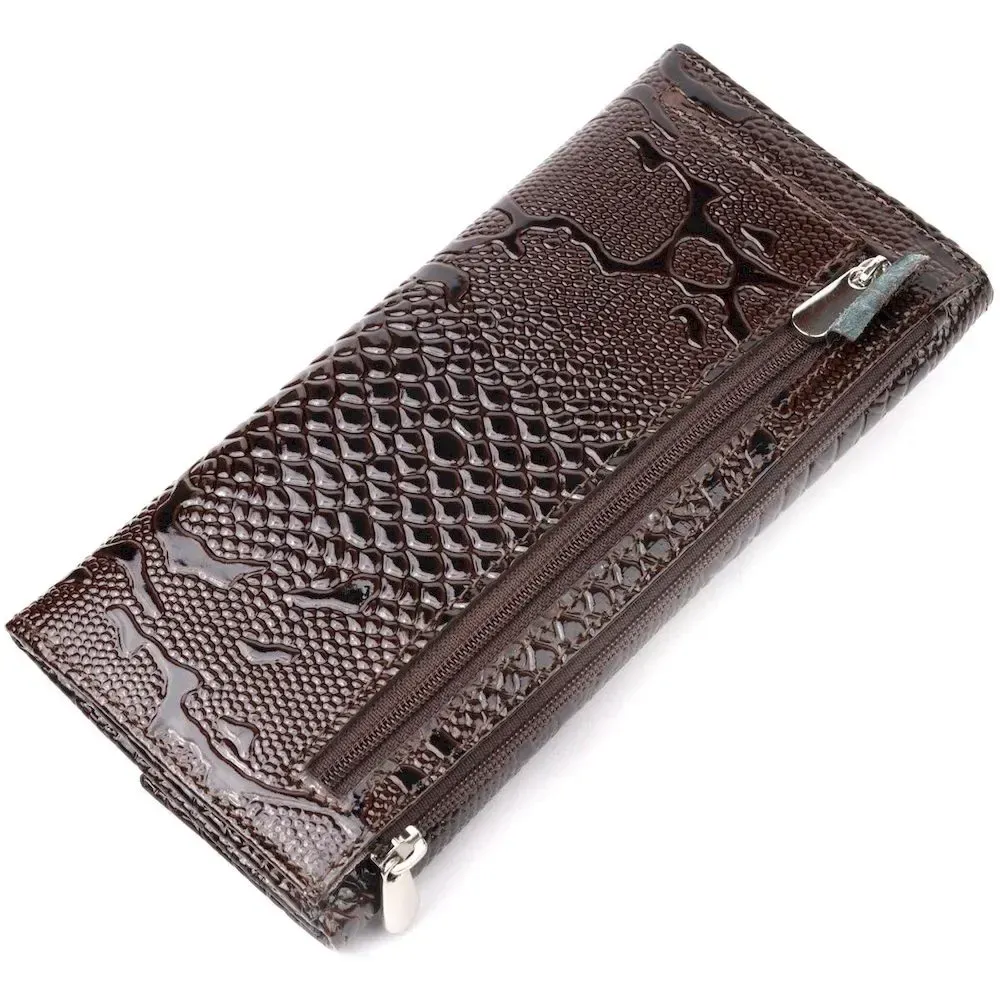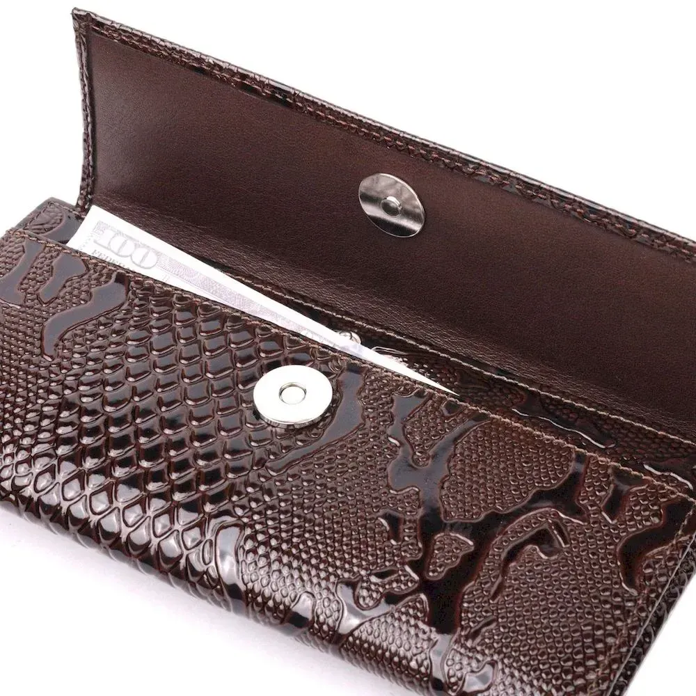 Вместительный женский кошелек из натуральной лакированной кожи, с тиснением под змею, в коричневом цвете. Складывается аксессуар пополам и закрывается клапаном на магнит. Особенностю данного аксессуара есть наличие блока для кредитных карточек, что закрывается хлястиком на кнопку. Такой кошелек из натуральной кожи - это идеальный вариант на каждый день для тех, кто ценит качество, удобство и комфорт, а также будет отлично дополнять Ваш повседневный образ.