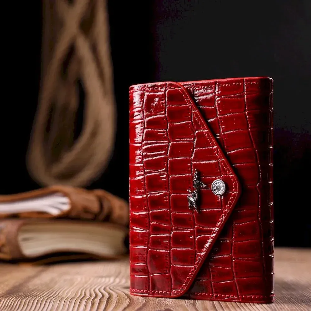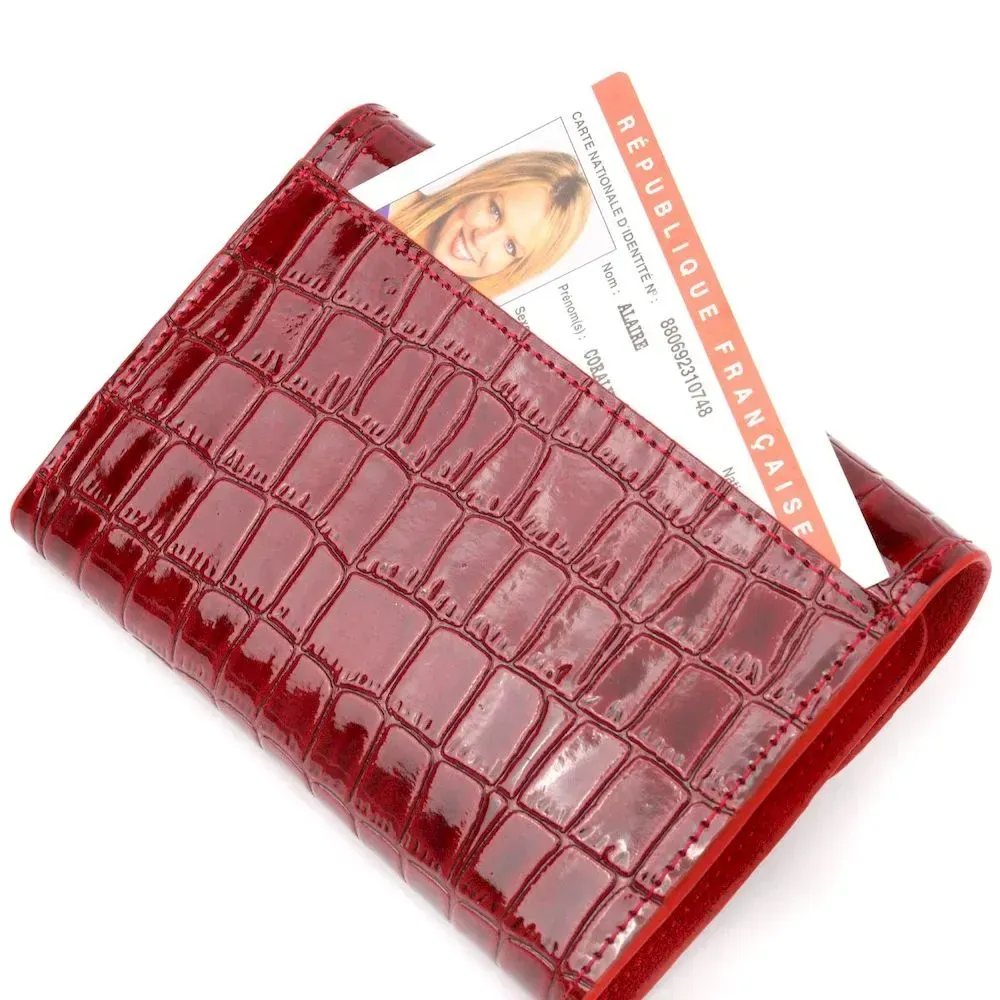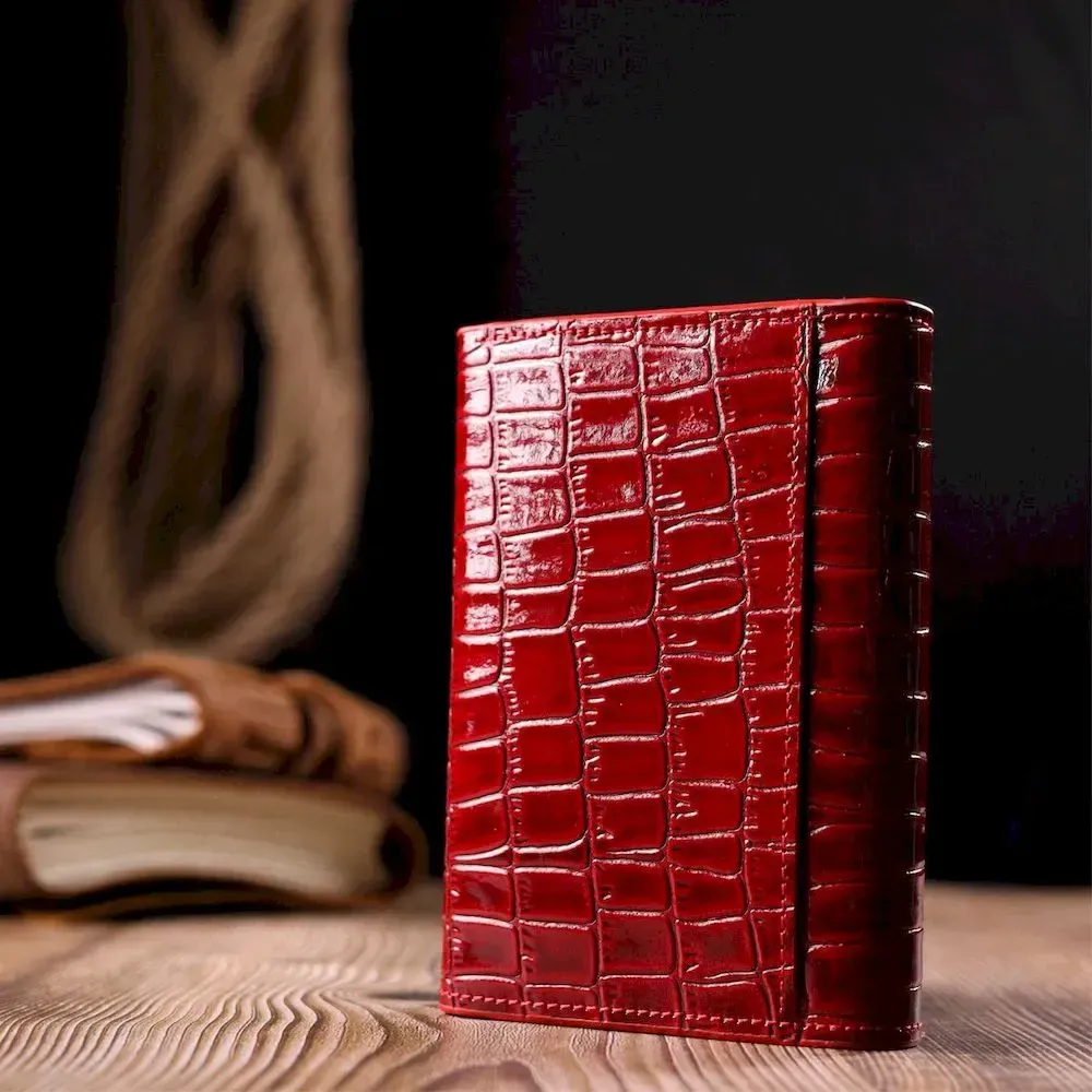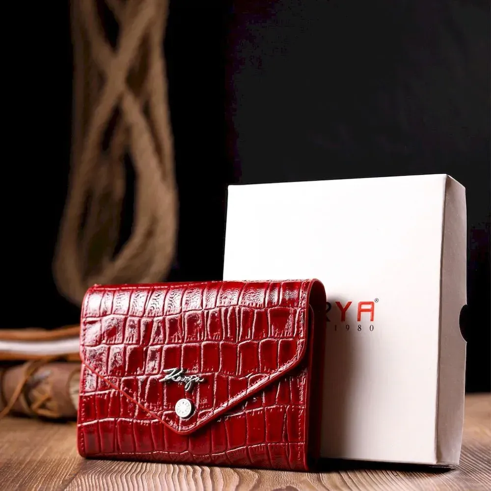 Лакированный горизонтальный женский кошелек с монетницей из натуральной кожи под крокодила KARYA 21073 Бордовый