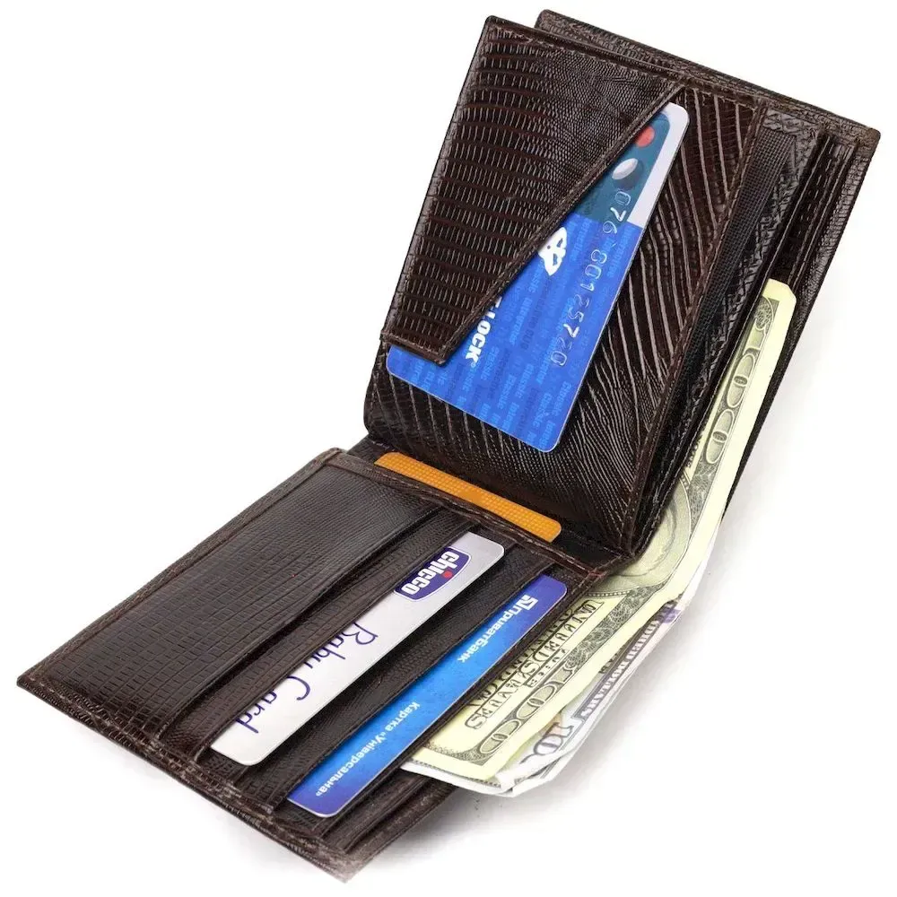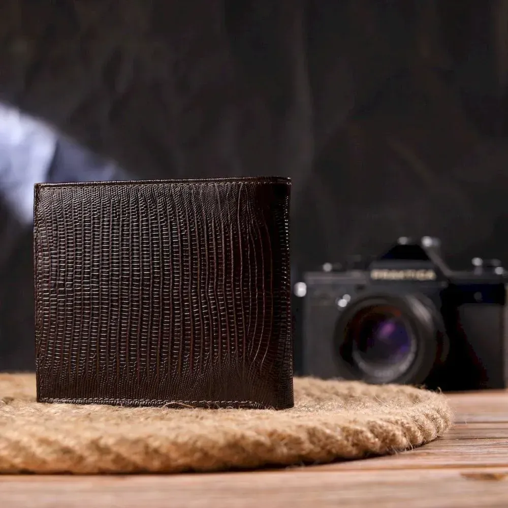 Оригинальный мужской кошелек из натуральной кожи с тиснением под рептилию. Аксессуар имеет два отделение для купюр, в которые помещаются купюры всех номиналов, два прилегающих кармана, а также тринадцать отсеков для карточек, один из них под сеточкой. В современном мире кожаное портмоне является просто необходимой вещью, а качественное кожаное портмоне является еще и неплохим вложением денег, так как прослужит не один год.