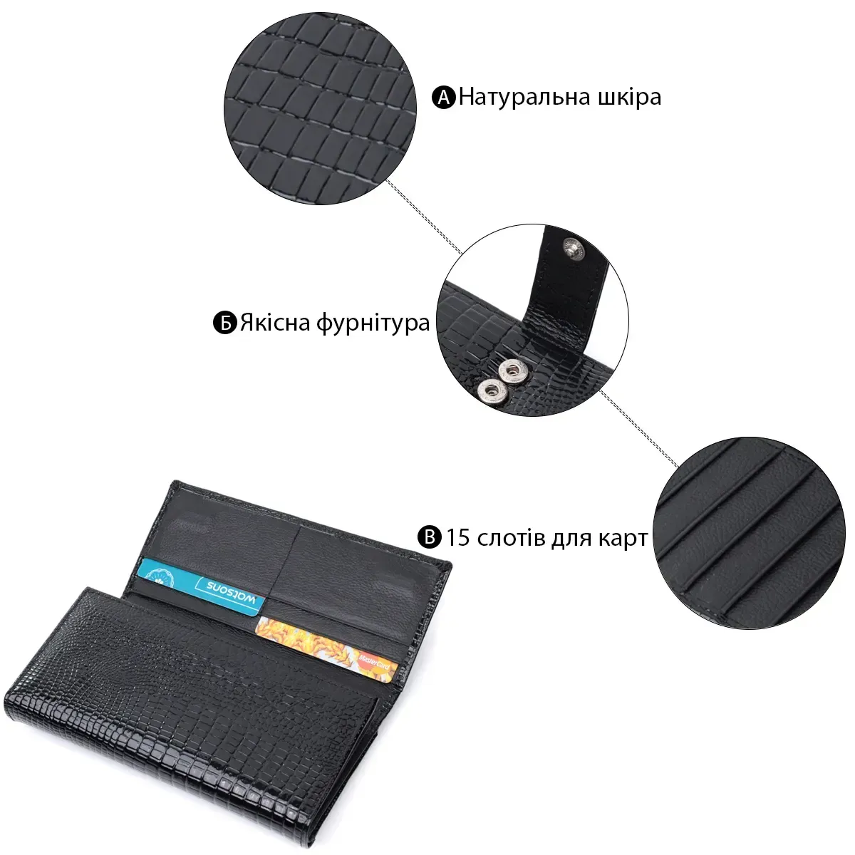Стильный кошелек для женщин из высококачественной лакированной кожи с тиснением под рептилию. Имеет все необходимое, чтобы стать Вам незаменимым аксессуаром в повседневной рутинной жизни. Вы с легкостью поместите в него бумажные купюры, монеты, документы. Фишкой этого кошелька есть блок для карт, особенностью которого является наличие двух кнопок, что позволяет регулировать наполняемость блока. На лицевой стороне, в правом нижнем углу расположен металлический логотип производителя, что является залогом качества изделия. Упакован аксессуар в белую плотную картонную коробку с фирменным логотипом. Если же Вы решите такой аксессуар подарить близкому человеку, то Вам гарантированно будут очень благодарны.