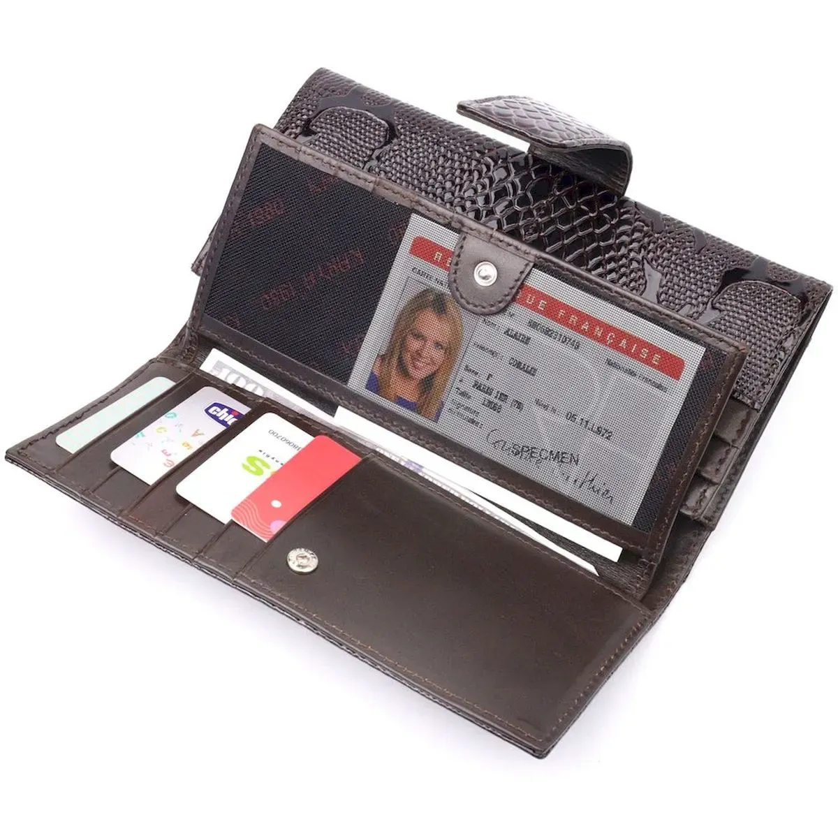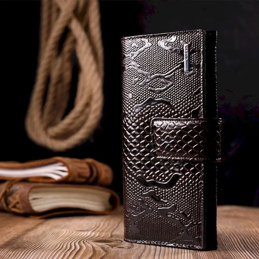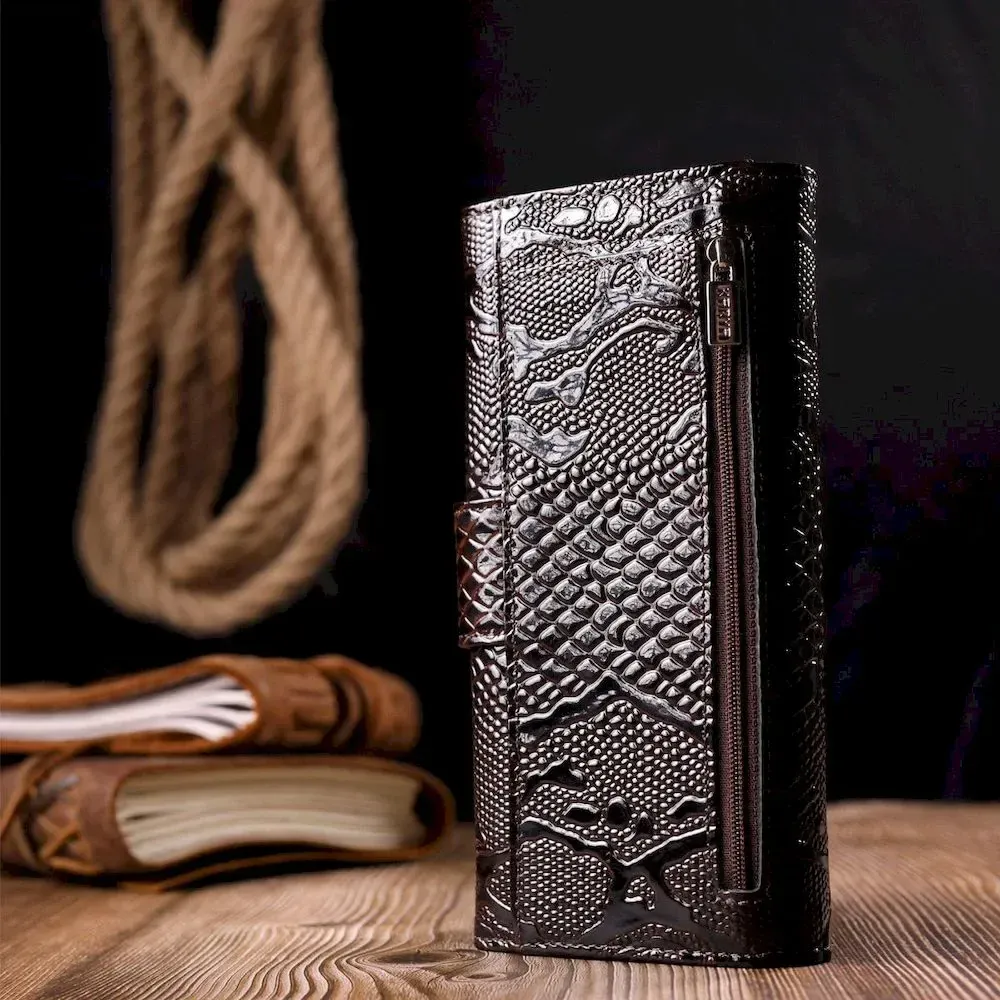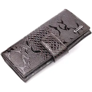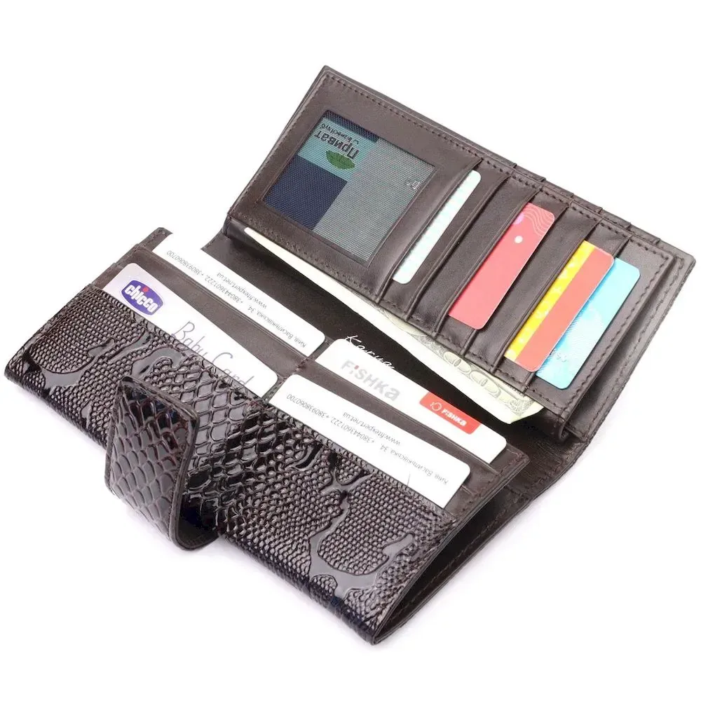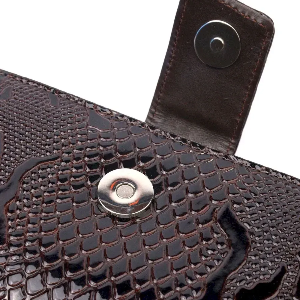 Вместительный женский кошелек из натуральной лакированной кожи, с тиснением под змею, в коричневом цвете. Складывается аксессуар пополам, с фиксацией на хлястик и магнит. Особенностью данного аксессуара есть наличие блока для кредитных карточек, что закрывается на кнопку. Качественная фурнитура дополняет и украшает изделие. Такой кошелек из натуральной кожи - это идеальный вариант на каждый день для тех, кто ценит качество, удобство и комфорт, а также будет отлично дополнять Ваш повседневный образ.