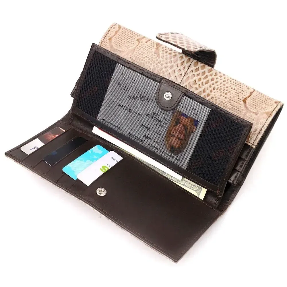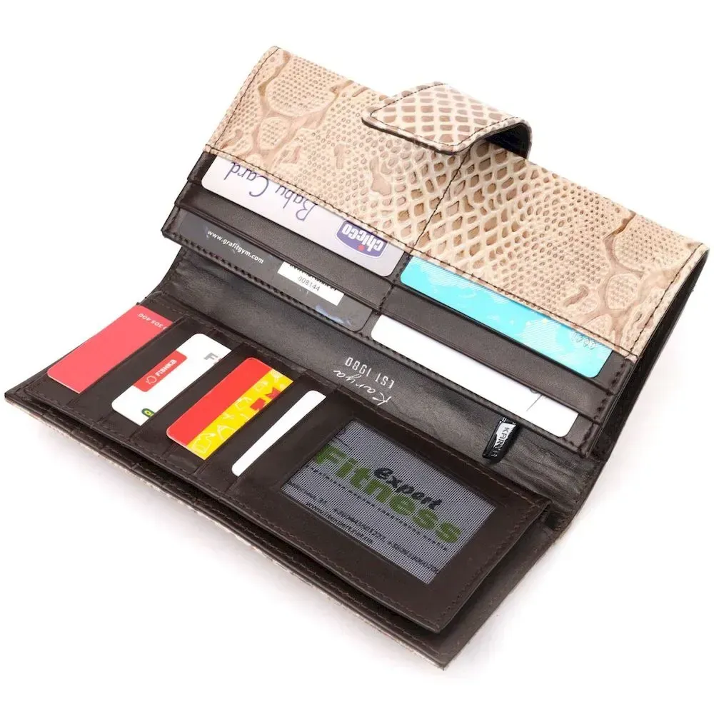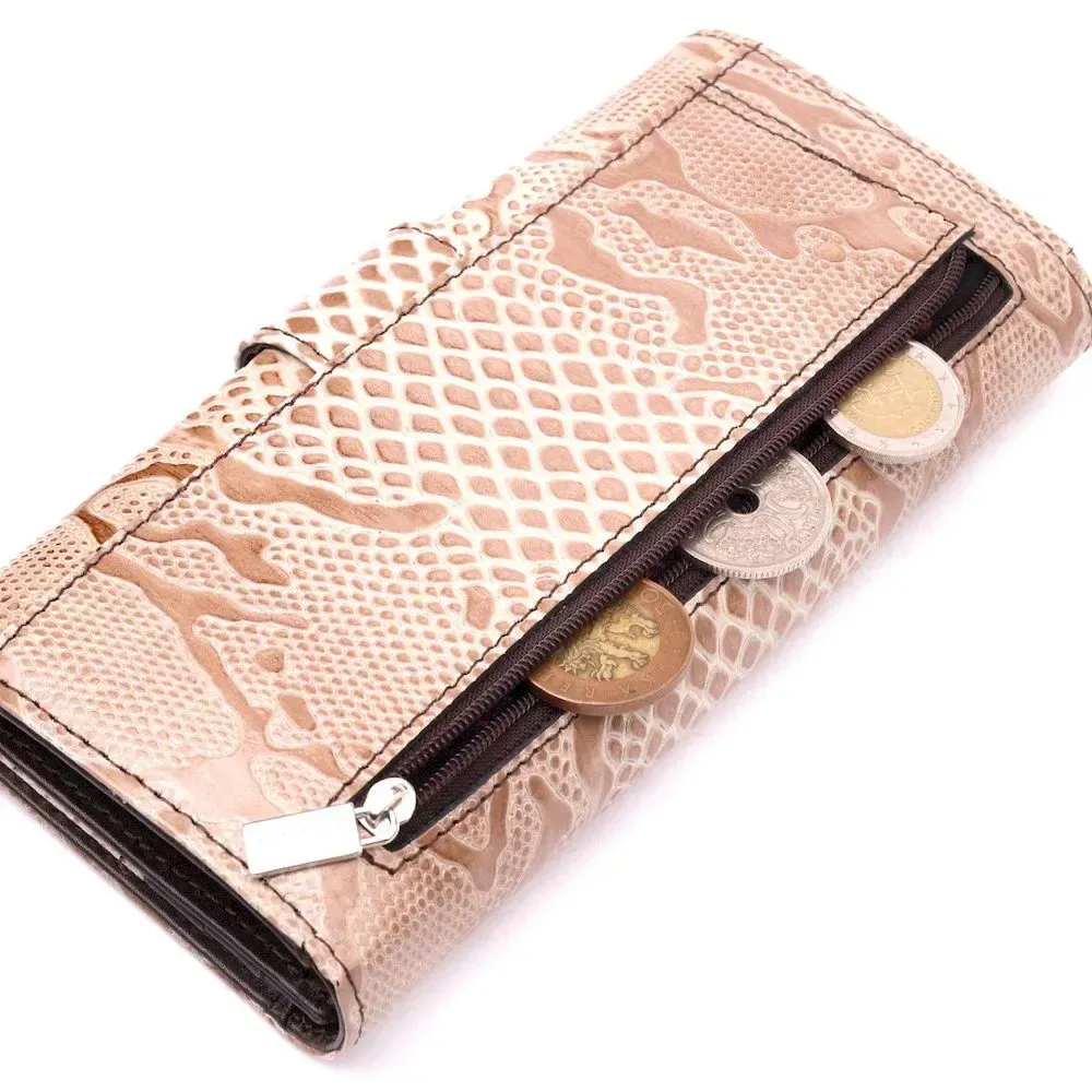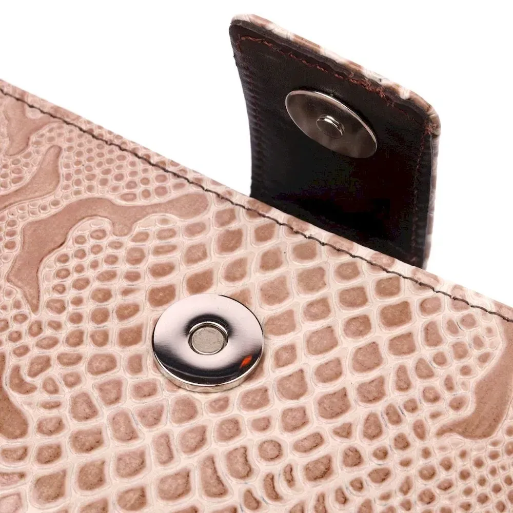 Функциональный женский кошелек из натуральной лакированной кожи, с тиснением под змею, в бежевом цвете. Складывается аксессуар пополам, с фиксацией на хлястик и магнит. Особенностью данного аксессуара есть наличие блока для кредитных карточек, что закрывается на кнопку. Качественная фурнитура дополняет и украшает изделие. Такой кошелек из натуральной кожи - это идеальный вариант на каждый день для тех, кто ценит качество, удобство и комфорт, а также будет отлично дополнять Ваш повседневный образ.