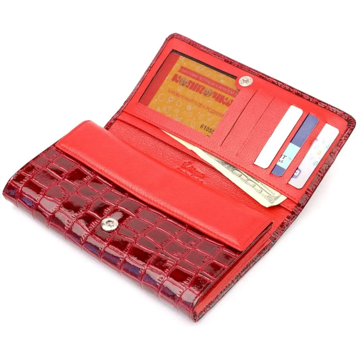 Яркий женский кошелек из натуральной качественной кожи. Особенностью изделия есть комбинация кожи внутри и снаружи. Внутри кошелек пошит из зернистой мягкой кожи, а снаружи из лакированной кожи с тиснением под крокодила. Изделие имеет множество карманов, в которых можно удобно разложить купюры, пластиковые карточки и документы. Такой кошелек из натуральной кожи - это идеальный вариант на каждый день для тех, кто ценит качество, удобство и комфорт, а также будет отлично дополнять Ваш повседневный образ.