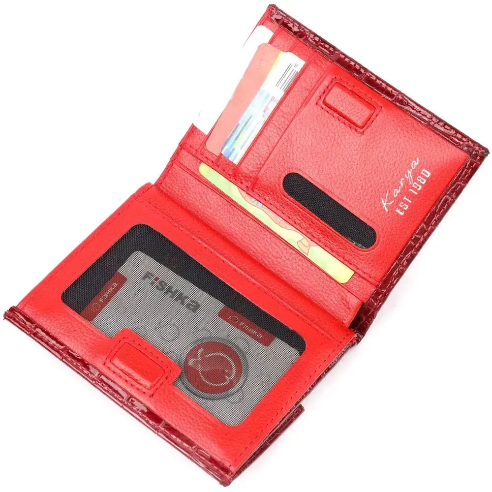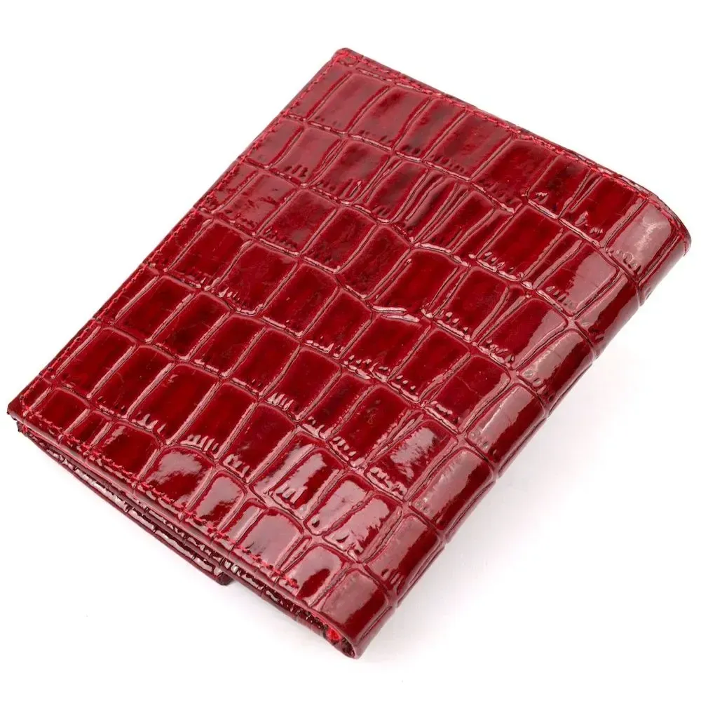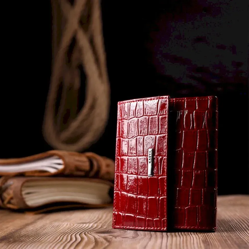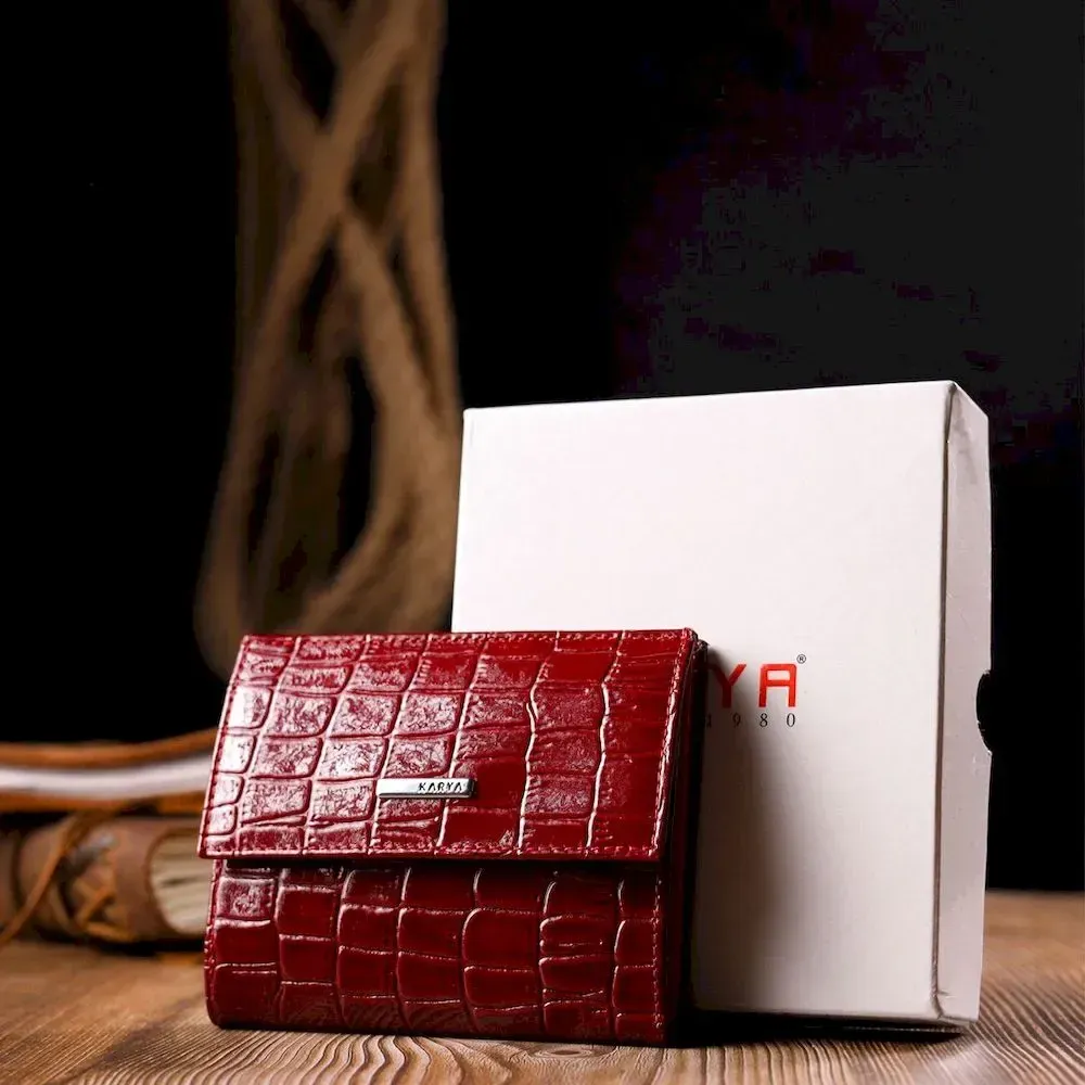 Лакированный женский кошелек на магните из натуральной кожис тиснением под крокодила KARYA 21186 Красный