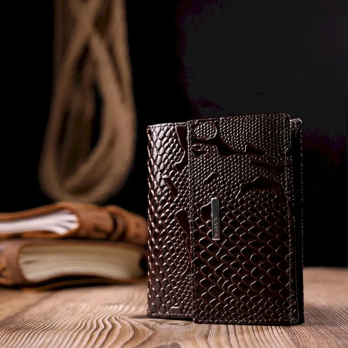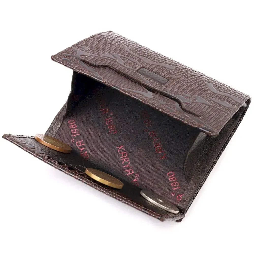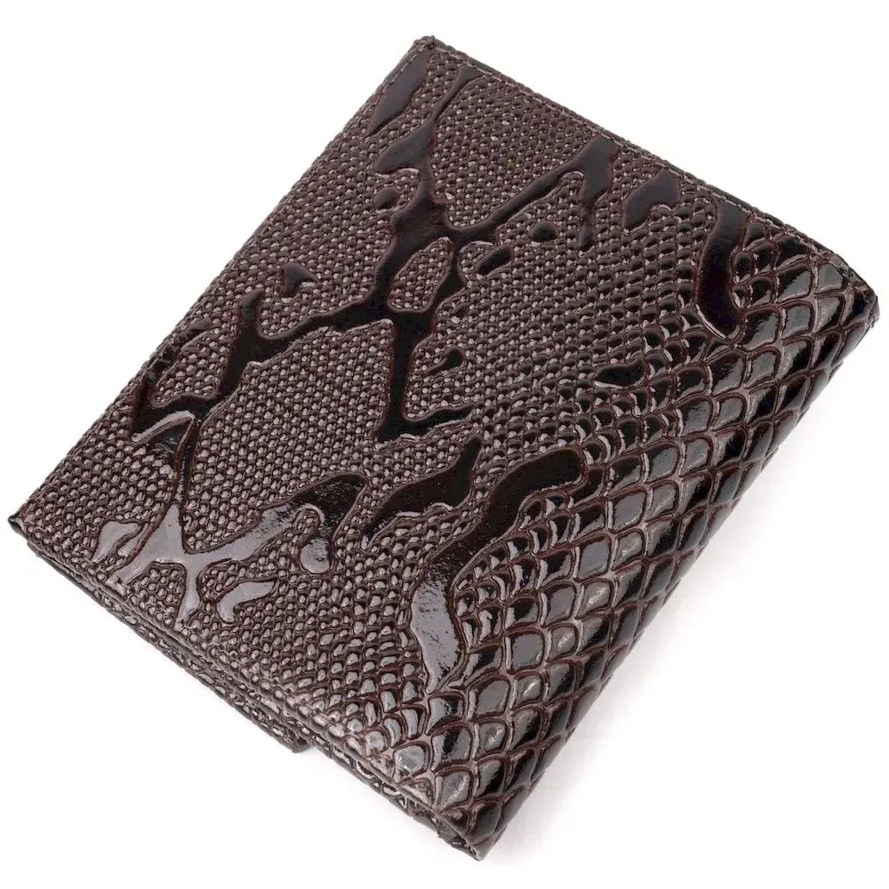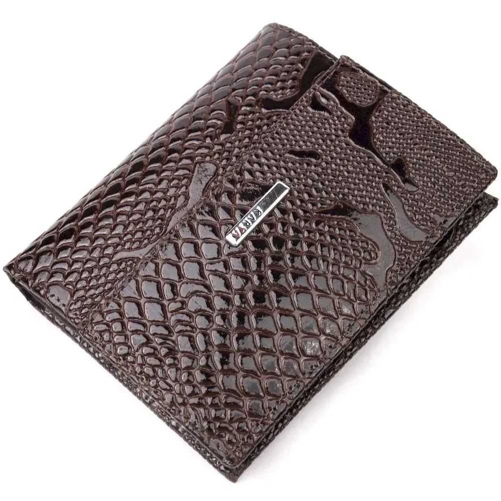 Лакированный женский кошелек на магните из натуральной кожис тиснением под змею KARYA 21187 Коричневый