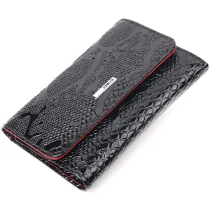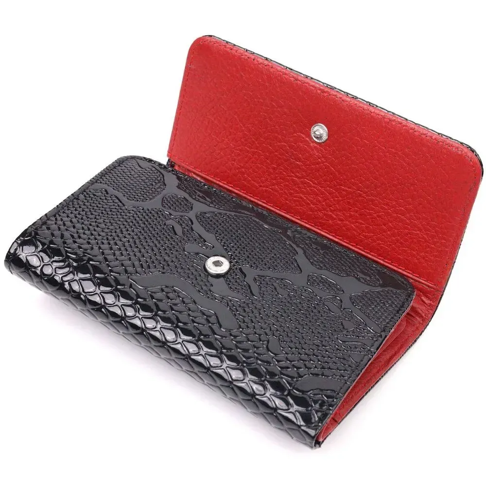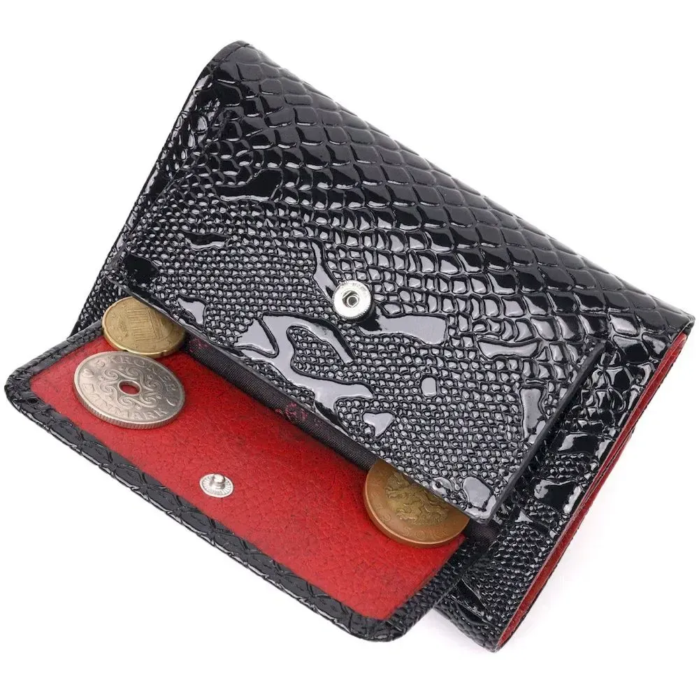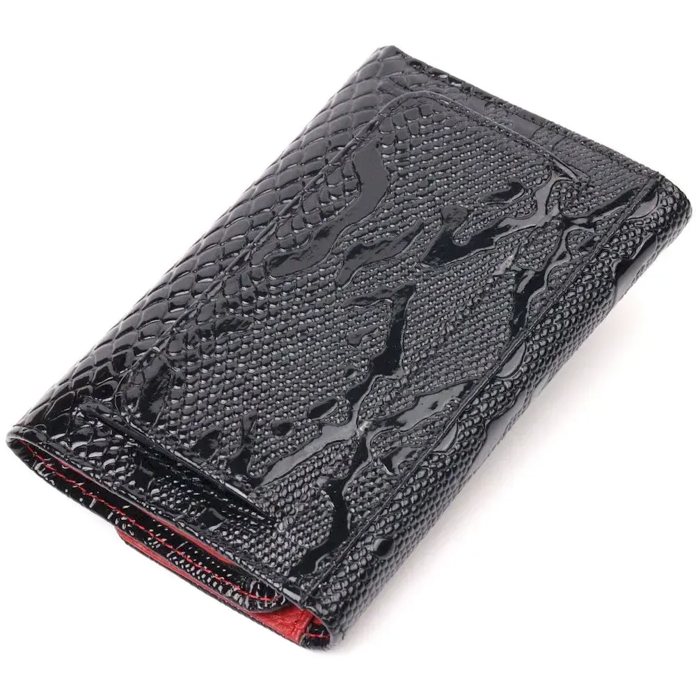 Красивое и стильное лакированное портмоне в современном дизайне в красивом черном цвете снаружи и красным внутри. Изделие выполнено из натуральной кожи высокого качества и отличной устойчивости к износу. Портмоне имеет вместительное отделение для купюр, слоты для пластиковых карточек и монетницу. Закрывается аксессуар на кнопку. Данный аксессуар прекрасно подойдет в качестве подарка и принесет любой женщине исключительную радость.