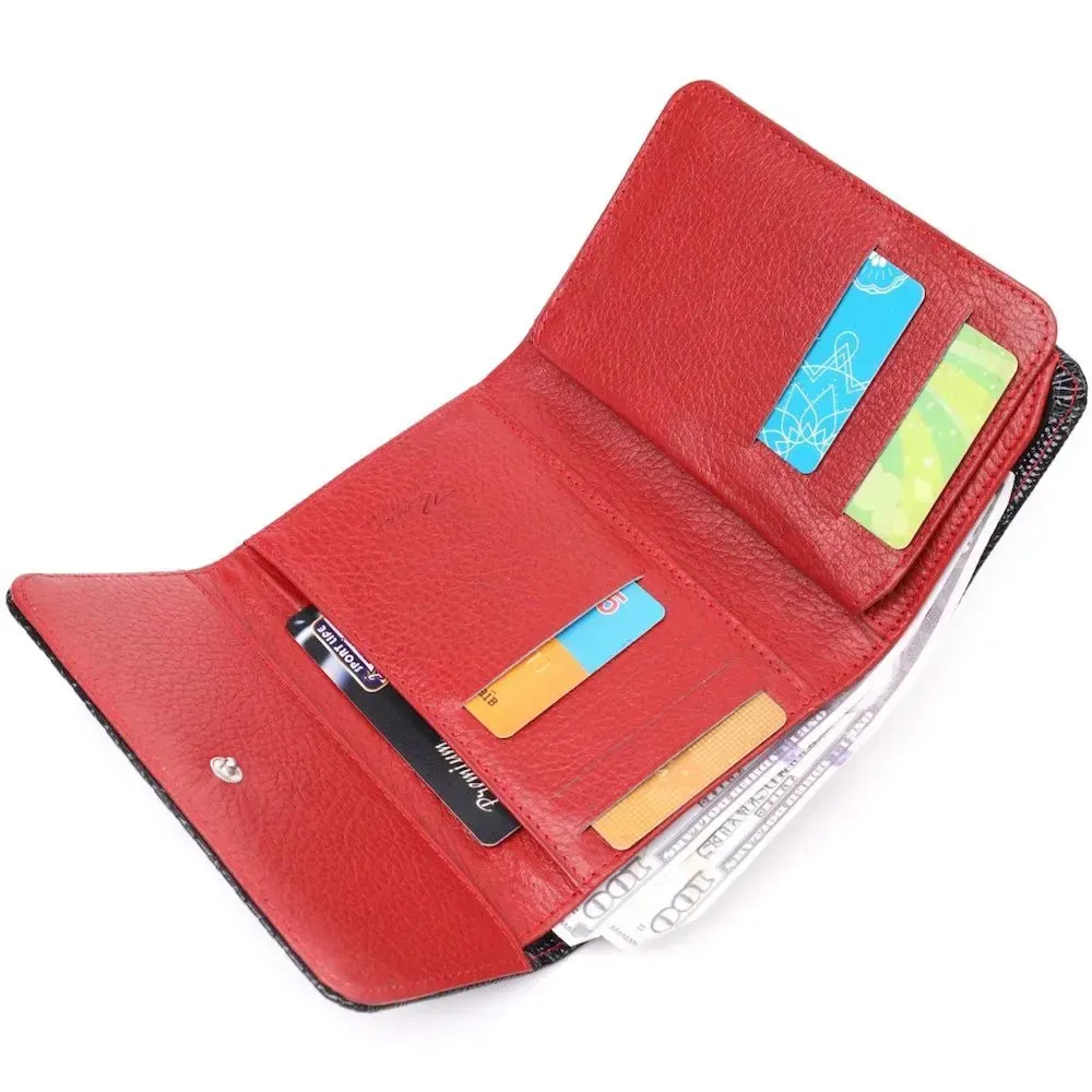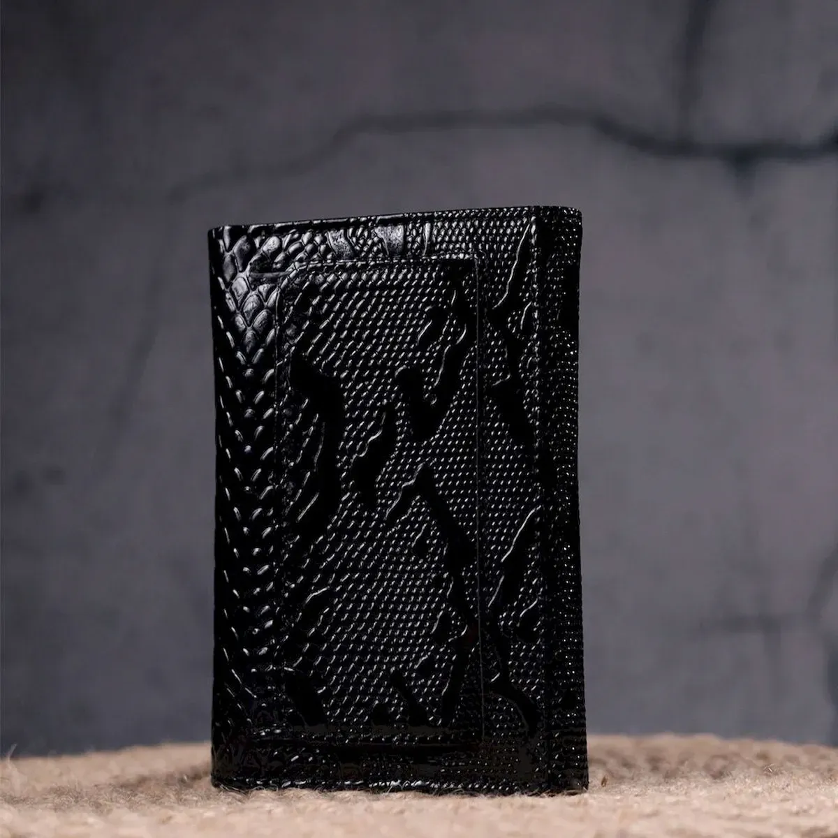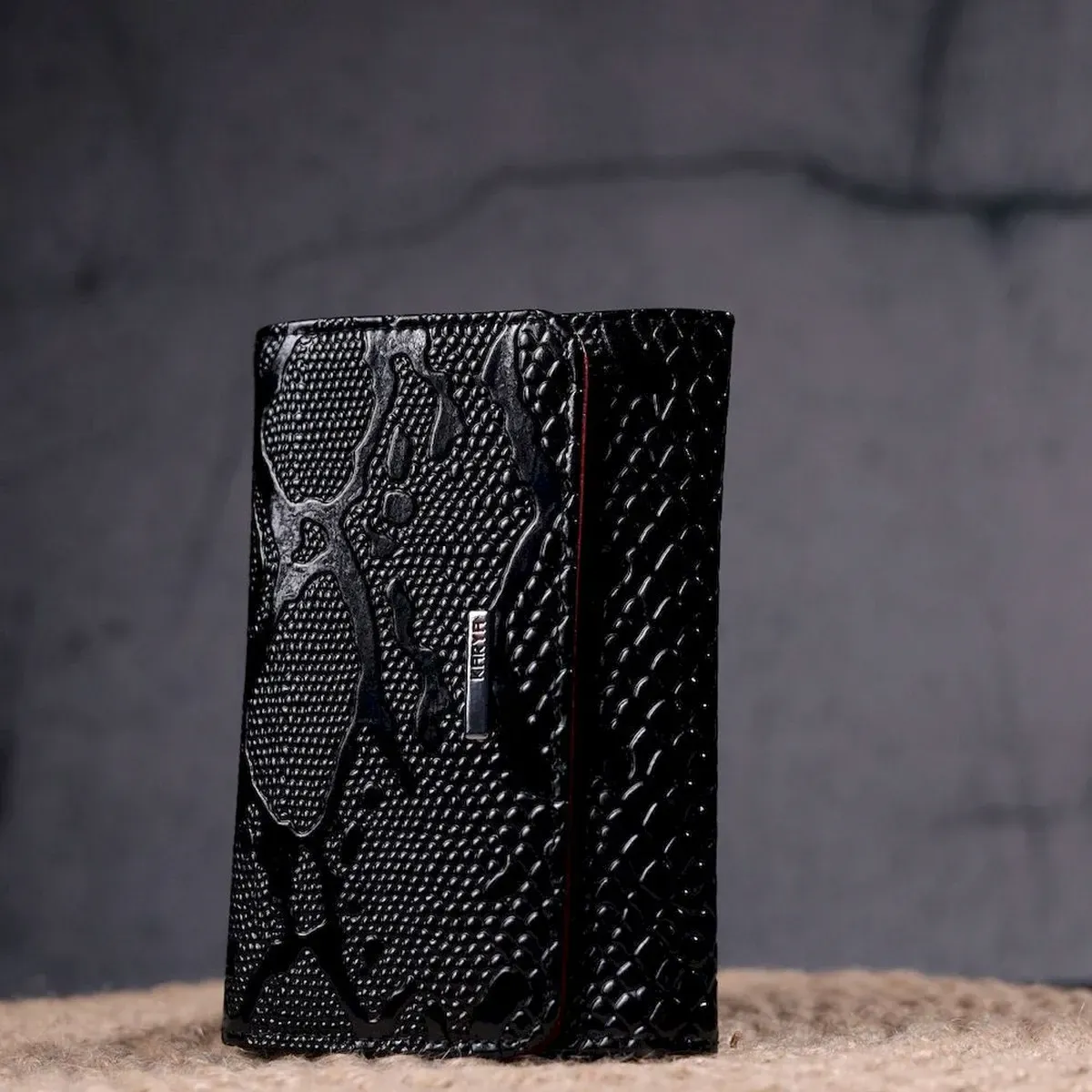 Красивое и стильное лакированное портмоне в современном дизайне в красивом черном цвете снаружи и красным внутри. Изделие выполнено из натуральной кожи высокого качества и отличной устойчивости к износу. Портмоне имеет вместительное отделение для купюр, слоты для пластиковых карточек и монетницу. Закрывается аксессуар на кнопку. Данный аксессуар прекрасно подойдет в качестве подарка и принесет любой женщине исключительную радость.