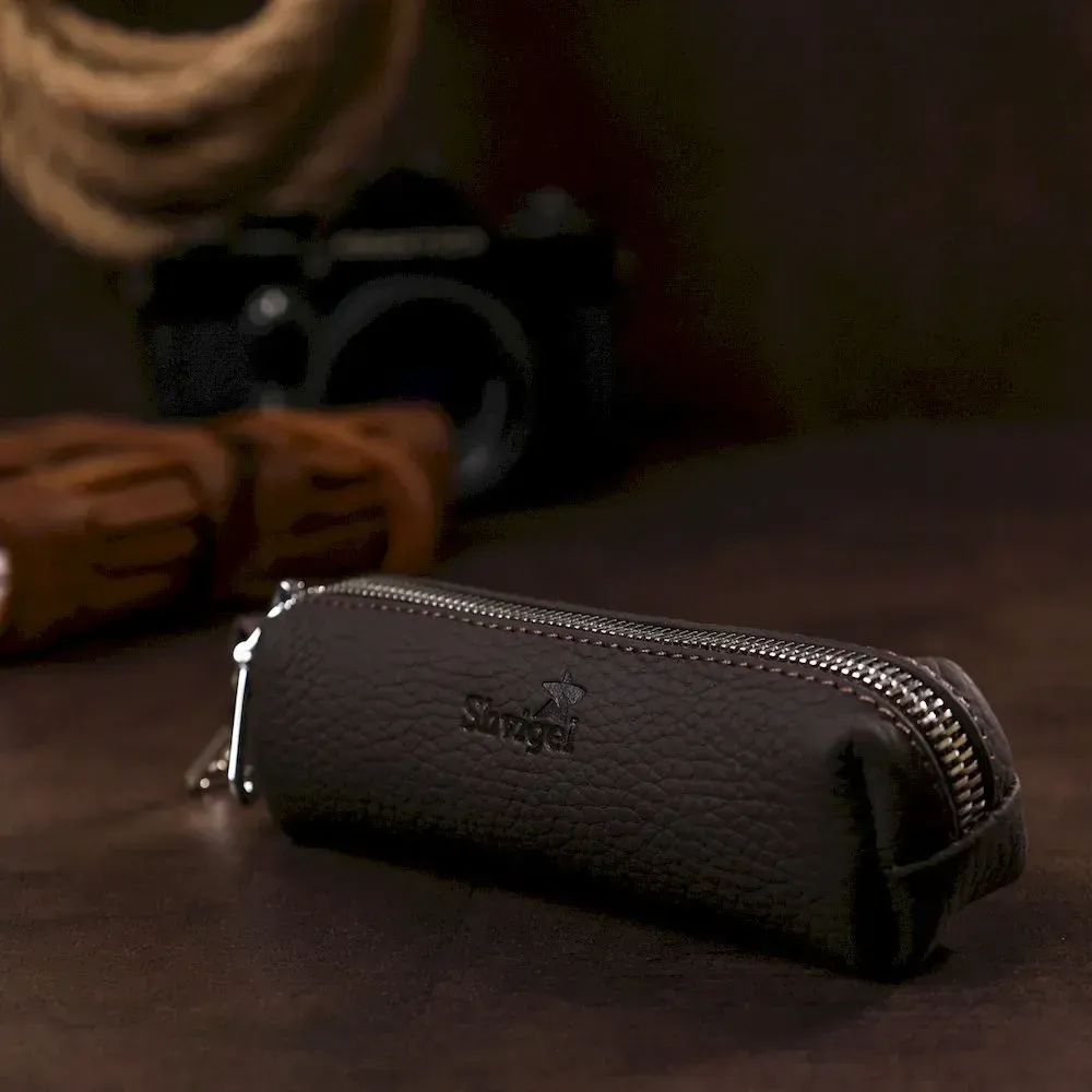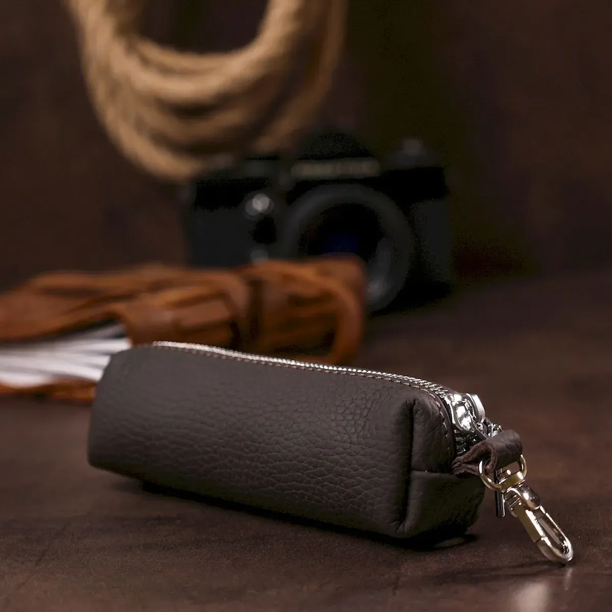 Очень красивая и стильная ключница в матовом коричневом цвете, что смотрится очень необычно и современно. Материал изготовления – натуральная кожа высокого качества, которая на ощупь очень мягкая и приятная. Фактура изделия – зернистая, фурнитура сделана в цвете под серебро, закрывается аксессуар на удобную молнию.