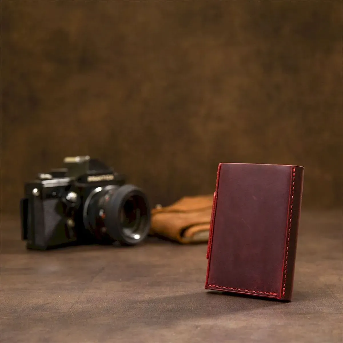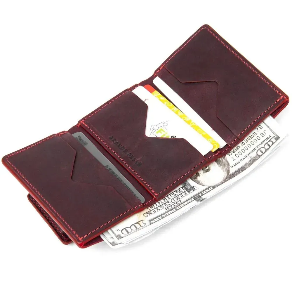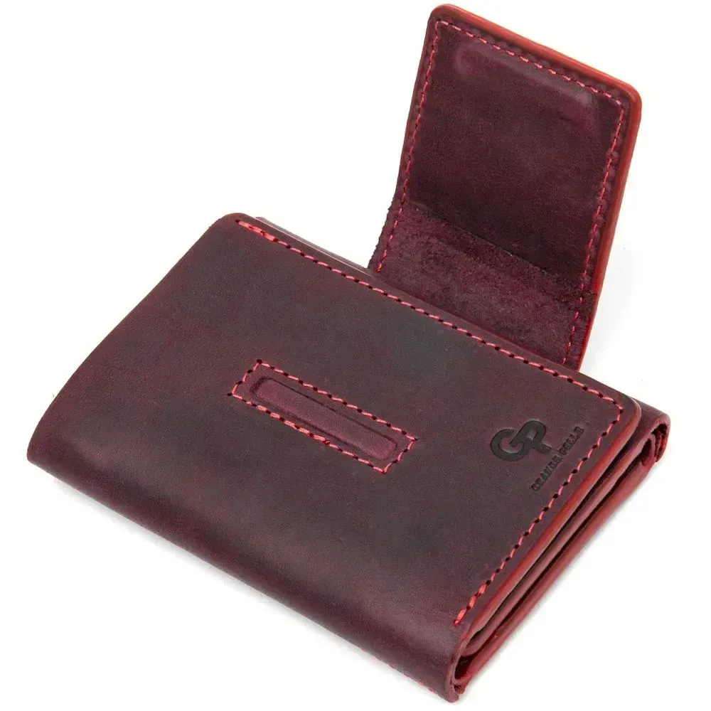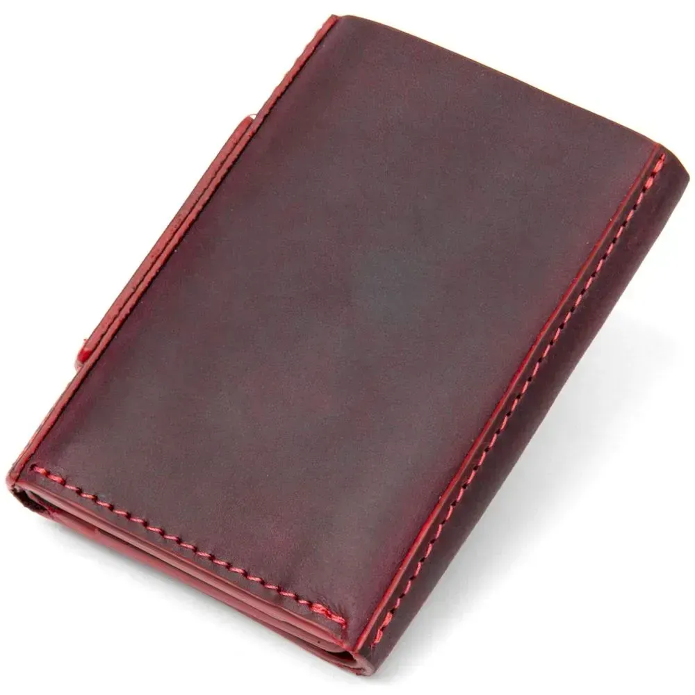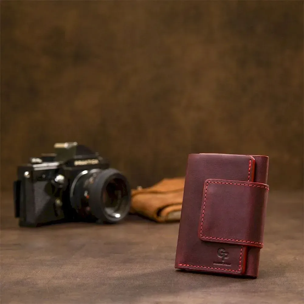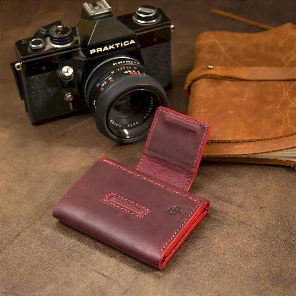 Практичное и очень стильное портмоне из натуральной кожи в элегантном бордовом цвете. Имеет красивую фактуру с эффектом старины, что очень модно сегодня. Внутри есть 6 отдельных слотов для визитных и кредитных карт, а также одно вместительное отделение для банкнот. Упаковка – фирменный чехол.