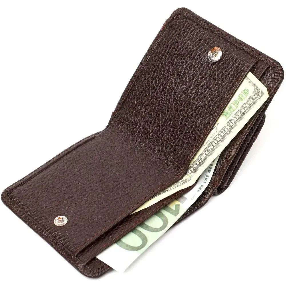Небольшой кошелек для мужчин и для женщин, из натуральной зернистой кожи. Аксессуар состоит из двух отделений для купюр, четырех ячеек для пластиковых карт, одного прилегающего кармана и монетницы. В изделии использована качественная фурнитура. Закрывается кошелек на кнопку. Покупая этот кожаный кошелек, Вы не только приобретаете стильную вещь, но и получаете качественный аксессуар, который прослужит не один год.