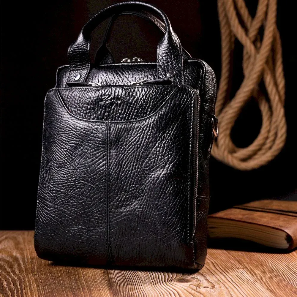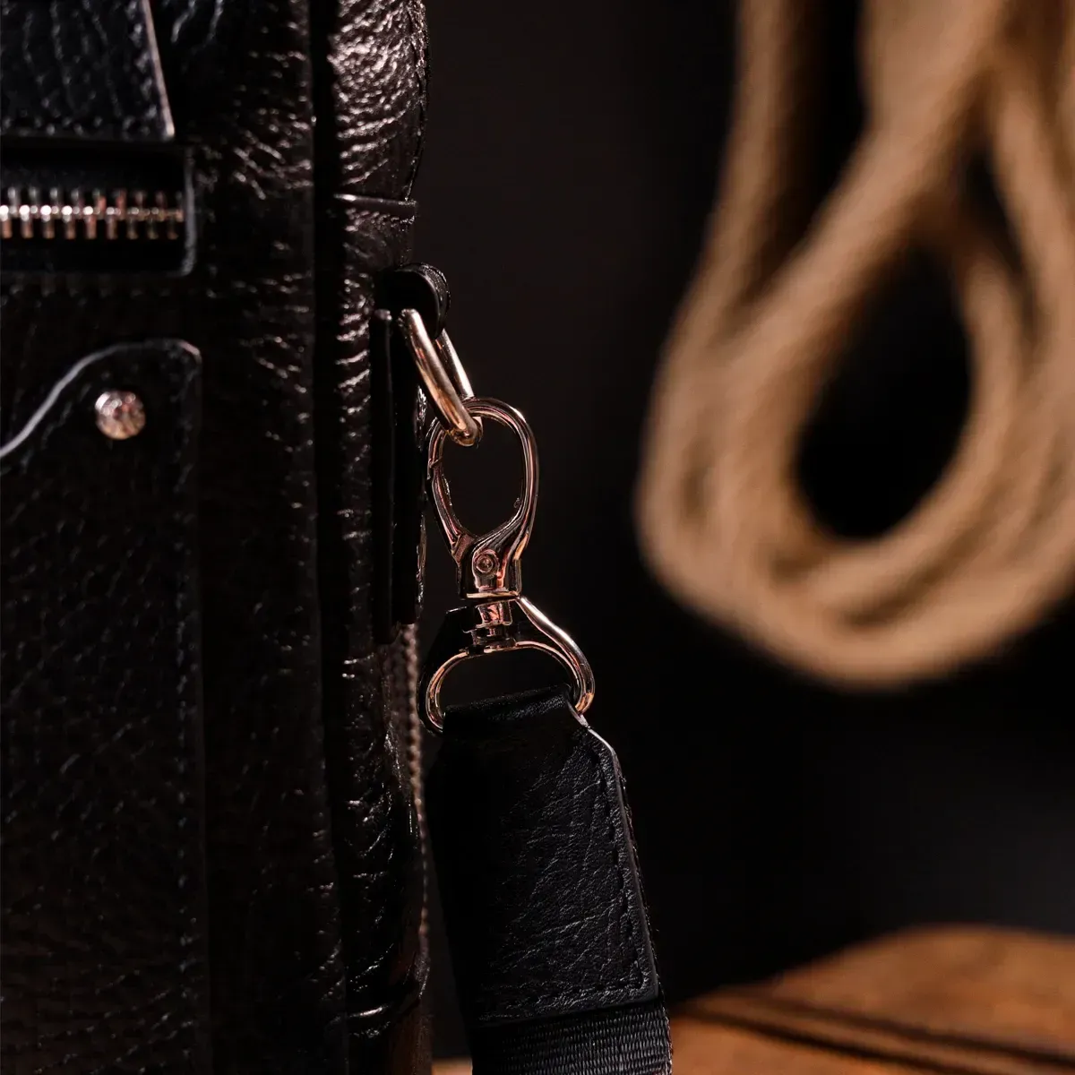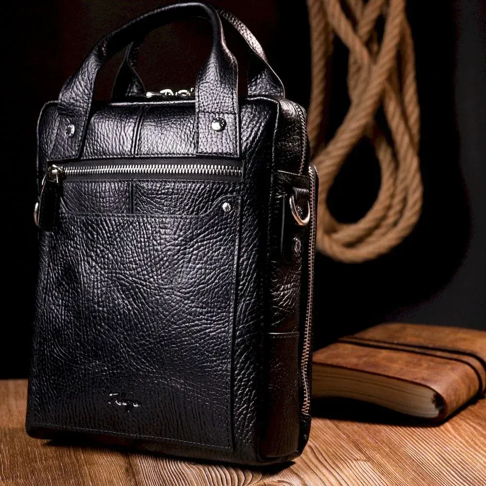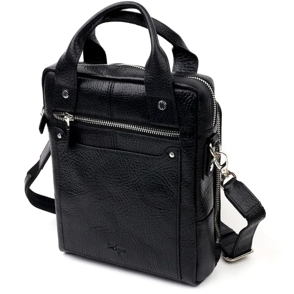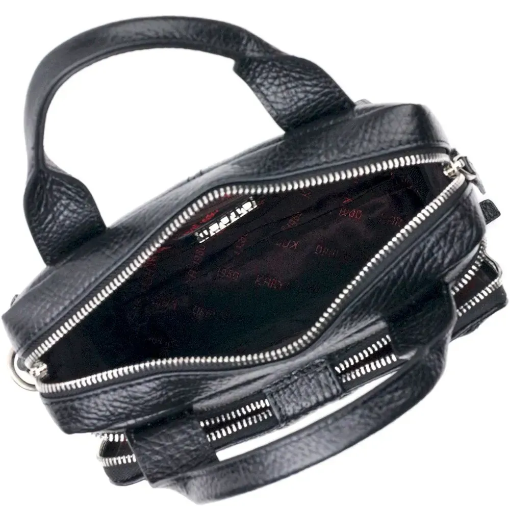 Стильная мужская сумка черного цвета из натуральной крупнозернистой кожи высокого качества. Аксессуар имеет надежную фурнитуру серебристого цвета и прочную подкладку. Изделие упаковано в фирменный текстильный мешок Karya. Качественная мужская сумка из натуральной кожи, всегда была отличным подарком для мужчины любого возраста.