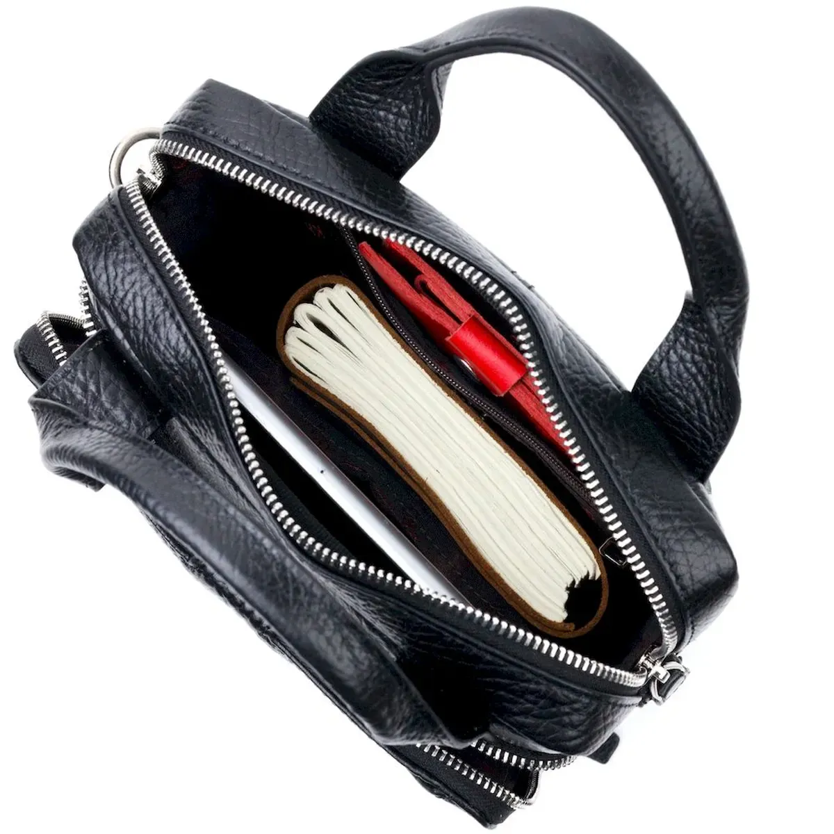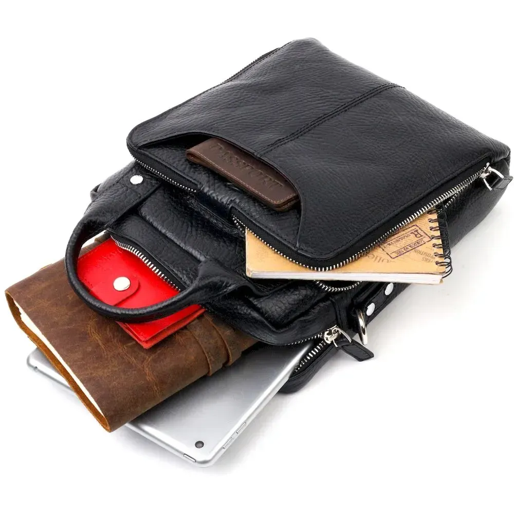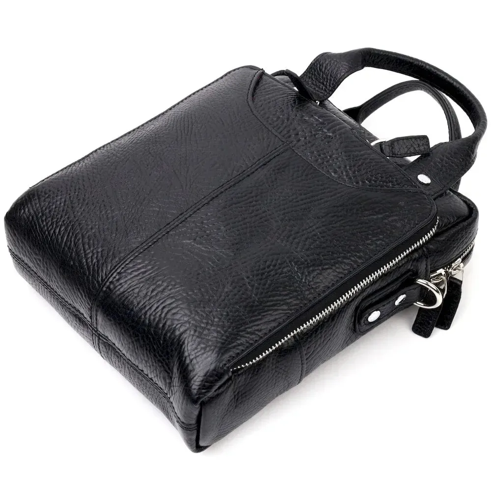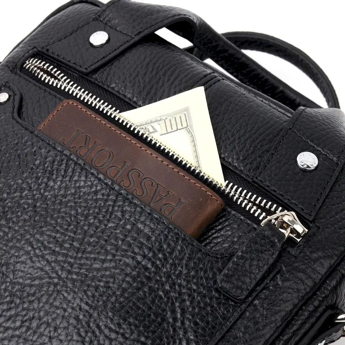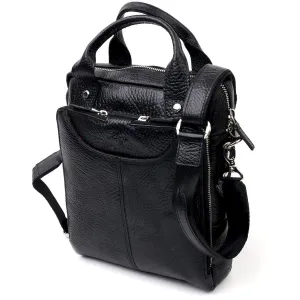 Стильная мужская сумка черного цвета из натуральной крупнозернистой кожи высокого качества. Аксессуар имеет надежную фурнитуру серебристого цвета и прочную подкладку. Изделие упаковано в фирменный текстильный мешок Karya. Качественная мужская сумка из натуральной кожи, всегда была отличным подарком для мужчины любого возраста.