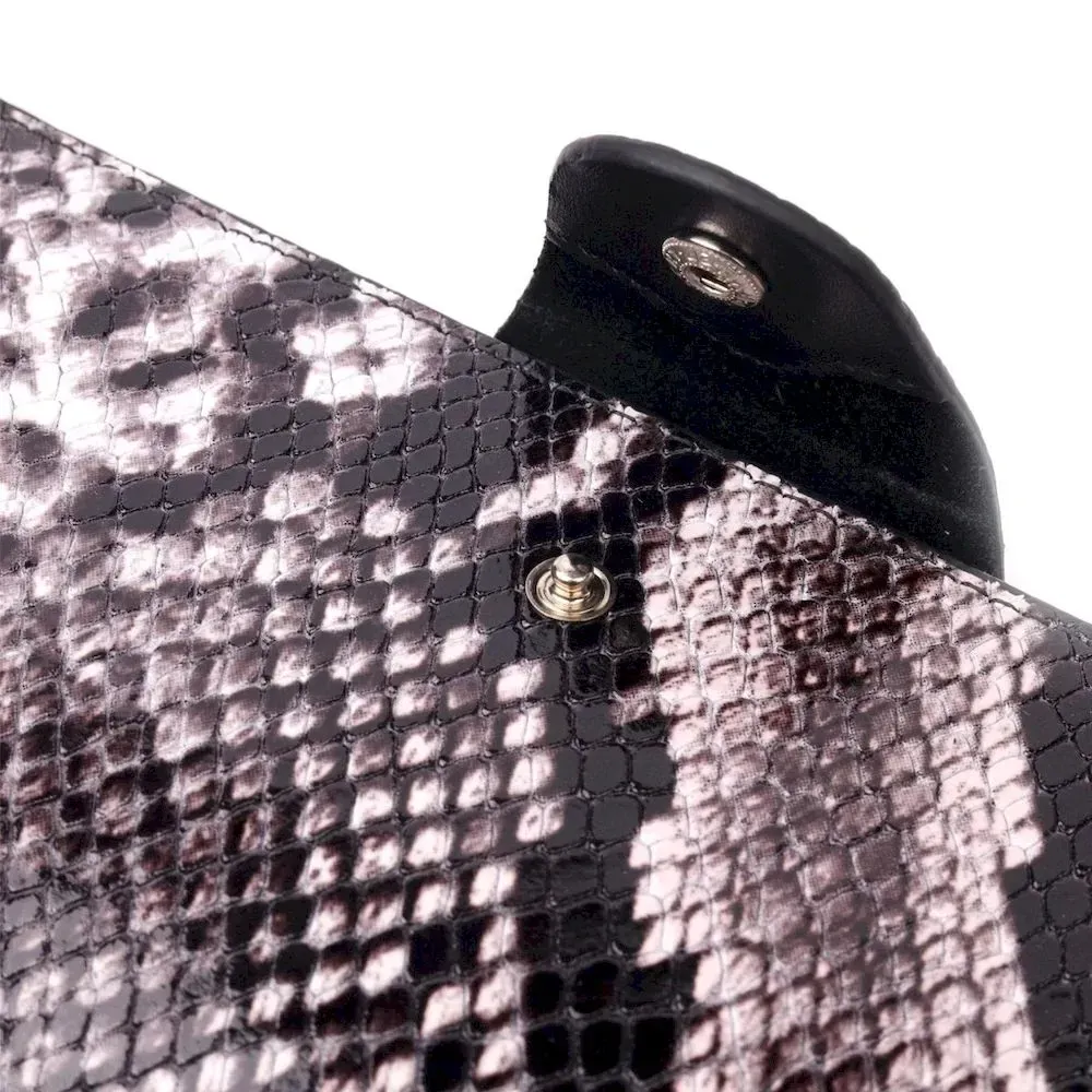 Модный женский кошелек из натуральной лакированной кожи, с тиснением под змею, в черно-белом цвете. Складывается аксессуар пополам, с фиксацией на хлястик и кнопку. Качественная фурнитура дополняет и украшает изделие. Такой кошелек из натуральной кожи - это идеальный вариант на каждый день для тех, кто ценит качество, удобство и комфорт, а также будет отлично дополнять Ваш повседневный образ.