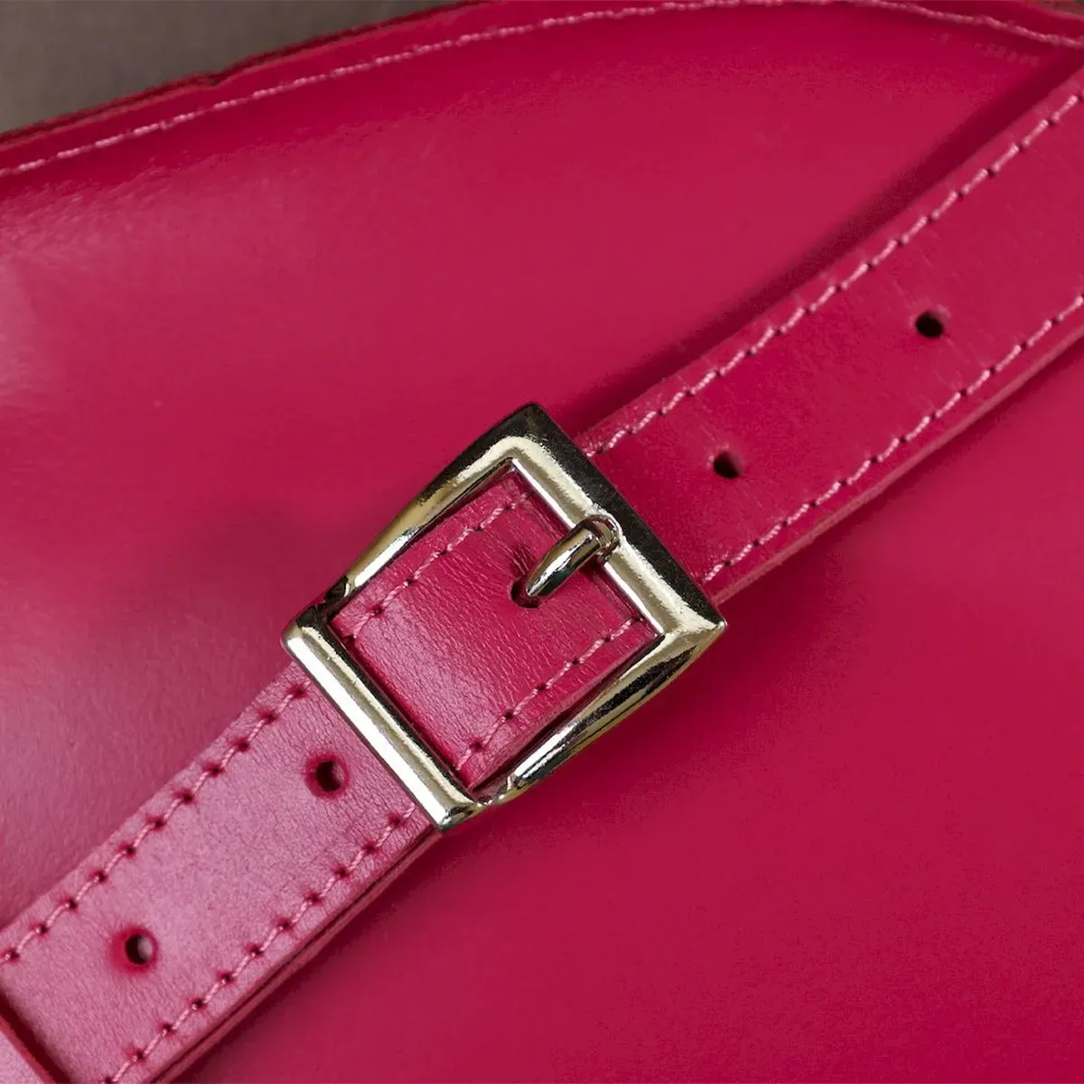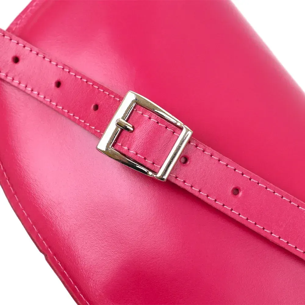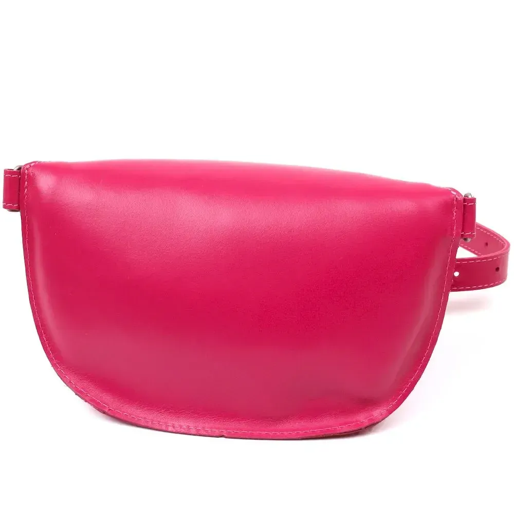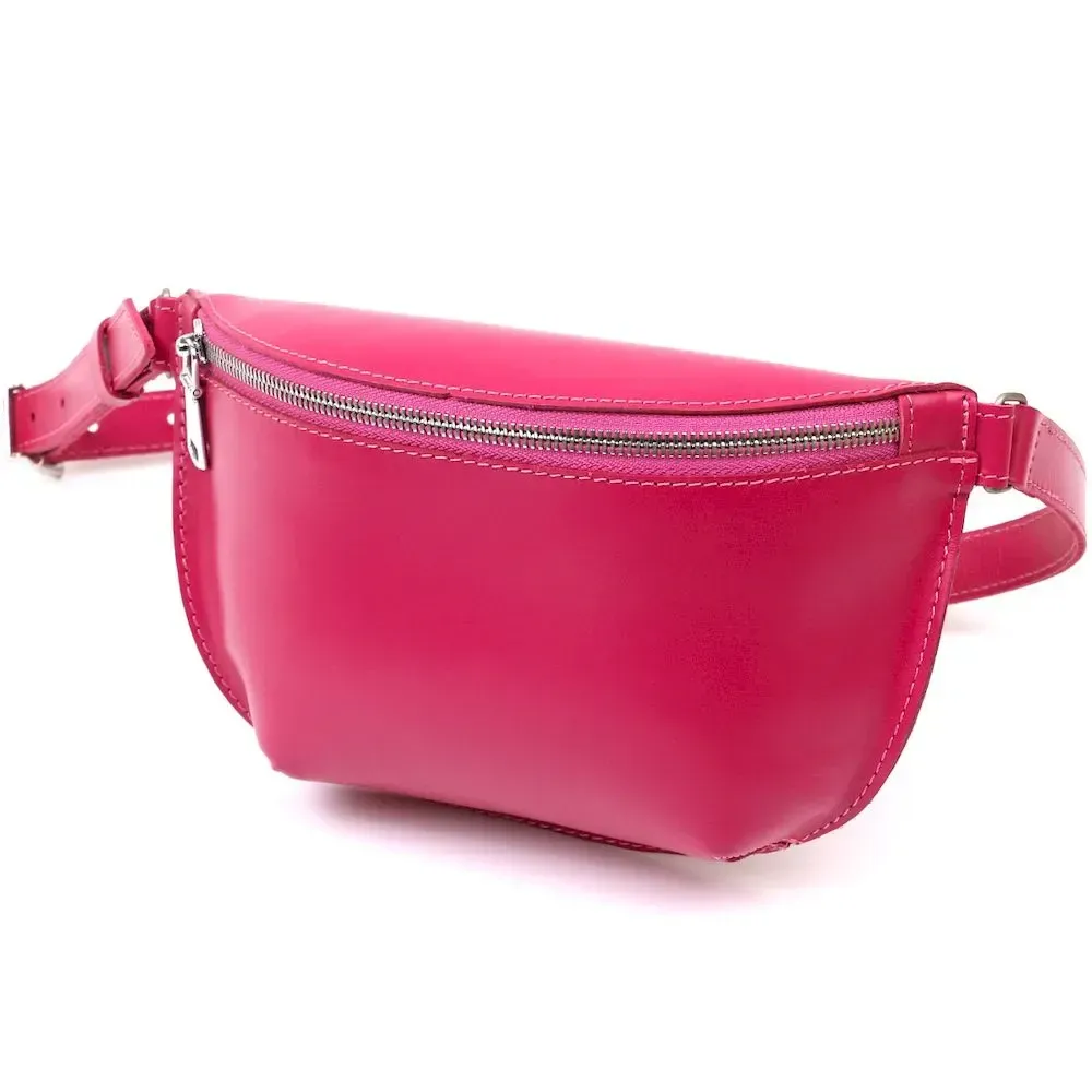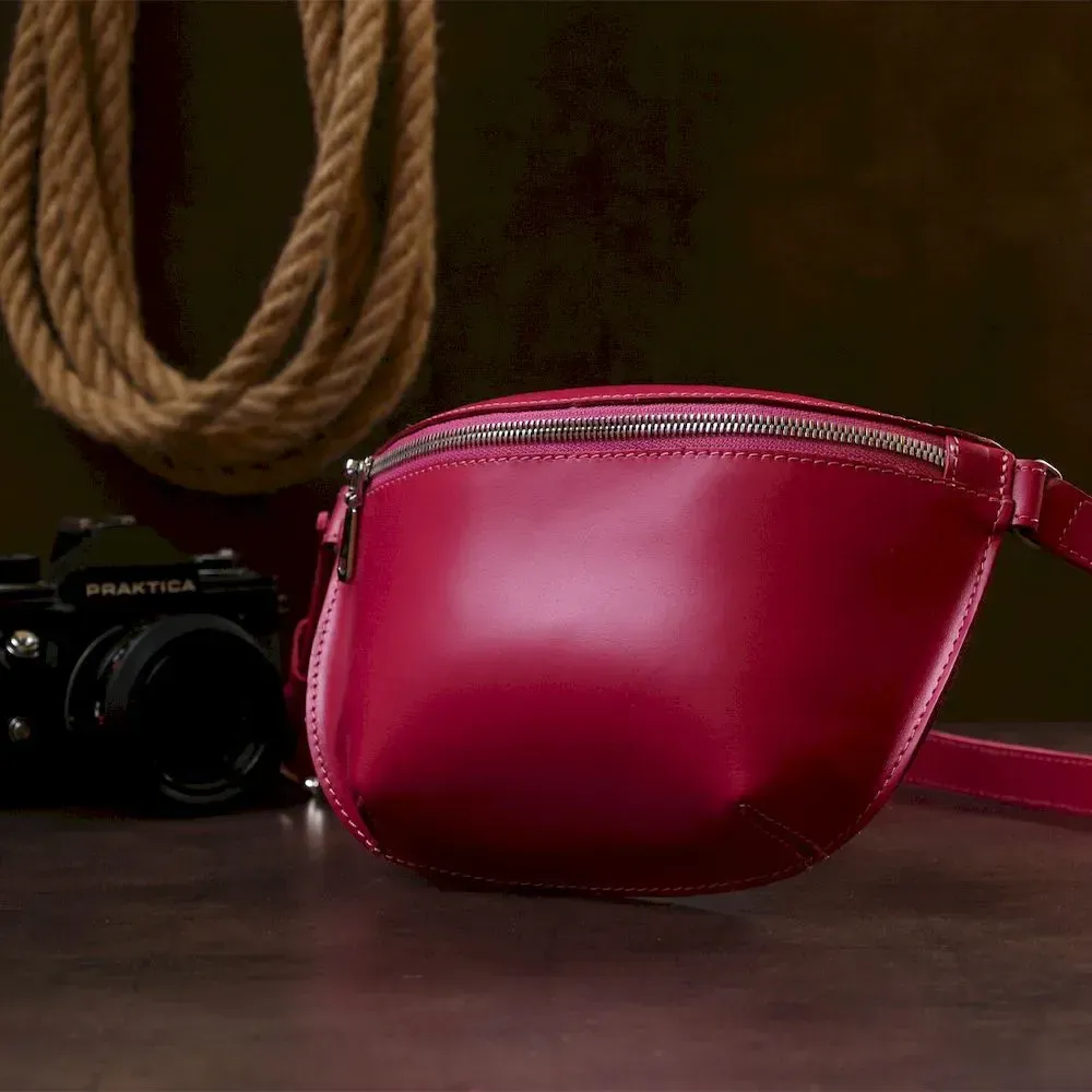 Красивая яркая женская сумка на пояс из натуральной кожи высокого качества. Имеет насыщенный малиновый цвет, который смотрится очень модно и свежо. Основное отделение закрывается на молнию, ремешок выполнен также из кожи и может регулироваться по длине. Такая сумка станет незабываемым подарком на любой праздник.