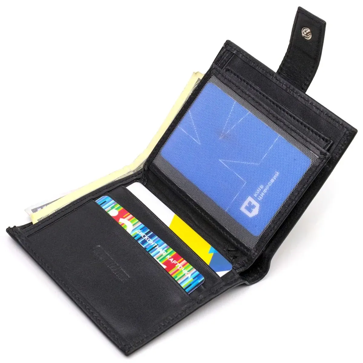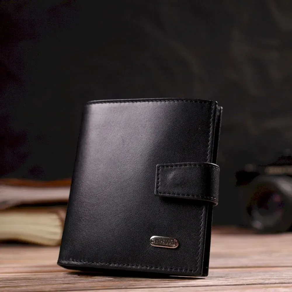 Небольшой мужской кошелек из натуральной гладкой кожи вертикального формата. Аксессуар имеет основное отделения с перегородкой, пять отсеков для карточек, два прилегающих кармана, прозрачный карман для документов и монетницу. Закрывается аксессуар хлястиком на кнопку. Отличный аксессуар от надежного производителя, который прослужит очень долго.