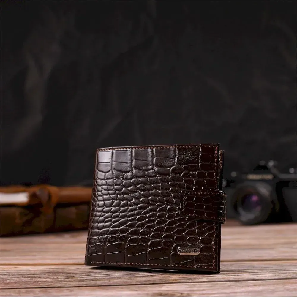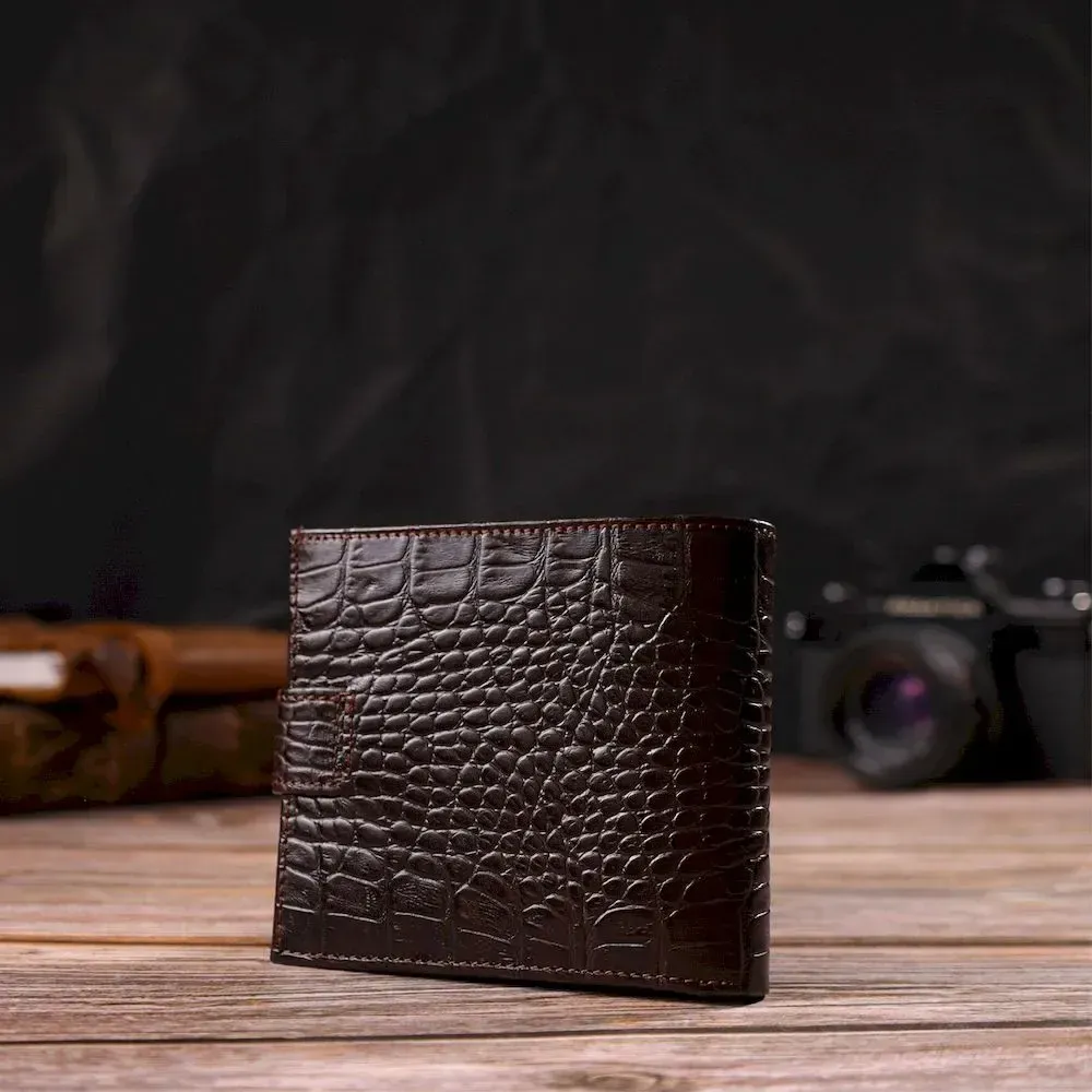 Модный мужской бумажник из натуральной кожи с тиснением под крокодила. Аксессуар имеет основное отделение для купюр, три ячейки для карточек, два кармана под сеточкой, карман на молнии через всю длину и монетницу, что закрывается клапаном на кнопку. Кошелек складывается пополам и закрывается хлястиком на кнопку. На лицевой стороне в правом нижнем углу, расположен металлический логотип компании производителя. Многофункциональный мужской бумажник из очень прочной кожи отличный выбор подарка для солидного мужчины.