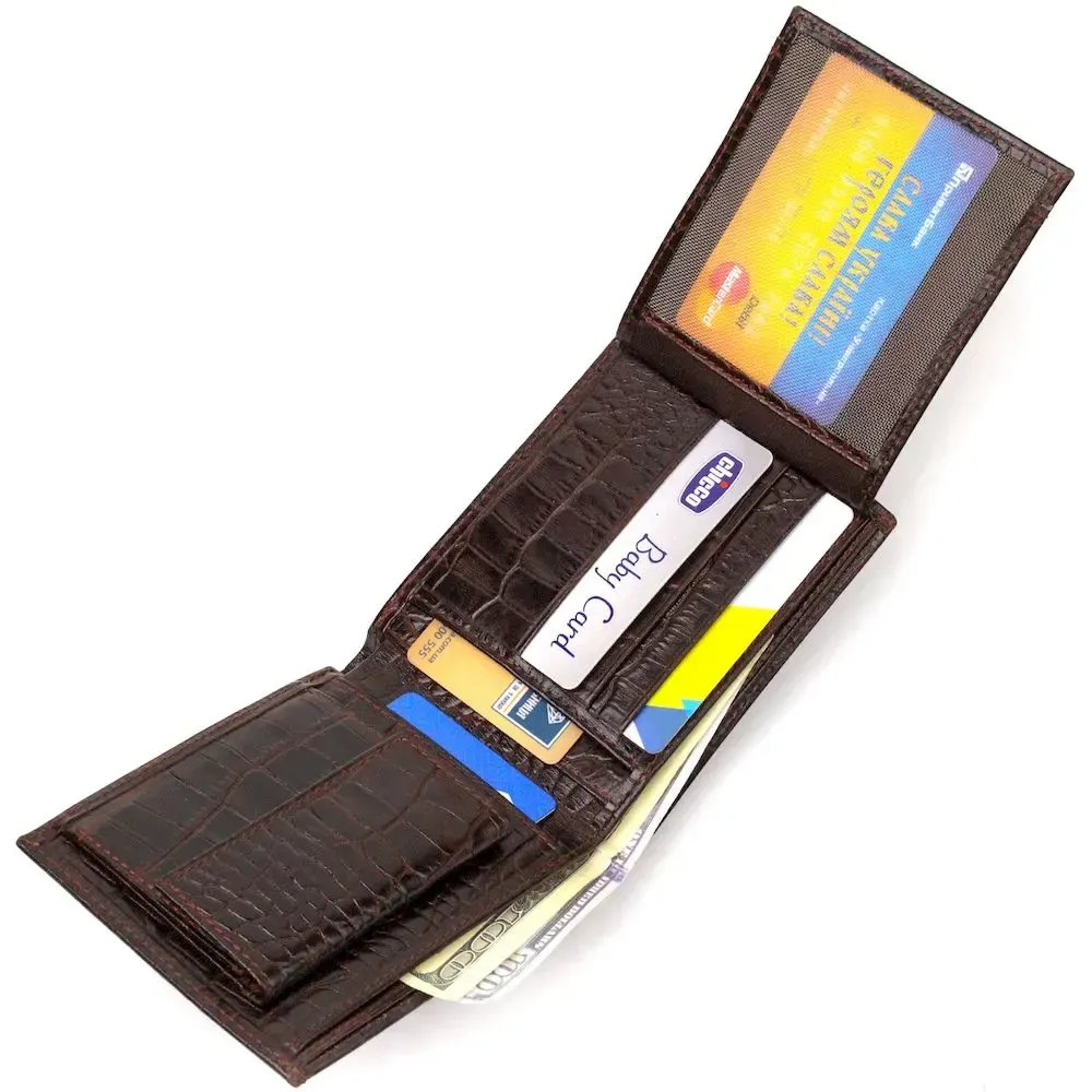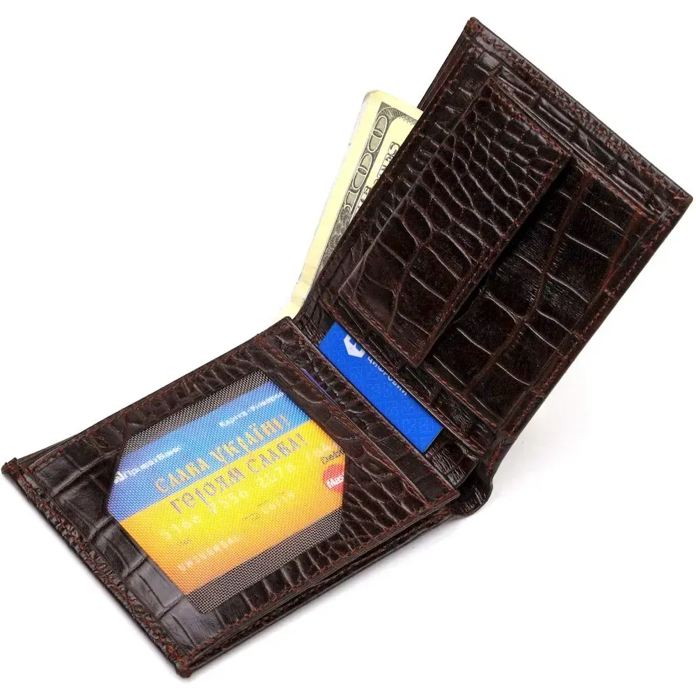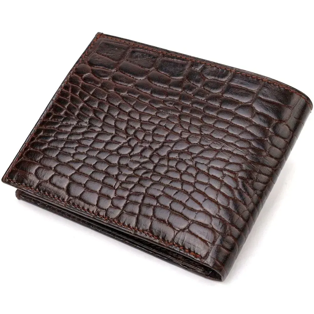 Великолепный мужской кошелек в красивом коричневом цвете, из натуральной кожи с тиснением под крокодила. Аксессуар имеет одно основное отделение с перегородкой, в которое помещаются купюры всех номиналов, четыре кармана для карточек, два кармана под сеточкой для документов, монетницу и три прилегающих кармана. Закрывается аксессуар пополам без застежки. Упакован бумажник картонную коробку. Кожаный кошелек является отменным подарком для родных и близких людей.
