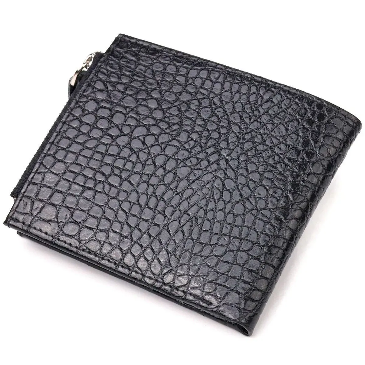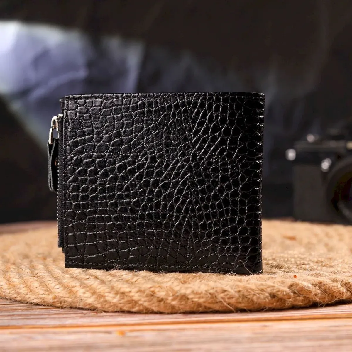 Оригинальный кошелек для мужчин, из натуральной фактурной кожи, с тиснением под крокодила. Аксессуар имеет одно основное отделение с перегородкой, в которое помещаются купюры всех номиналов, девять карманов для карточек, два из которых под сеточкой, монетницу на молнии, пять прилегающих карманов, а также автономный блок для карт, который расположен в одном из прилегающих карманов. Закрывается аксессуар хлястиком на кнопку. Цвет фурнитуры – серебро. Кожаный кошелек является отменным подарком для родных и близких людей.