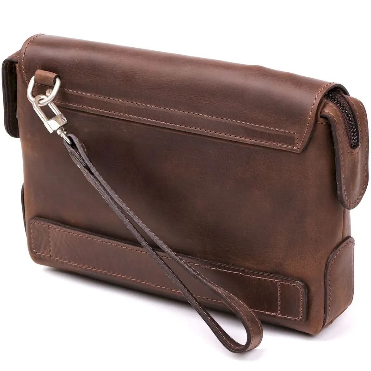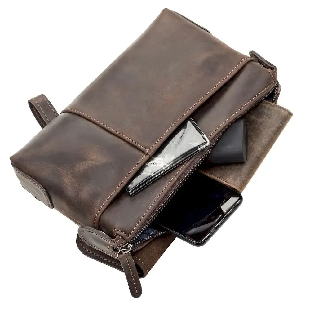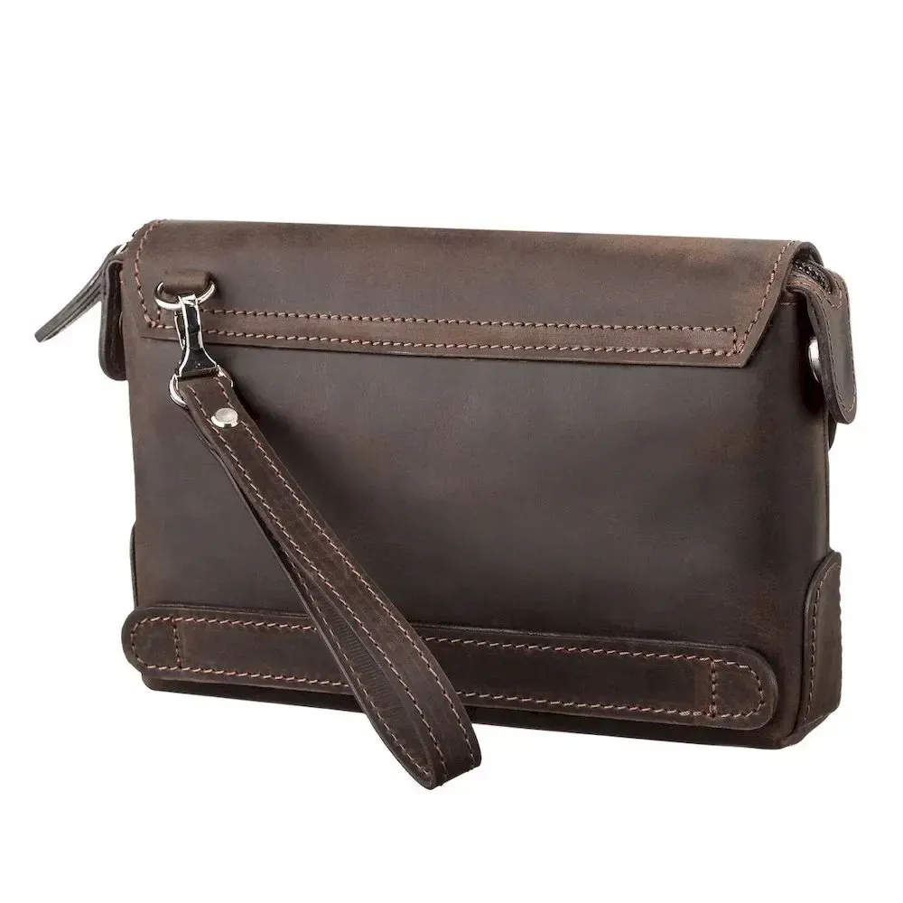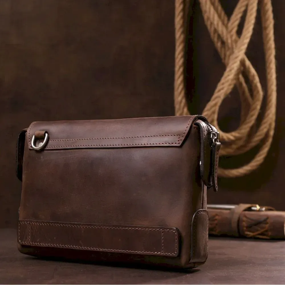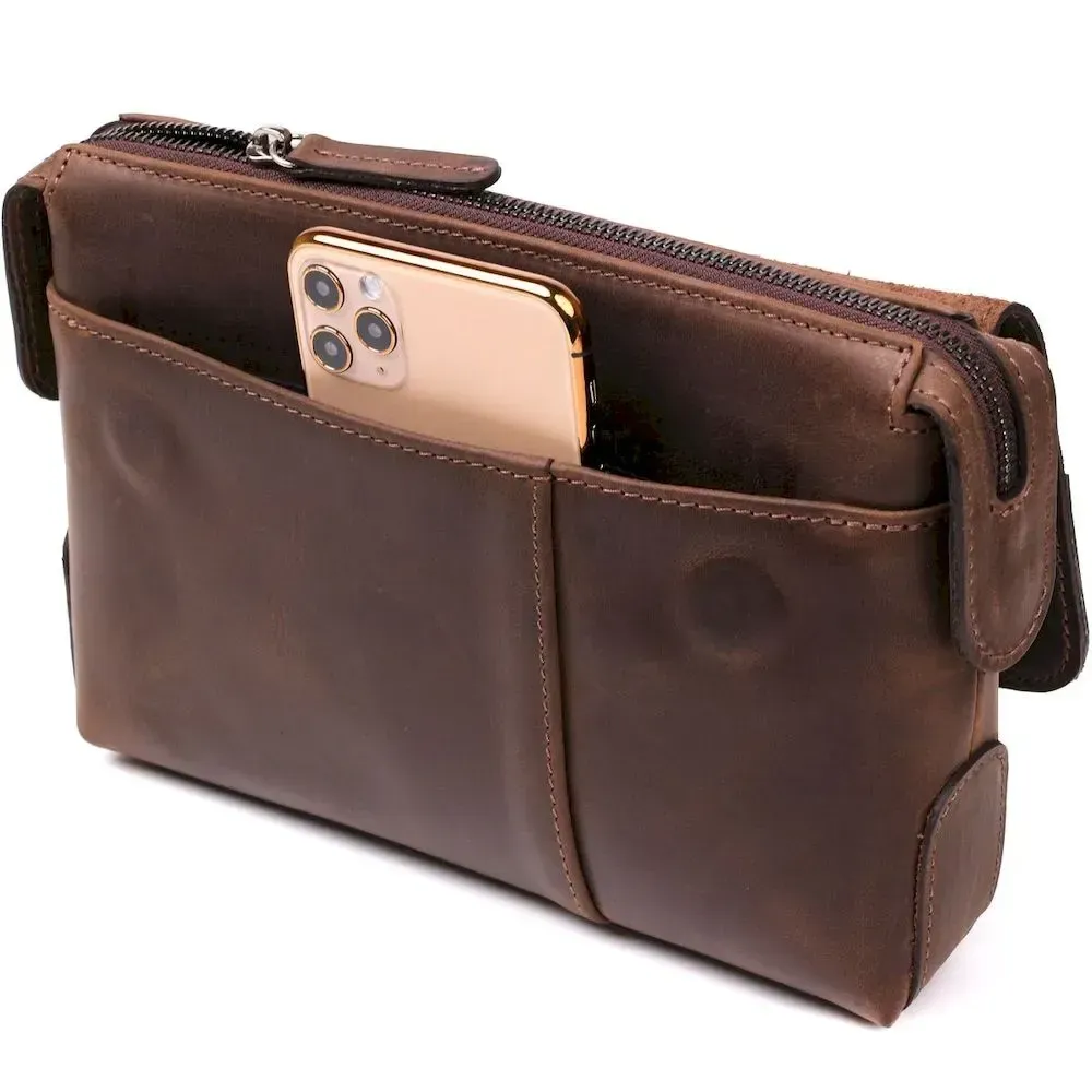 Интересная мужская сумка-клатч из натуральной высококачественной винтажной кожи, особенностью, которой есть потертости и неоднородность окраса. Данный аксессуар не только функционален в использовании,