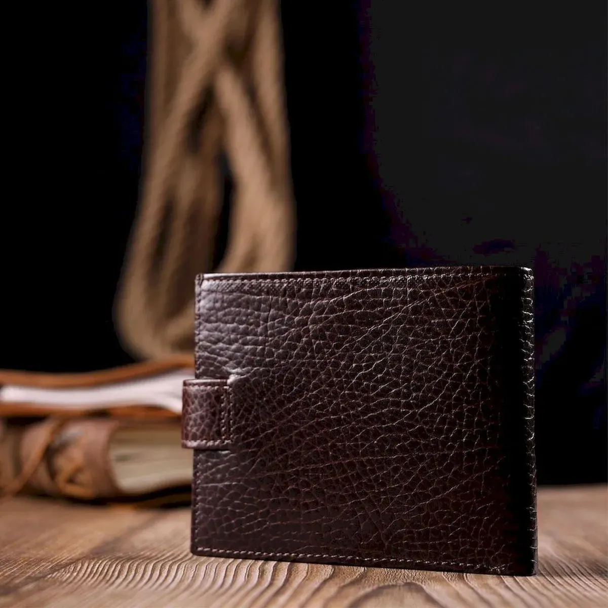 Стильный мужской кошелек из натуральной кожи, в коричневом цвете. Изделие закрывается хлястиком на кнопку. Компактный аксессуар который легко помещается в карман или руку. Изделие упаковано в фирменную коробочку. Изделия из натуральной кожи всегда будут отличным подарком для близкого человека.