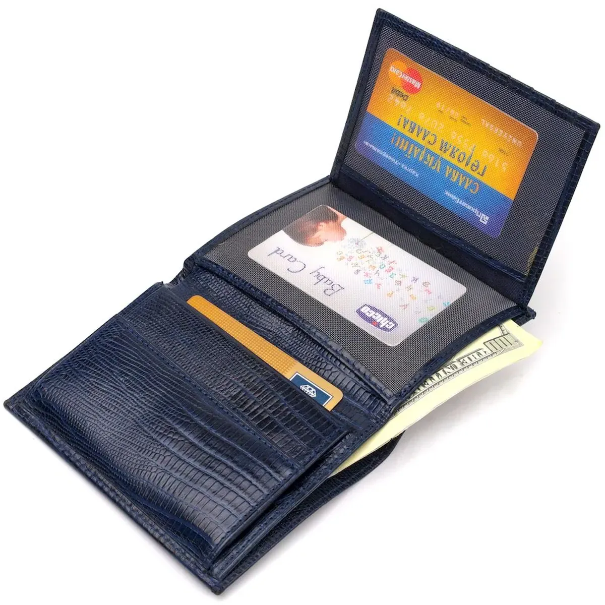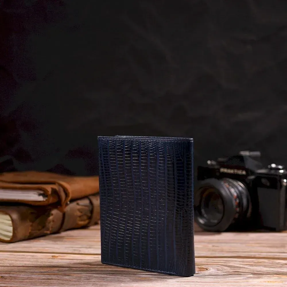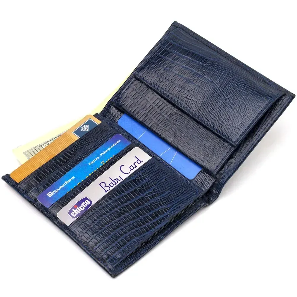 Лакированный мужской кошелек в красивом синем цвете, из натуральной фактурной кожи. Аксессуар имеет одно основное отделение с перегородкой, в которое помещаются купюры всех номиналов, шесть карманов для карточек, два кармана под сеточкой для документов, монетницу и один прилегающий карман. Закрывается аксессуар пополам без застежки. Упакован бумажник картонную коробку. Кожаный кошелек является отменным подарком для родных и близких людей.