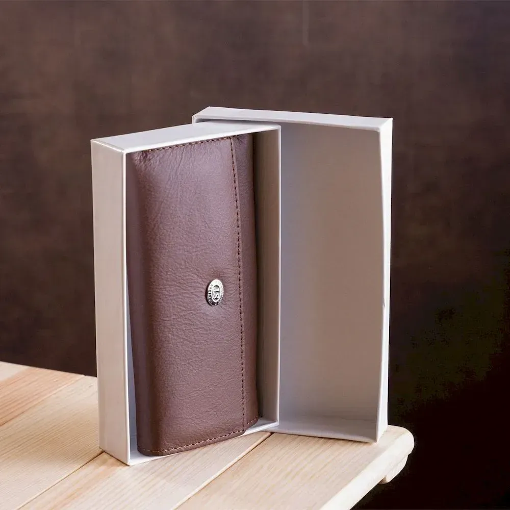 Элегантная ключница для мужчин, которая легко выполняет функции мини-бумажника. Сделана из высококачественной кожи стильного коричневого цвета. Имеет полноценное отделение для купюр, а также отделение на молнии для других ценных вещей. Если Вы по своей натуре минималист и не любите большие громоздкие кошельки, но при этом Вам необходимо с собой всегда иметь деньги, ключи и прочие мелочи, то данный аксессуар просто идеально подходит под эти требования. Также бумажник-ключница имеет крючок, чтобы прицепить его или на пояс, или на любой другой аксессуар. Упаковано данное изделие в плотную картонную коробку белого цвета.
