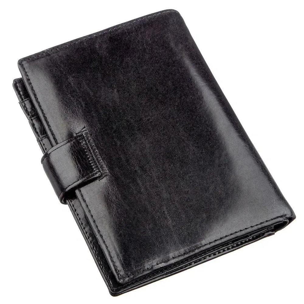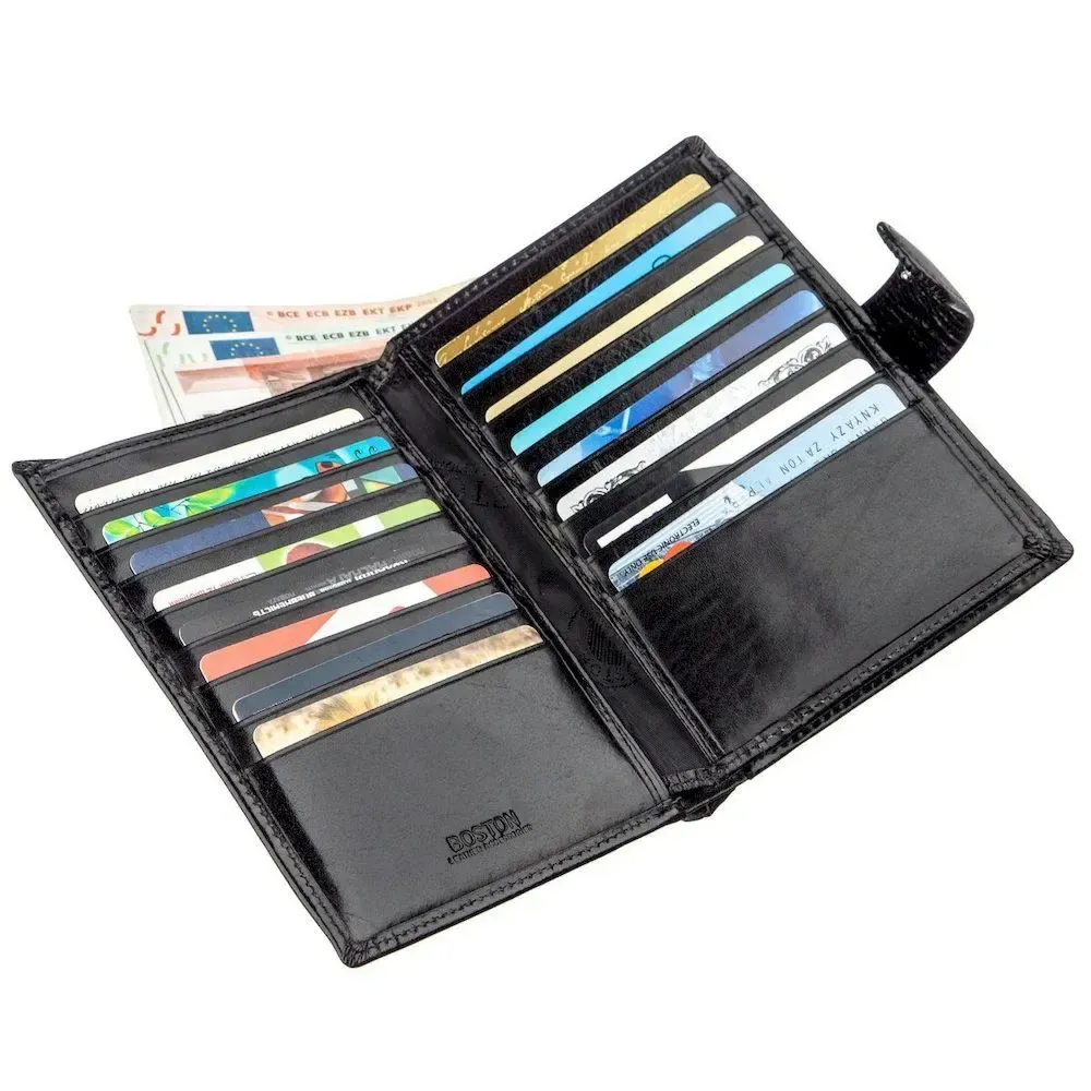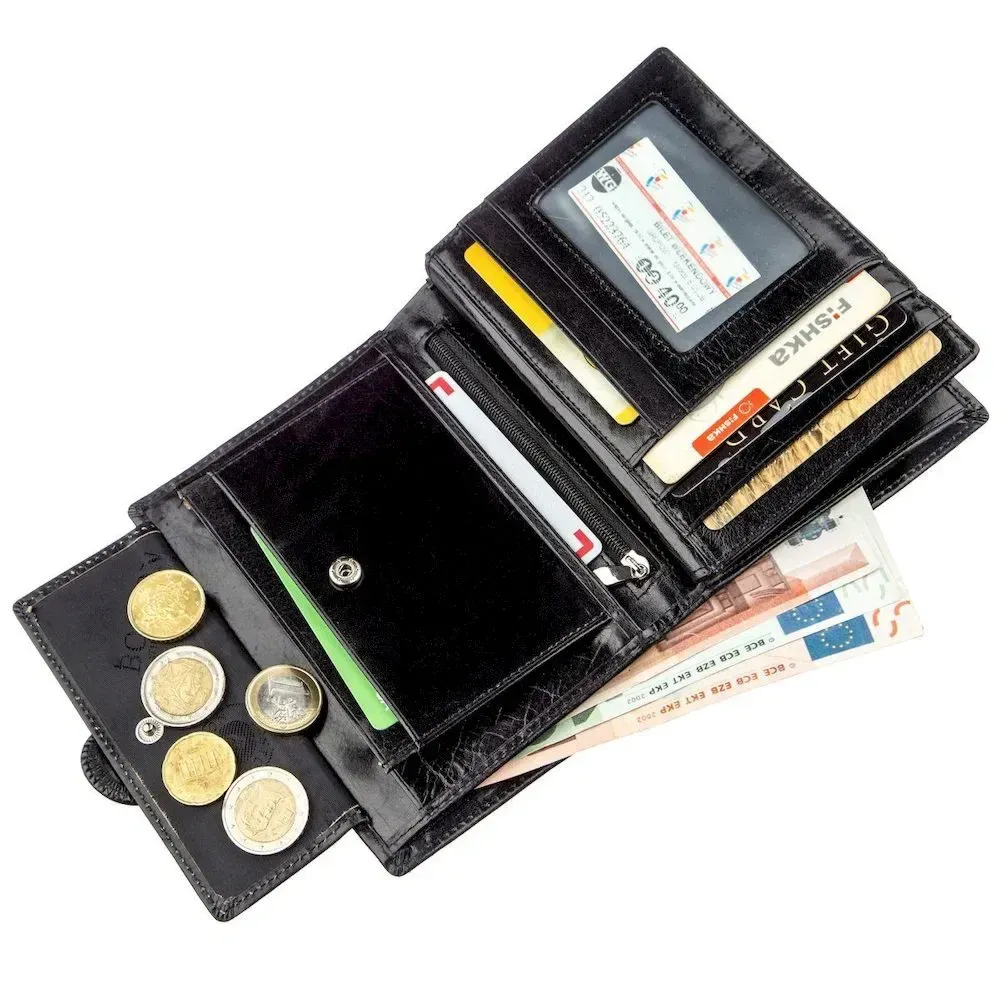 Вместительный бумажник для мужчин из натуральной кожи элегантного черного цвета. В таком бумажнике поместятся все Ваши карточки, в этом Вы можете быть точно уверенными, ведь кошелек имеет двадцать необходимых для этого отделений. Также в нем есть большое отделение для купюр, что очень удобно в современной жизни. С таким бумажником Вы точно будете знать, что все необходимое находится при Вас. Также этот кошелек станет идеальными подарком для мужчины в любом возрасте. Продается бумажник в фирменной картонной упаковке белого цвета.