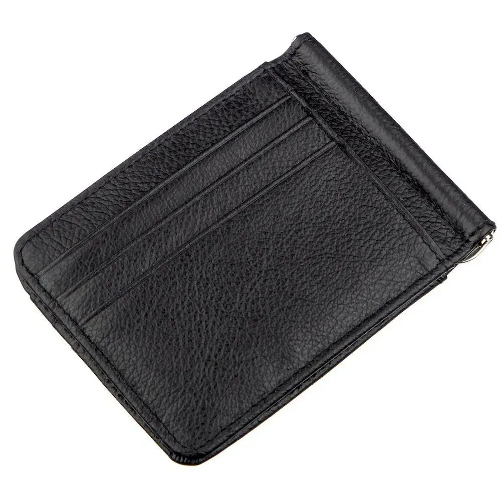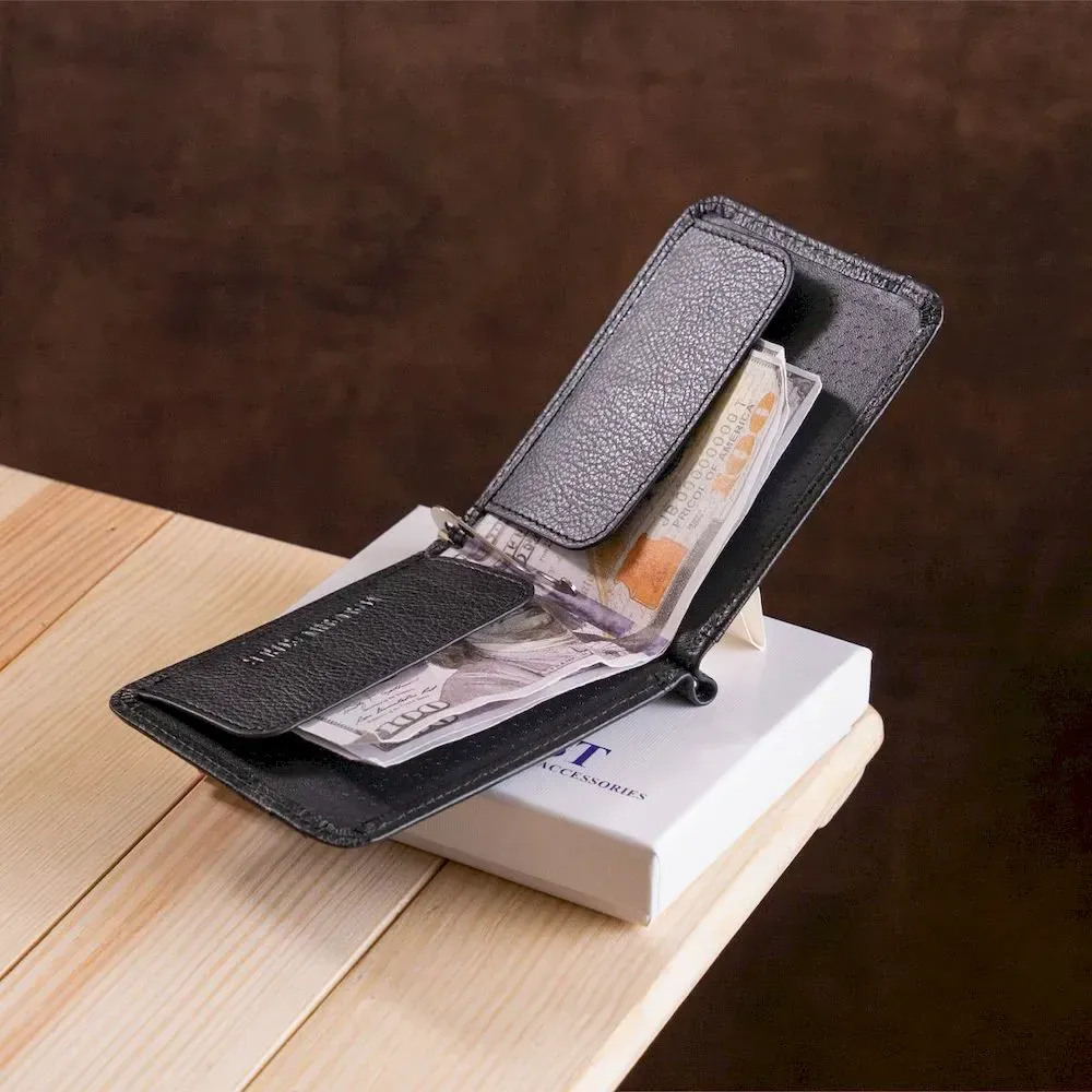 Универсальный мужской зажим в деловом и практичном дизайне. Станет неотъемлемой частью гардероба для тех мужчин, которые исповедуют стиль минимализма. Выполнен он из добротной натуральной кожи с мягкой зернистой фактурой. Черный цвет изделия является самым ходовым и универсальным в наше время. Кроме металлического зажима для купюр и банкнот, в этой модели предусмотрены карманы для Ваших кредитных или визитных карт, которые расположены на внешней стороне аксессуара. Данное изделие станет прекрасным приобретением не только для Вас лично, но и для подарка близкому человеку. Упакован зажим в фирменную картонную коробку.