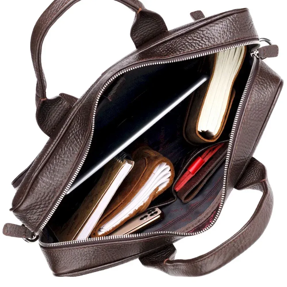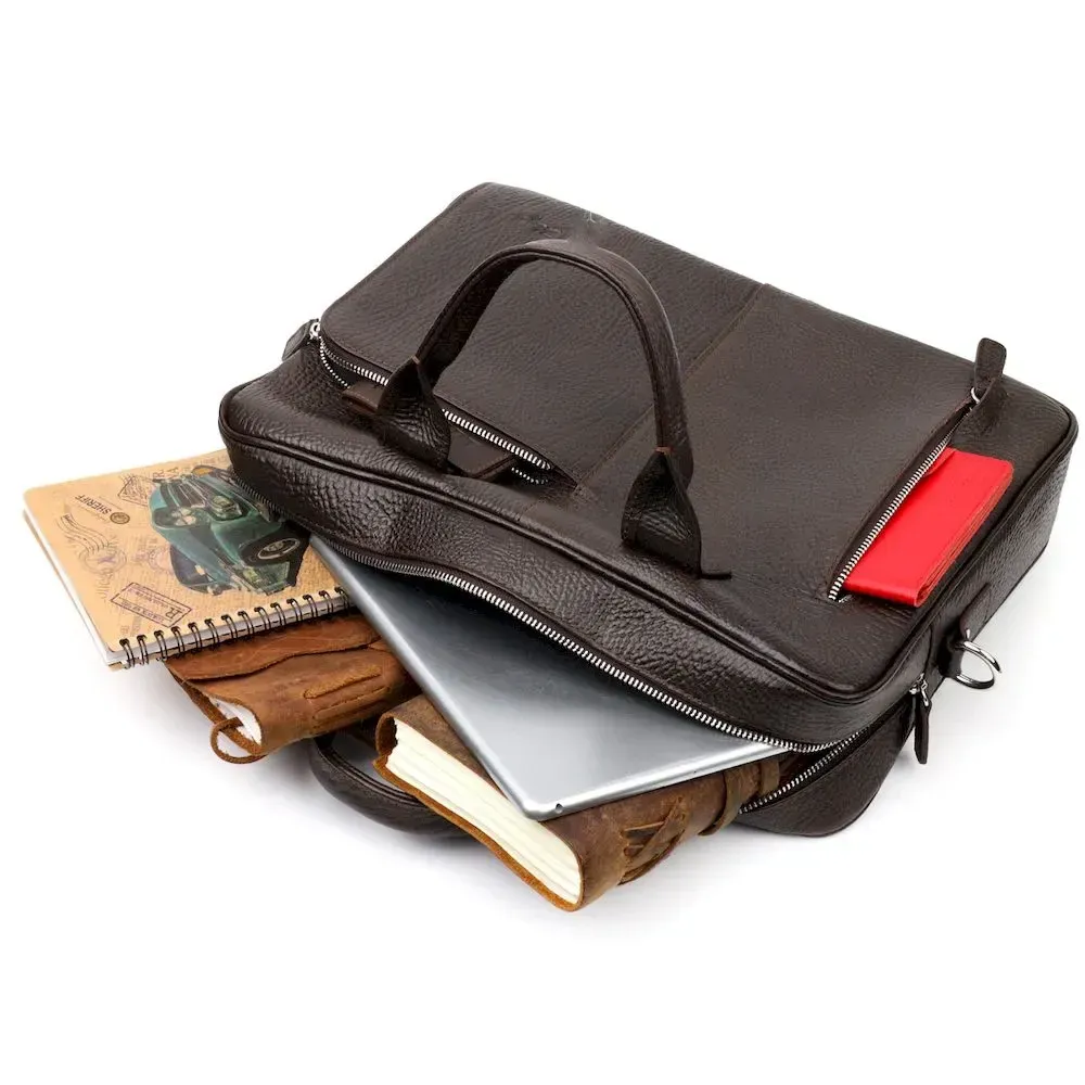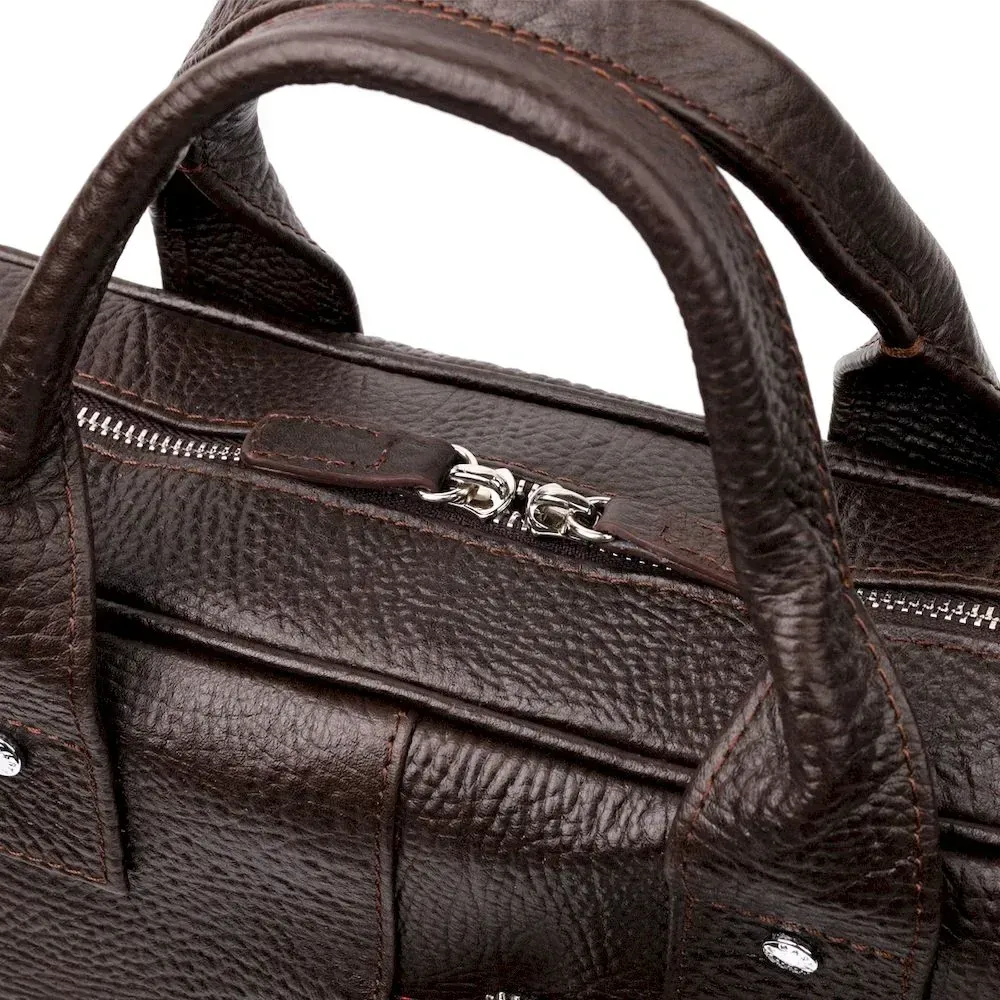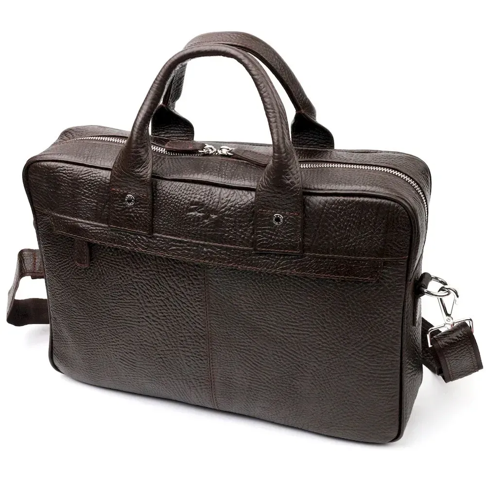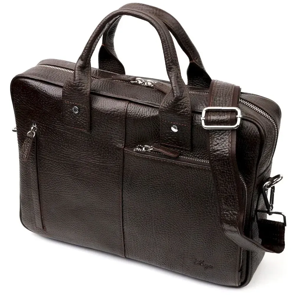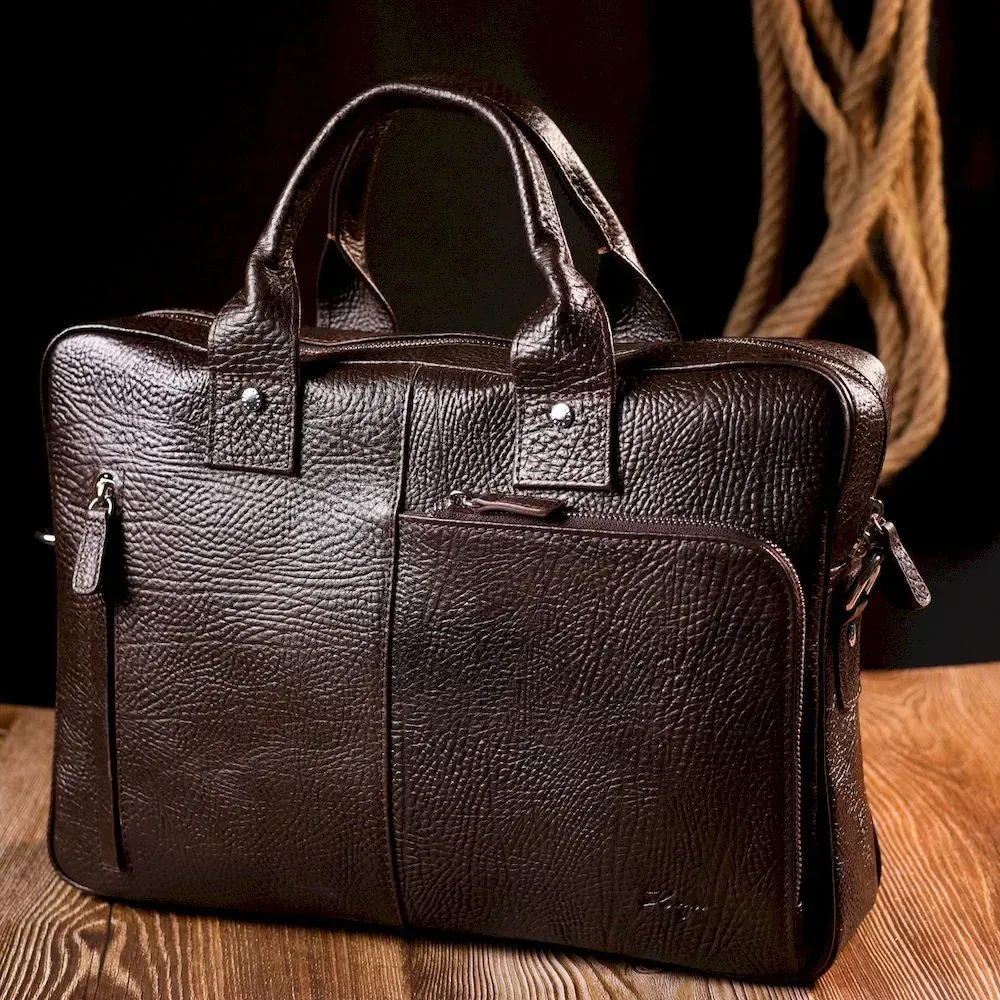 Практичный портфель из натуральной кожи. Удобная и многофункциональная модель. Модель дополнена фурнитурой цвета серебра, плюс резиновые ножки для защиты внешнего дна сумки. Внутри сумки качественная подкладка. Сумку можно переносить в руке при помощи удобных кожаных ручек, а также через плечо (в комплекте съемный, регулируемый плечевой ремень, который выполнен в комбинации текстильного материала и натуральной кожи). Будет идеальным вариантом для подарка близкому человеку.