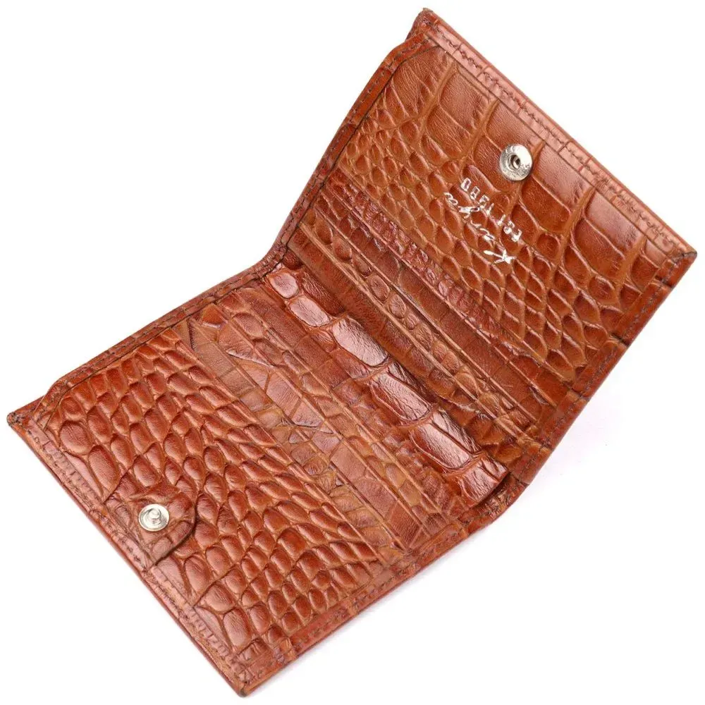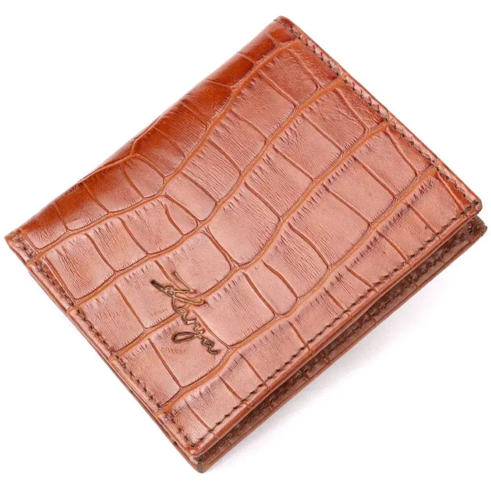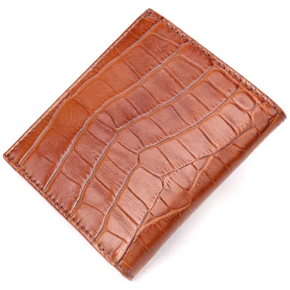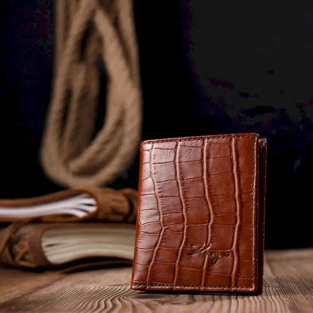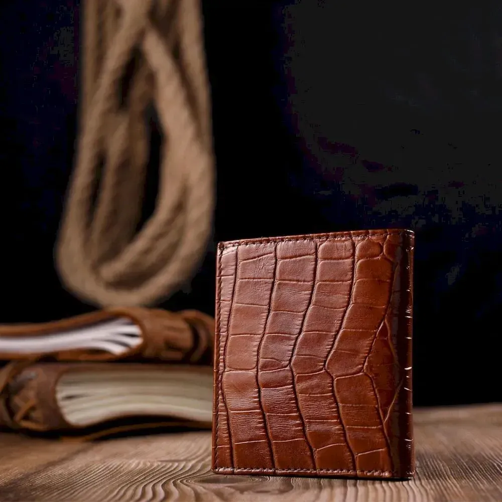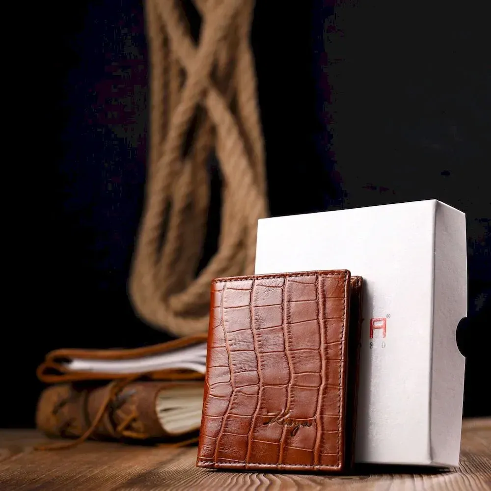 Компактный мужской кошелек из натуральной кожи с тиснением под рептилию, в коричневом цвете. Изделия закрывается на кнопку. Аксессуар упакован в фирменную коробочку. Изделия из натуральной кожи всегда будут отличным подарком для близкого человека.