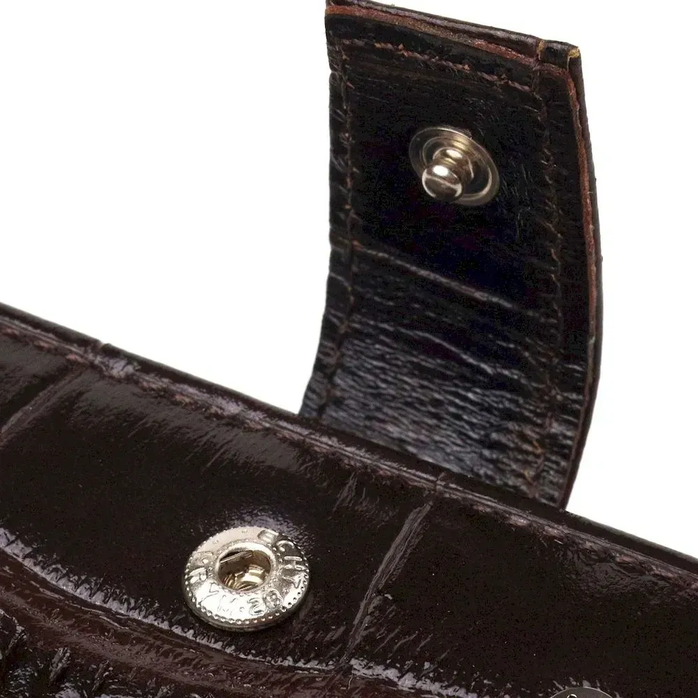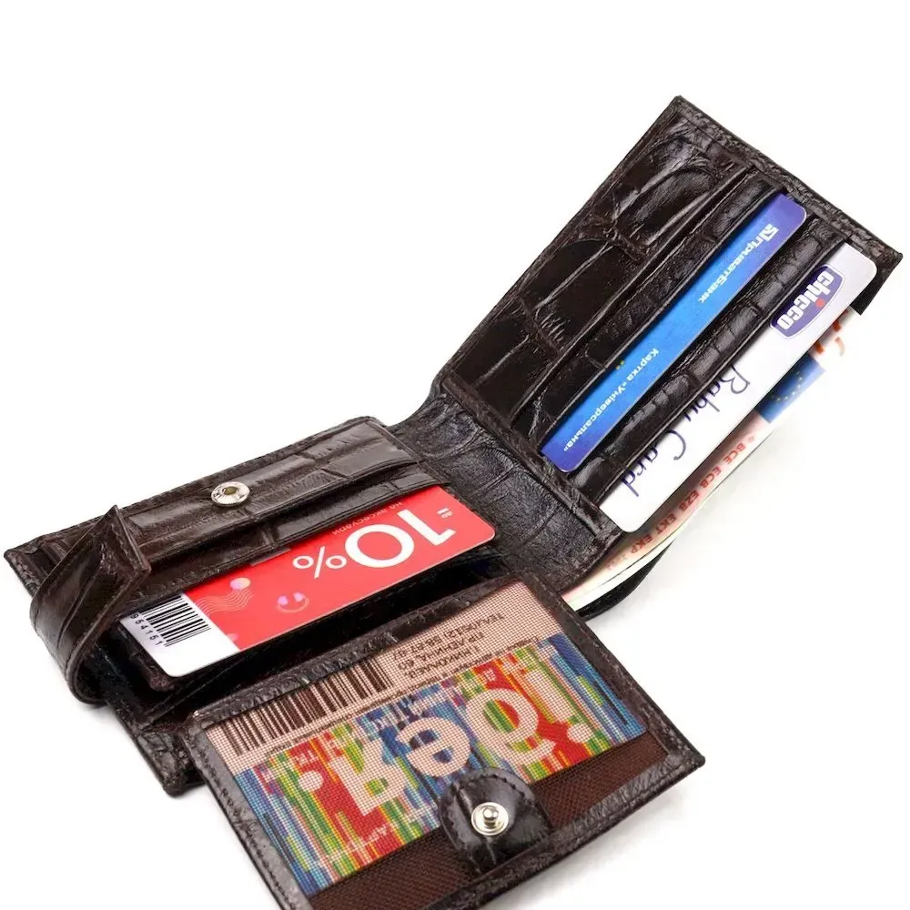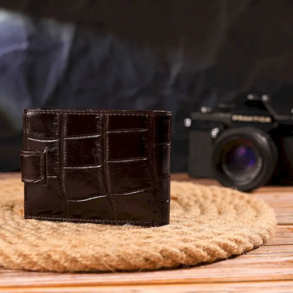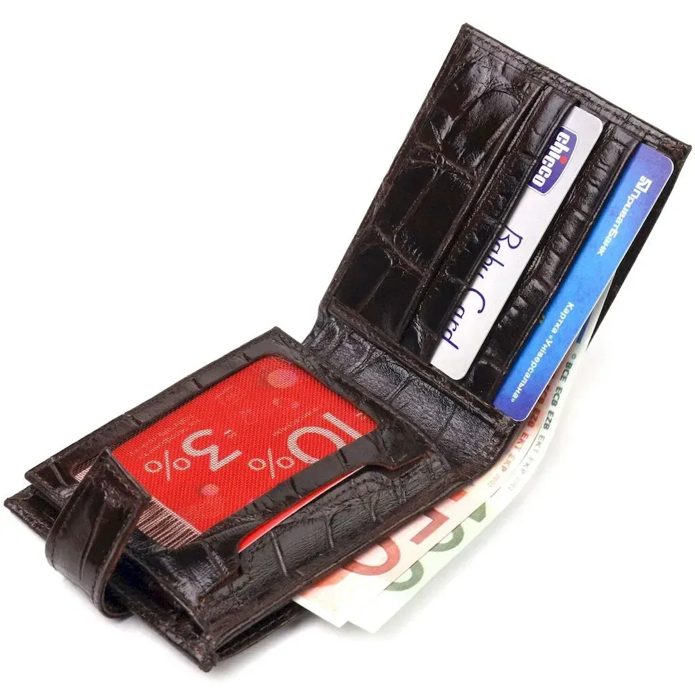 Интересный мужской кошелек, из натуральной фактурной кожи, с крупным тиснением. Аксессуар имеет одно основное отделение с перегородкой, в которое помещаются купюры всех номиналов, девять карманов для карточек, два из которых под сеточкой, монетница и два прилегающих кармана. Закрывается аксессуар хлястиком на кнопку. Цвет фурнитуры – серебро. Вы легко сможете поместить его в карман брюк или маленькую сумку. Упакован бумажник картонную коробку. Кожаный кошелек является отменным подарком для родных и близких людей.