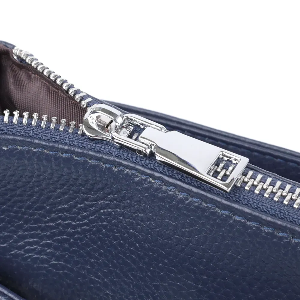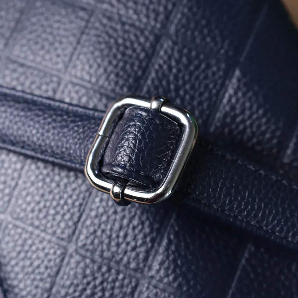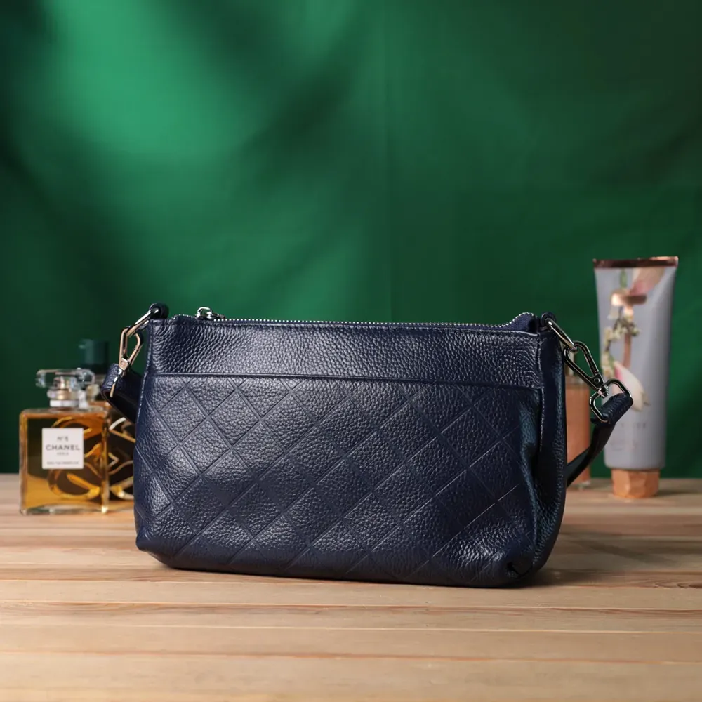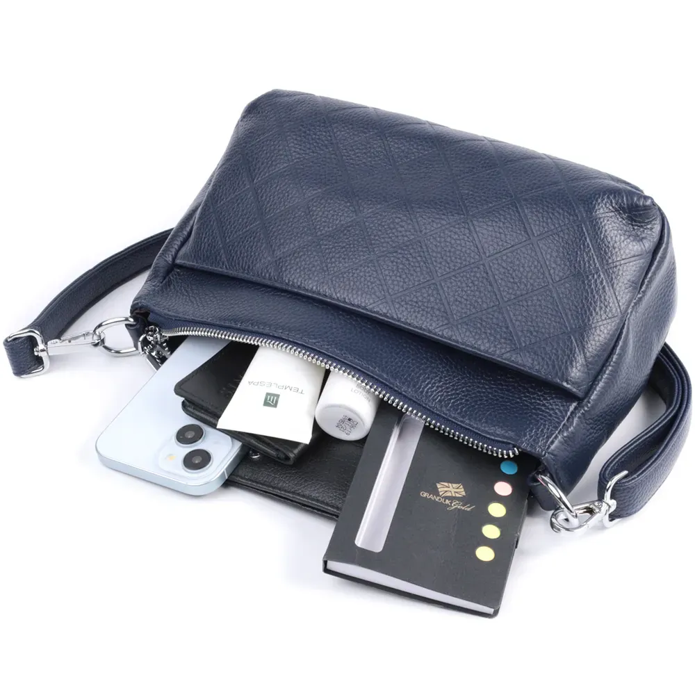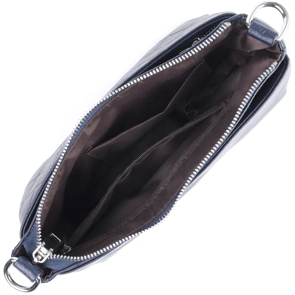 Стильна сумка для жінок у красивому синьому кольорі з натуральної шкіри високої якості. Виріб дуже зручний, можна носити на плечі та в руках. На лицьовій стороні сумка декорована ромбоподібним тисненням, що надає особливого шарму виробу. Модель доповнена фурнітурою кольору срібла. Аксесуар має три відділення, і дві кишеньки - одна на блискавці та одна відкритого типу, у відділенні, що посередині. Ідеальний варіант сумки на кожен день.