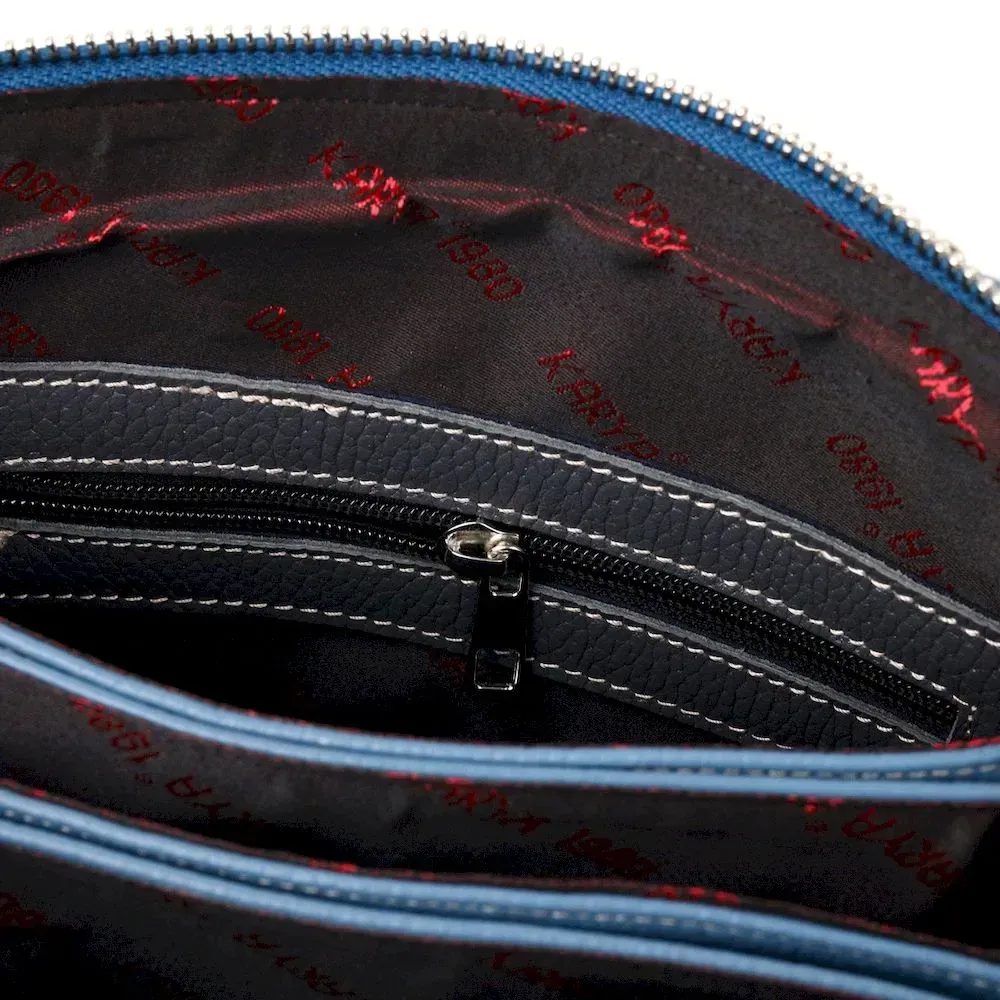 Женская компактная сумка небольшого размера из натуральной кожи, в красивом голубом цвете. Фурнитура серебряного цвета. Сумку удобно носить на плече или через плечо. Сумка упакована в фирменный текстильный чехол Karya. Сумка из натуральной кожи всегда будет отличным подарком любой женщине.