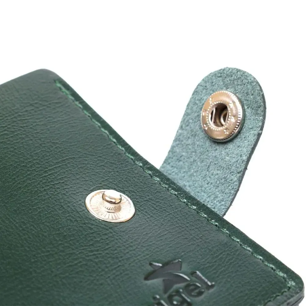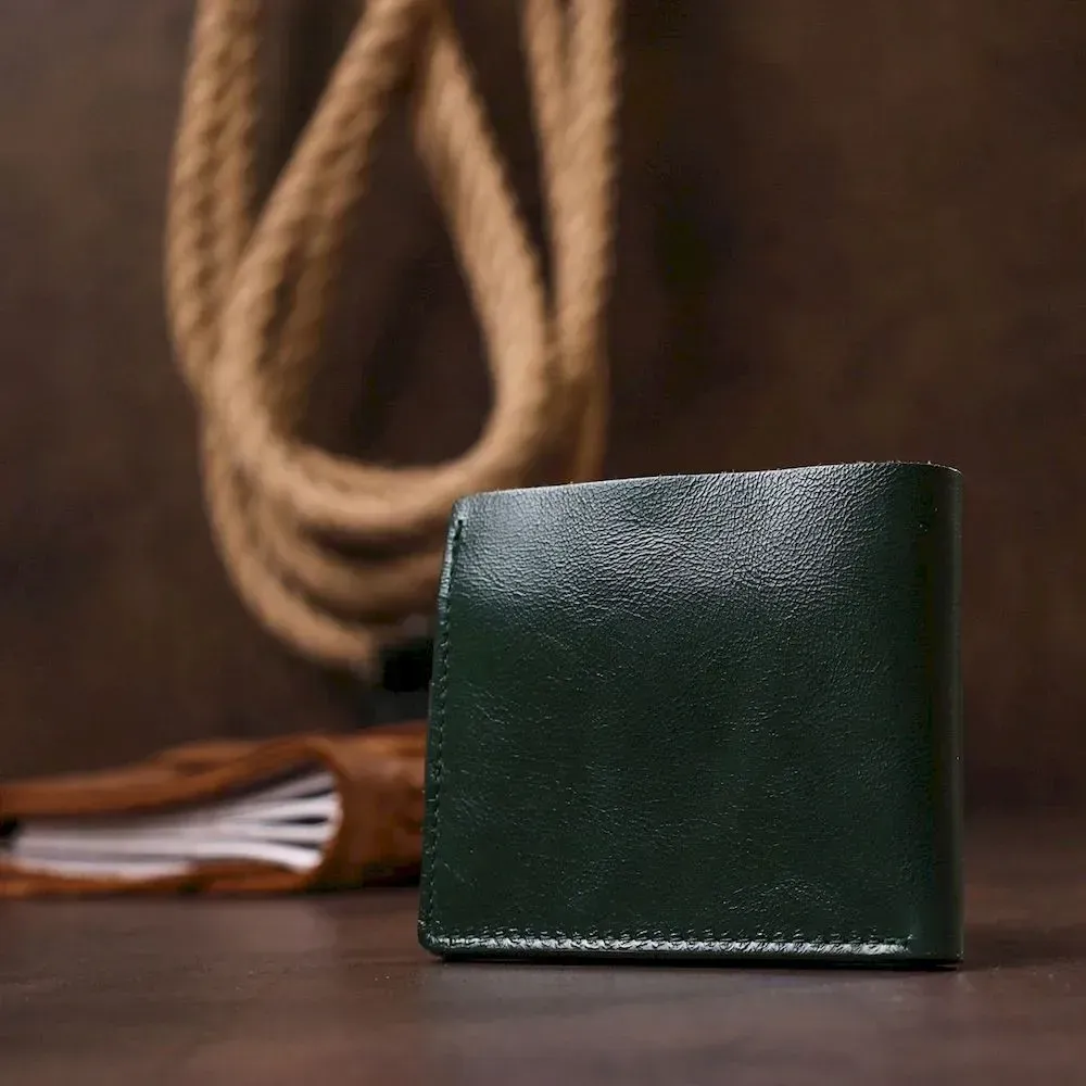 Современное портмоне в два сложения от украинского производителя. Выполнено изделие из натуральной кожи высокого класса и улучшенной прочности. Внутри есть вместительное основное отделение для купюр, слоты для визитных и кредитных карточек и компактная монетница на кнопке для мелочи. Цвет изделия – зеленый, фактура гладкая с легким отливом.