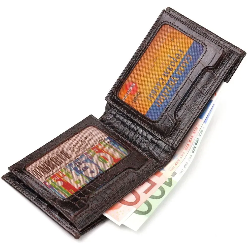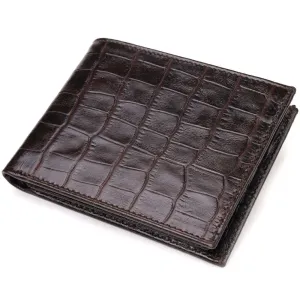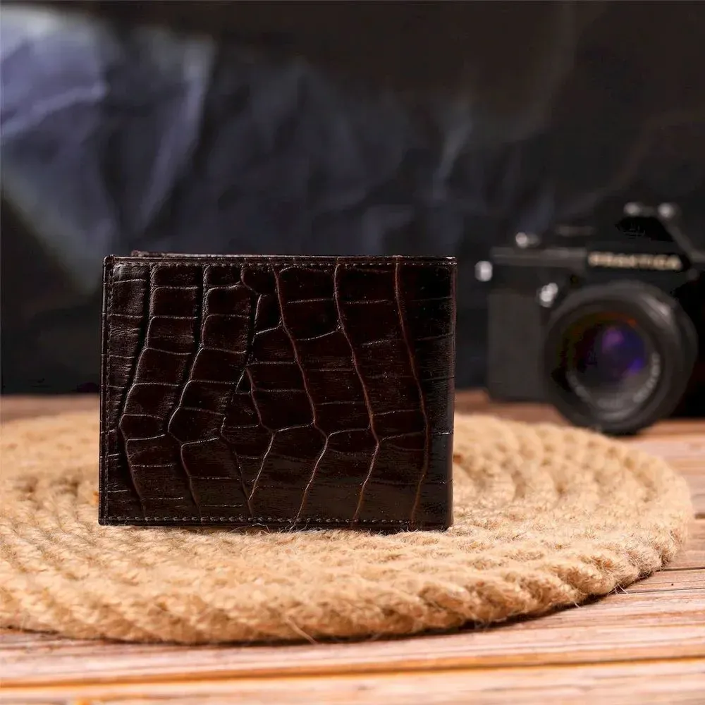 Компактный мужской бумажник, из натуральной фактурной кожи, с тиснением под крокодила. Аксессуар имеет одно основное отделение с перегородкой, в которое помещаются купюры всех номиналов, двенадцать карманов для карточек, четыре из которых под сеточкой. Вы легко сможете поместить его в карман брюк или маленькую сумку. Упакован бумажник картонную коробку. Кожаный кошелек является отменным подарком для родных и близких людей.