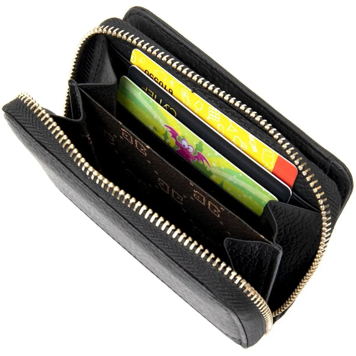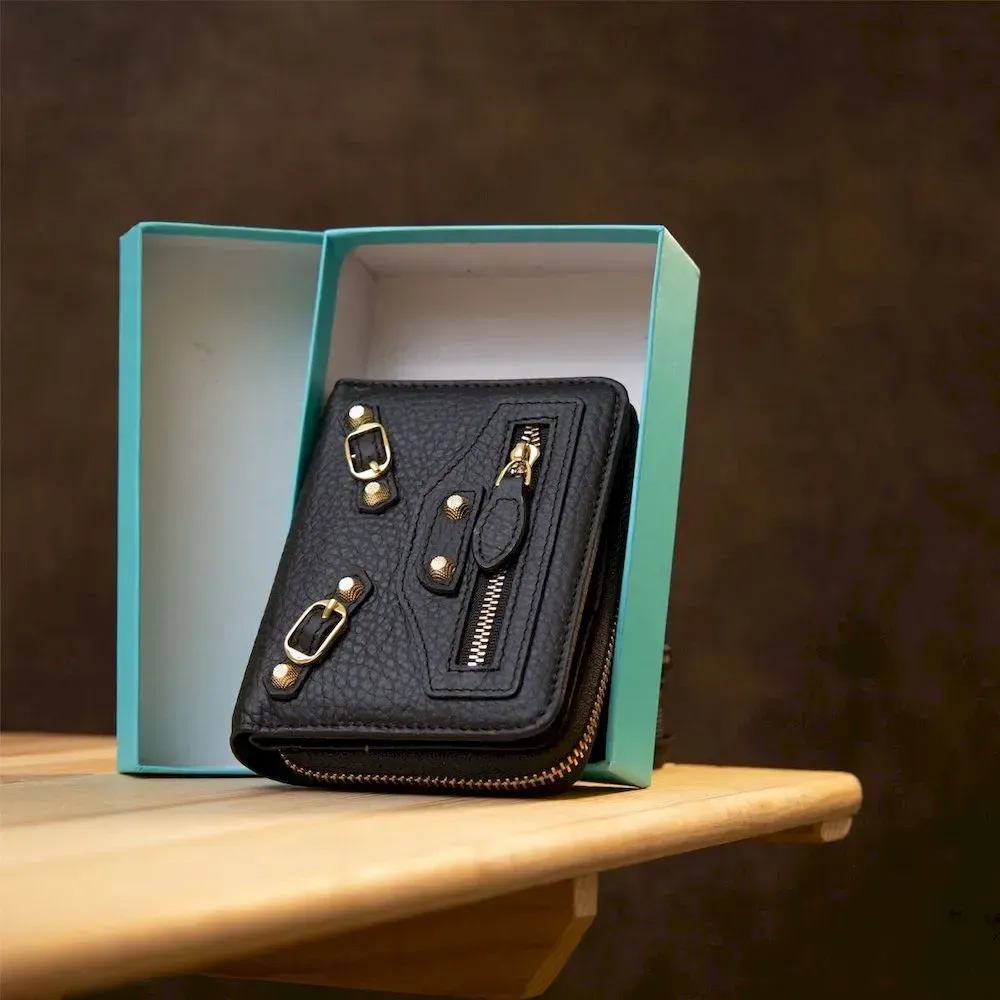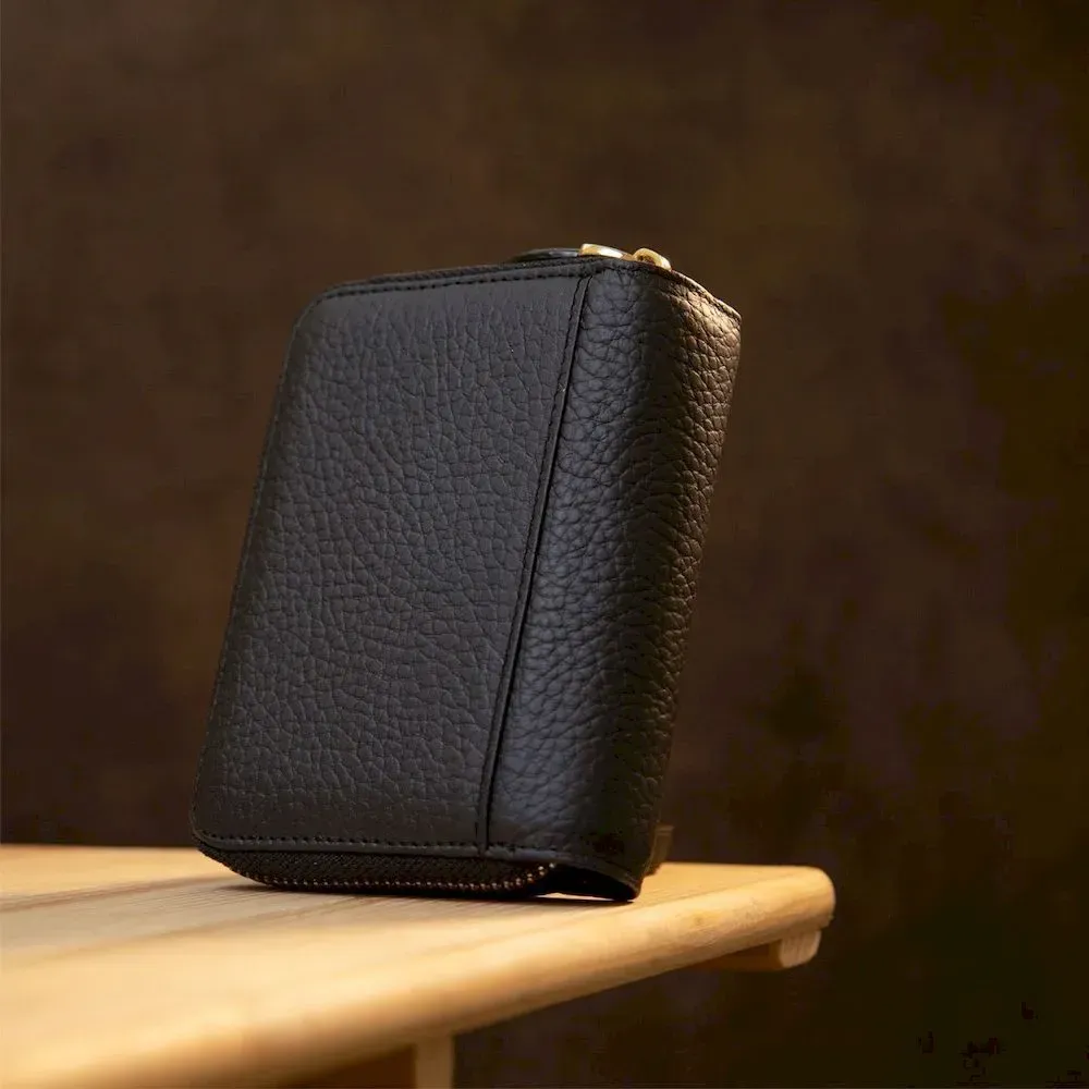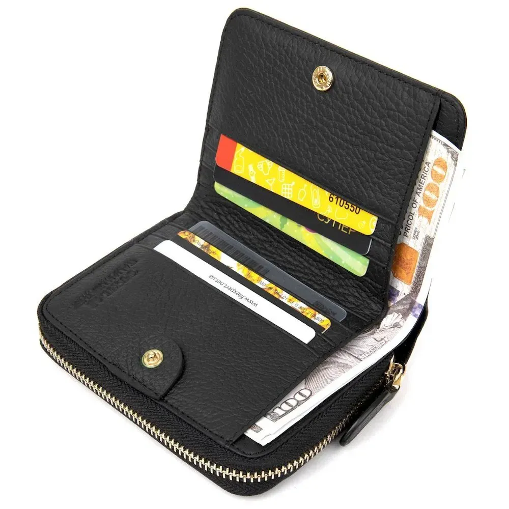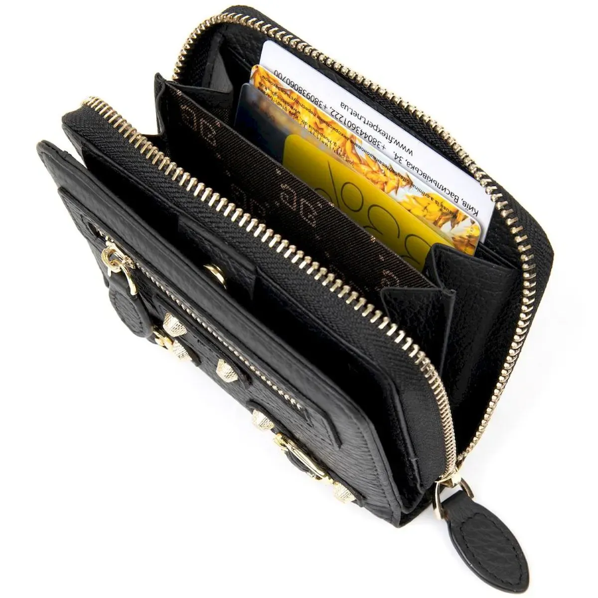 Отличная модель для тех, кто ищет себе небольшой, но вместительный кошелек в оригинальном дизайне. Выполнен из натуральной кожи высокого качества и имеет матовую фактуру. Внутри есть отделения для карточек, купюр и монет. На внешней стороне также имеется маленький кармашек на молнии. Черный цвет изделия красиво сочетается с фурнитурой под золото.
