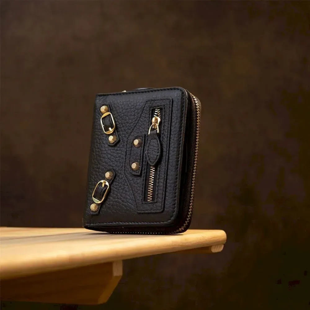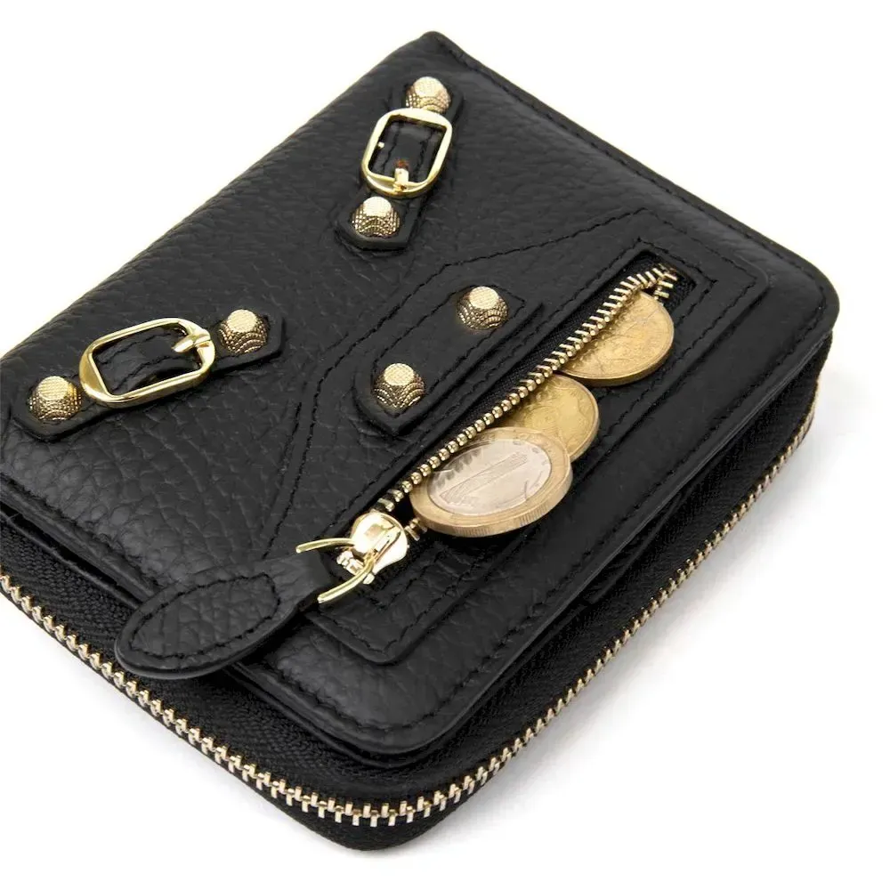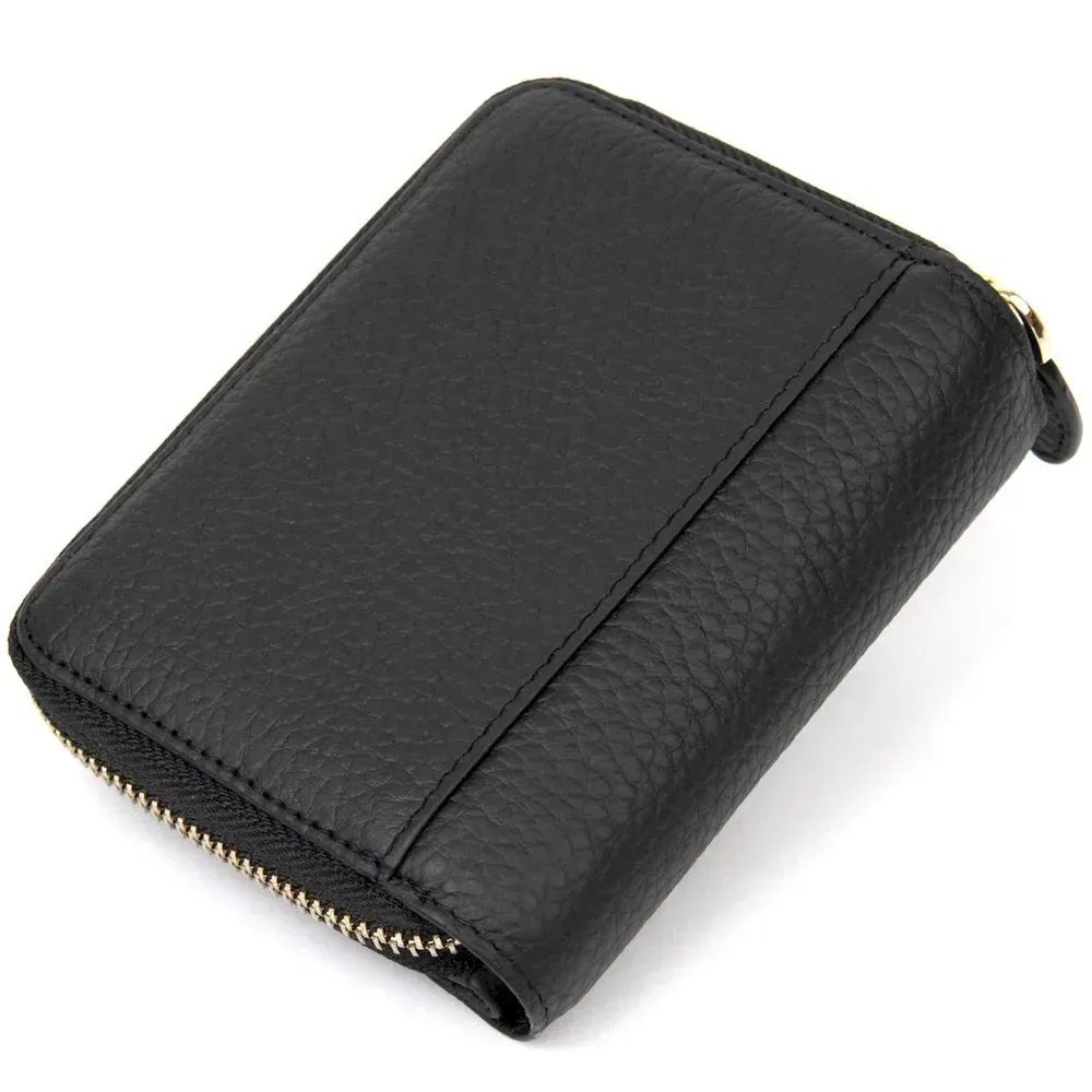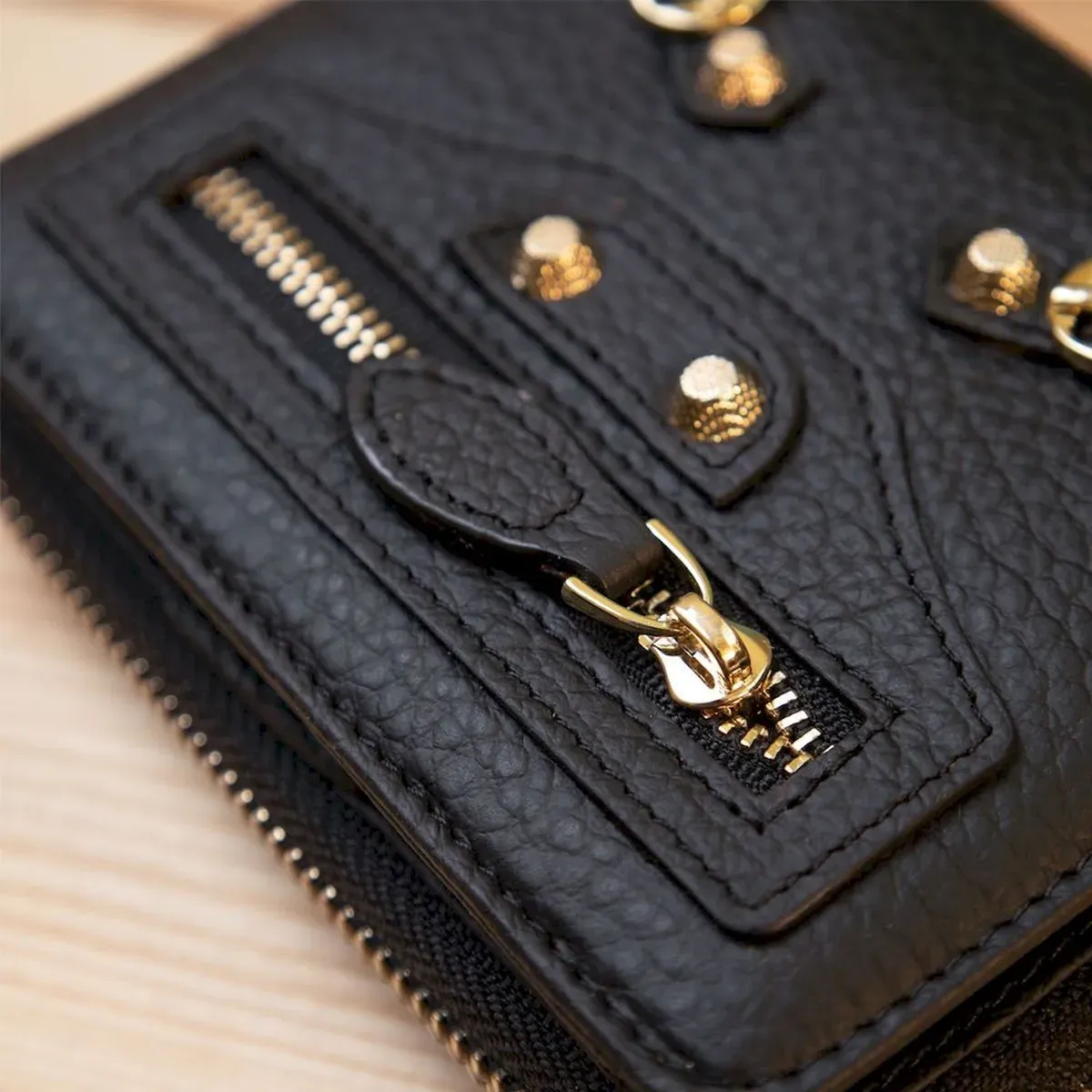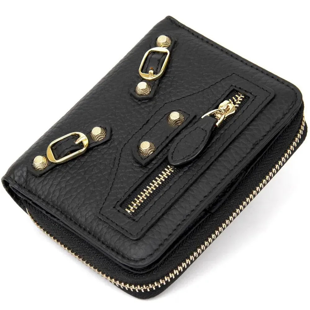 Отличная модель для тех, кто ищет себе небольшой, но вместительный кошелек в оригинальном дизайне. Выполнен из натуральной кожи высокого качества и имеет матовую фактуру. Внутри есть отделения для карточек, купюр и монет. На внешней стороне также имеется маленький кармашек на молнии. Черный цвет изделия красиво сочетается с фурнитурой под золото.