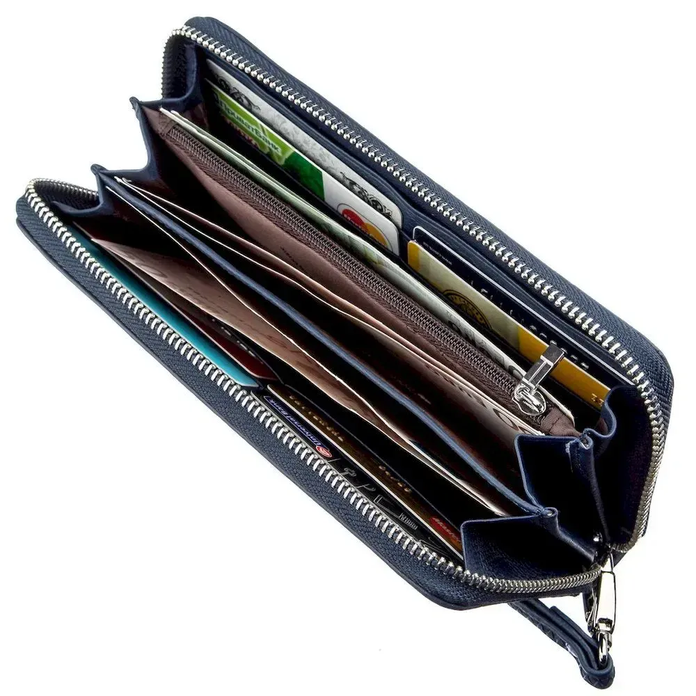Презентабельный женский клатч для деловых и прагматичных дам. Имеет строгий и современный дизайн. Изготовлен из перворазрядной натуральной кожи высокого качества, фактура зернистая и мягкая на ощупь. Цвет изделия – темно-синий с матовым оттенком. Данную модель можно носить как в сумочке, так и на запястье, для этого предусмотрен специальный ремешок. Внутри расположено три основных отделения для купюр, отделение на молнии для ценностей, карманы для визитных и кредитных карт. Закрывается клатч на массивную металлическую молнию в серебренном цвете. Упаковка представлена в виде картонной белой коробки с логотипом производителя.