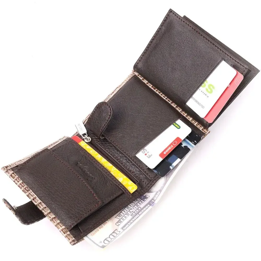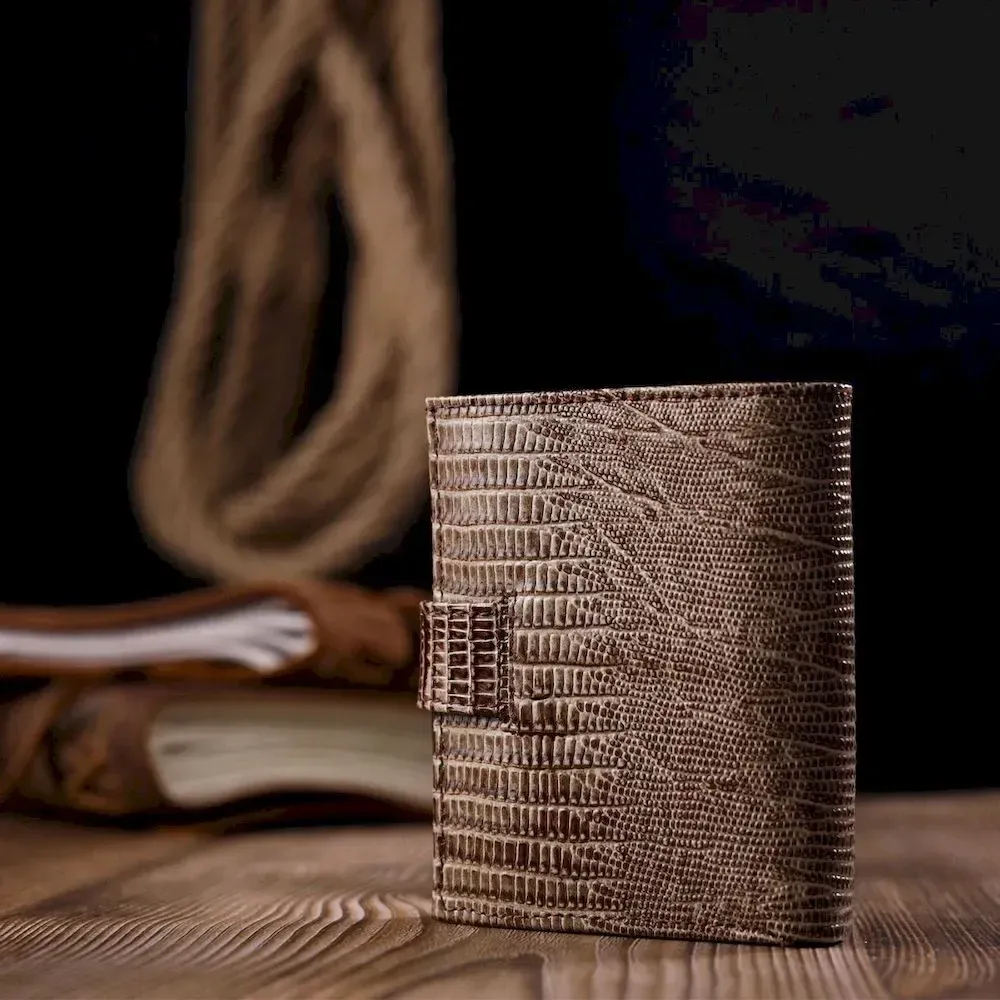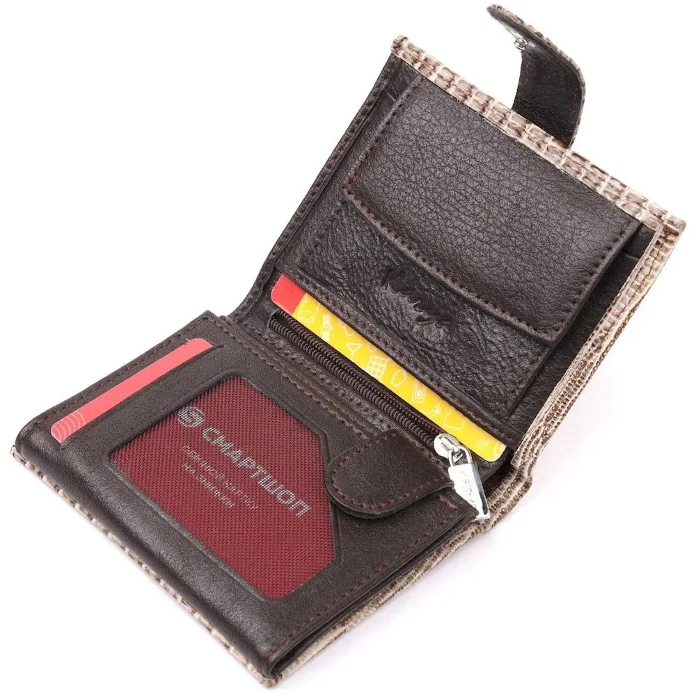 Красивый мужской кошелек из натуральной кожи с тиснением под рептилию, в красивом бежевом цвете. Особенностью данного аксессуара есть наличие блока для кредитных карточек, что закрывается хлястиком на кнопку. Изделия закрывается на хлястик с кнопкой. На лицевой стороне в виде декора расположен металлический логотип производителя. Аксессуар упакован в фирменную коробочку. Изделия из натуральной кожи всегда будут отличным подарком для близкого человека.