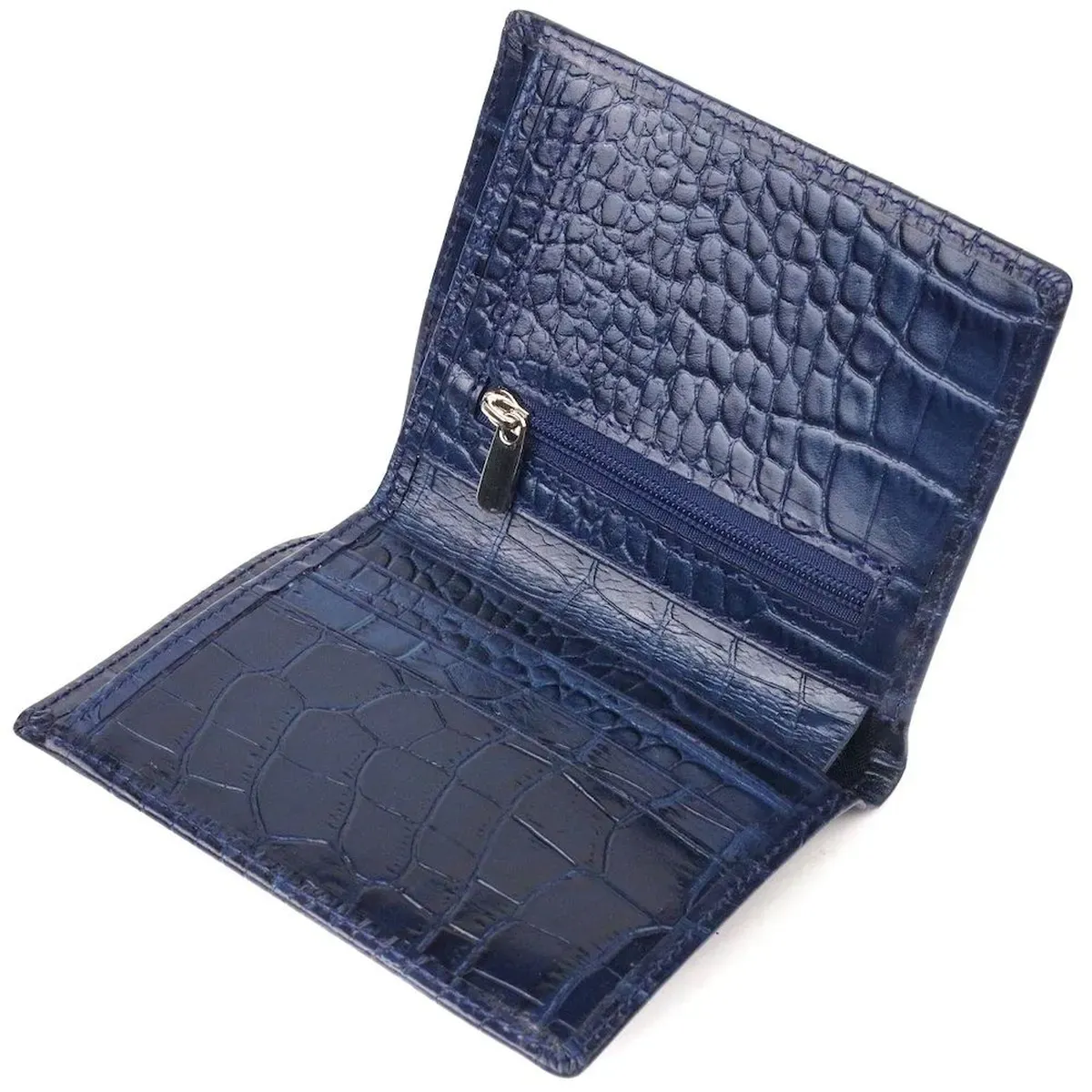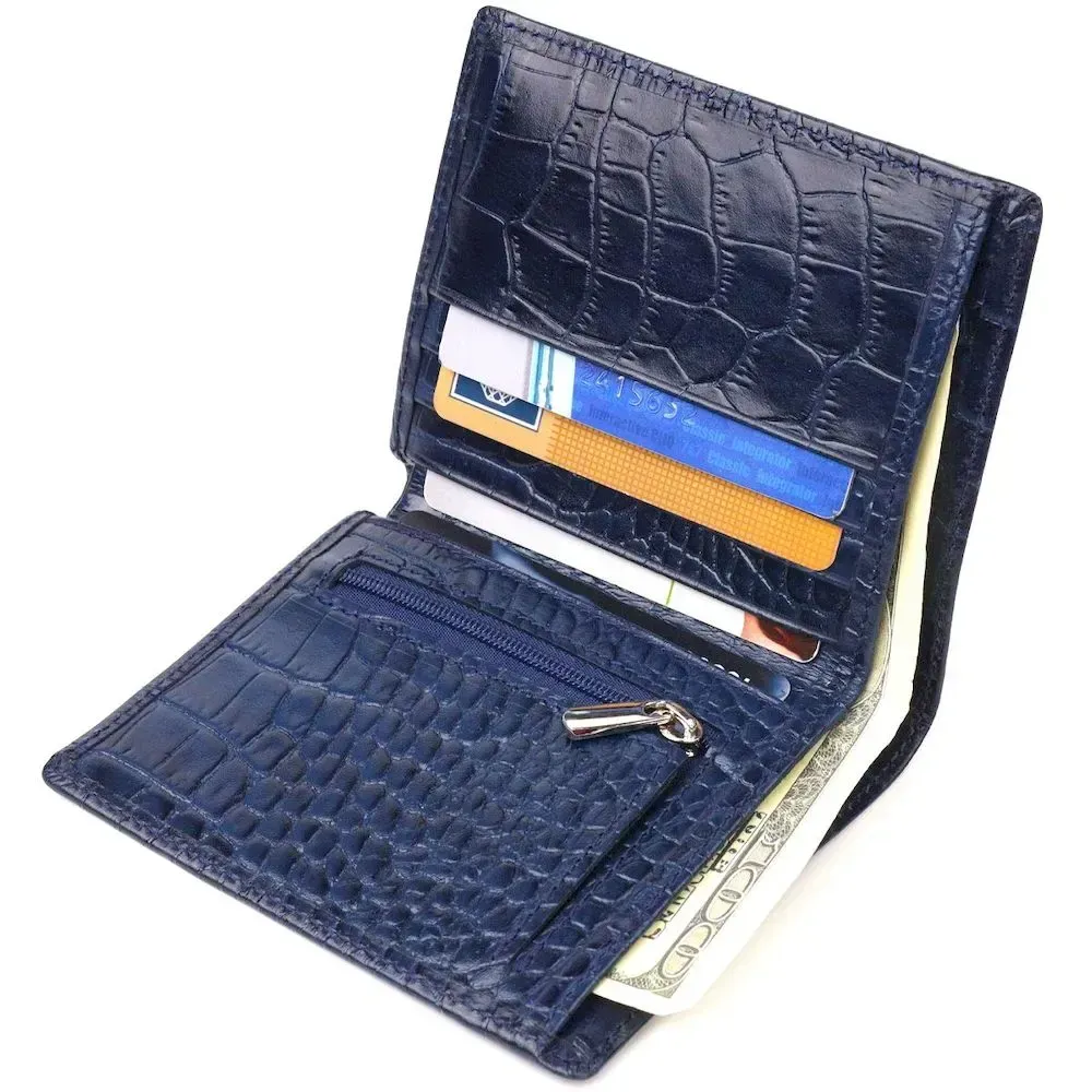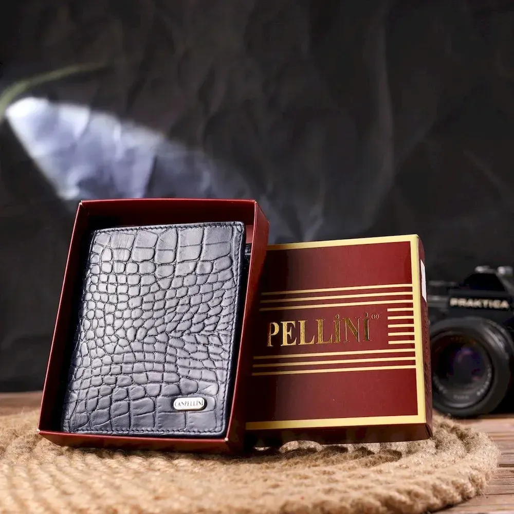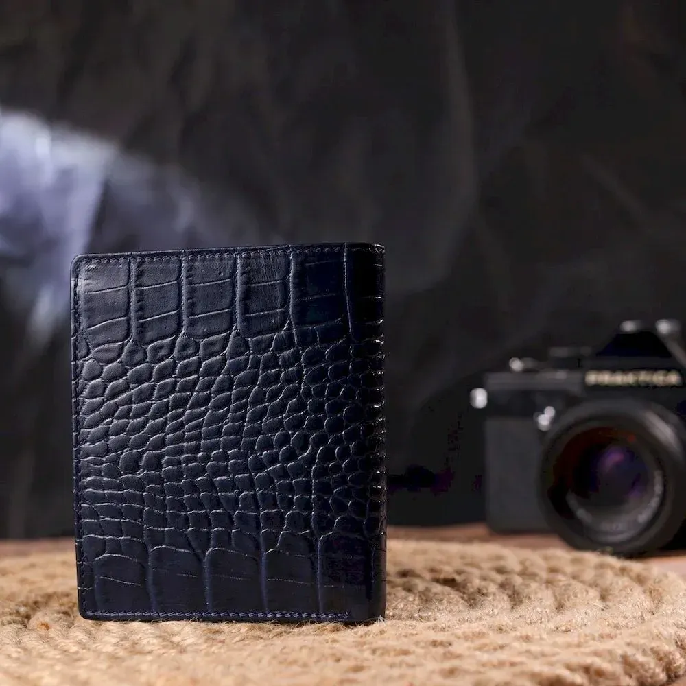 Красивое мужское портмоне, из натуральной фактурной кожи, с тиснением под крокодила. Аксессуар имеет одно основное отделение, с перегородкой, в которое помещаются купюры всех номиналов, три отсека для карточек, монетницу на молнии с расширителем, два прилегающих кармана. На внешней стороне, металлический логотип производителя. Цвет фурнитуры – серебро. Кожаный кошелек является действительно нужными практичным подарком.